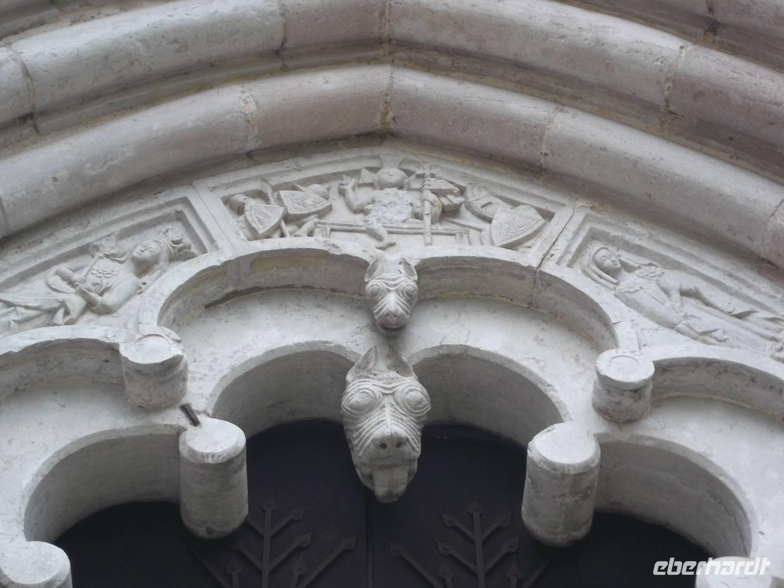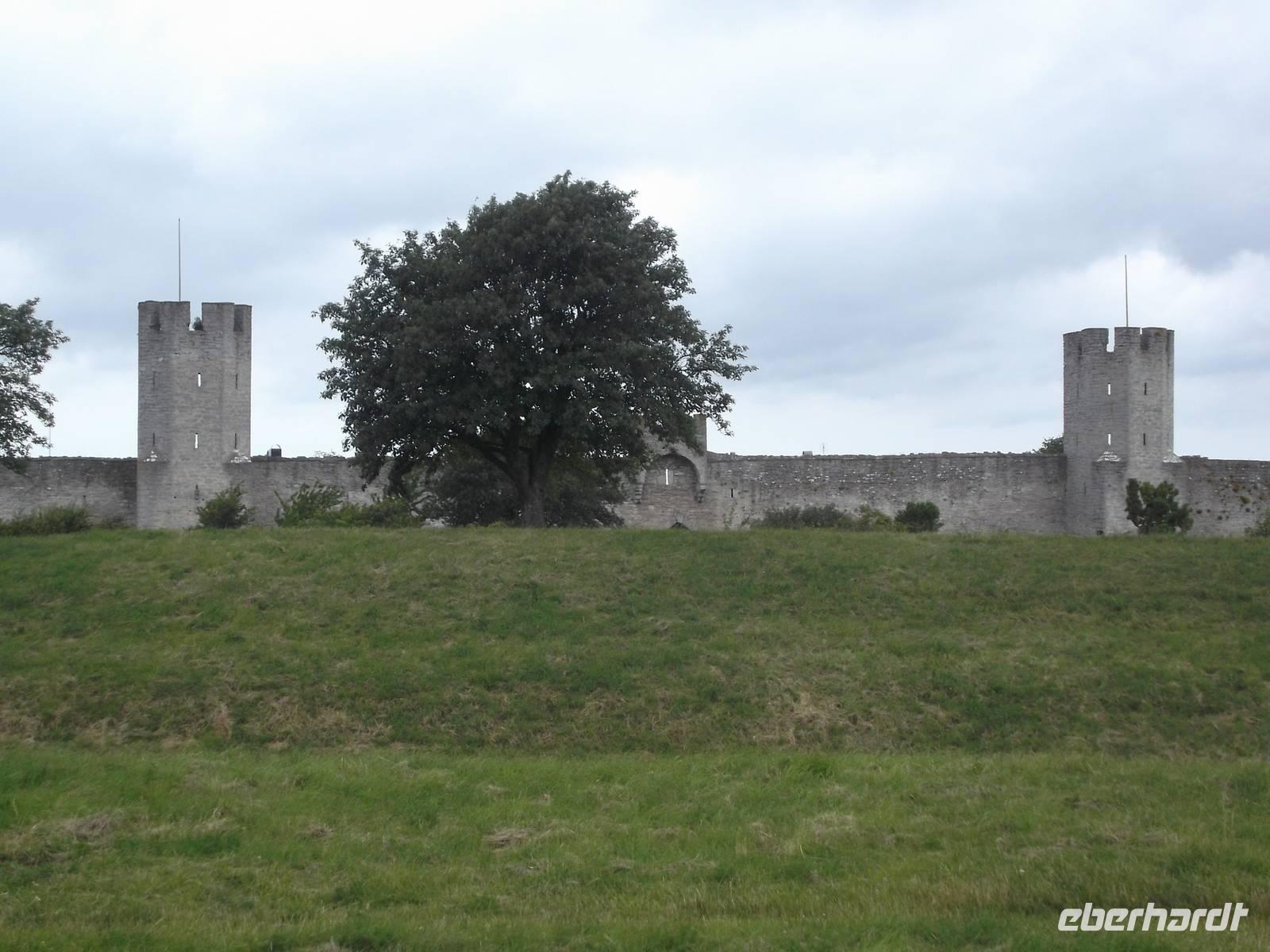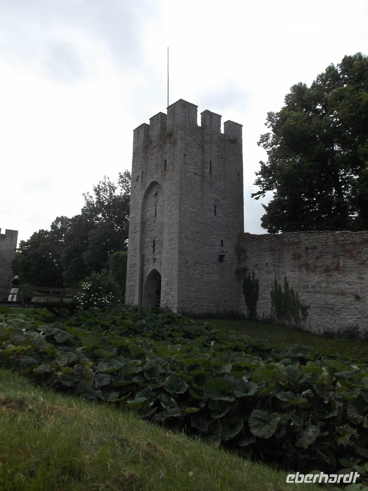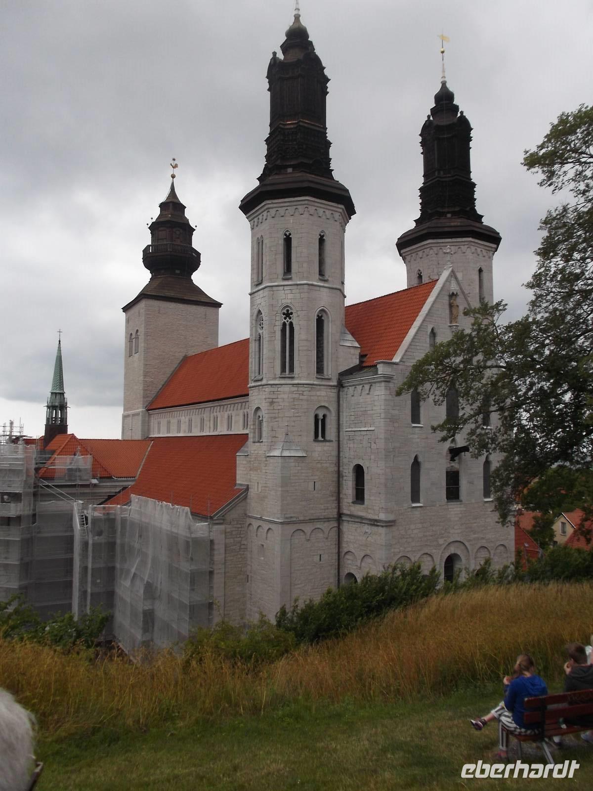 Auf dem Weg zurück hielten wir an einer der interessantesten historischen Kirchen von Gotland. Angeblich soll es 92 auf der großen Insel geben und sehr interessant sind wohl die meisten von ihnen. Die Kirche von Bunge aus dem 14. Jh. zeigt noch die alte Tradition der Wehrkirchen - ohne Fenster an der als für Böses besonders anfällig geglaubten Nordseite - und im Inneren wundervolle Wandmalereien aus der Erbauer-Zeit. Nicht allzuweit von hier konnten wir an einem Aussichtspunkt über die Bogevik-Buch und zur Halbinsel Asunden den Anblick der wie Schären vorgelagerten Inselchen genießen oder unsere Aufmerksamkeit einem Lotsenhäuschen oder der davor stehenden steinernen Windmühle widmen. In Sichtweite lag auch das Städtchen Slite, bekannt für seine Kalkbrüche und das größte Zementwerk Schwedens. Unweit von der imponierenden Fabrikanlage konnten wir einen Blick in einen der gewaltigen Steinbrüche werfen, aus denen das Material für die bedeutende Zementproduktion stammt. Überhaupt liegt die Insel Gotland - mit ihren gut 3000 km² zweitgrößte Insel in der Ostsee - wie ein gewaltiger Kalksteinblock weit vor der Küste des ansonsten aus härteren Gesteinen wie Granit bestehenden Schweden. Aus dem haltbaren und dennoch gut zu bearbeiten Gestein sind denn auch die meisten Bauwerke hier - insbesondere die schönen, großen weißgetünchten Kirchen. Eine der größten ist die von Gothem - die auch mit schönen alten Wandmalereien und einem hübschen, sehr alten bemalten Chorgestühl aufwarten kann. Nachdem wir sie besichtigt hatten, gönnten wir uns vor der Rückkehr nach Visby noch einen Abstecher ins Romakloster. Von diesem 1164 gegründeten und später in der Zeit der Reformation zerstörten Zisterzienserkloster sind nur Reste des Kirchen-Langhauses erhalten. Die sind aber nicht nur imposant, sondern strahlen auch ein durchaus noch mittelalterliches Ambiente aus - was man dazu nutzt, um hier im Sommer zusammen mit der umgebenden Natur als herrliche Kulisse für Theaterfestspiele zu dienen. In der Zeit nach Beginn der schwedischen Herrschaft über Gotland nutzte man die Ruine als Steinbruch und verbaute die so gewonnenen Steine im danebenliegenden „Königshof", dem zeitweiligen Amtssitz des schwedischen Statthalters.