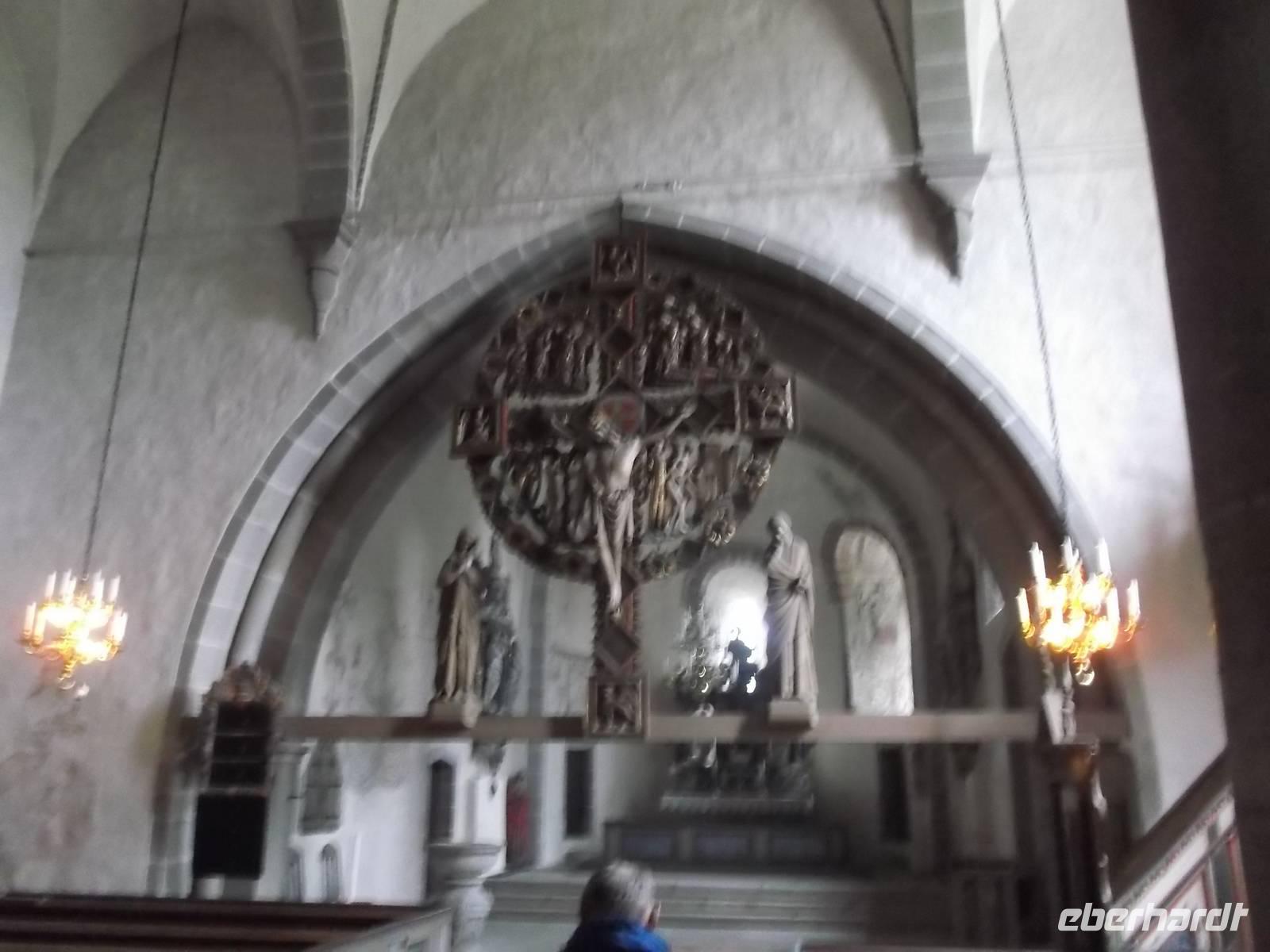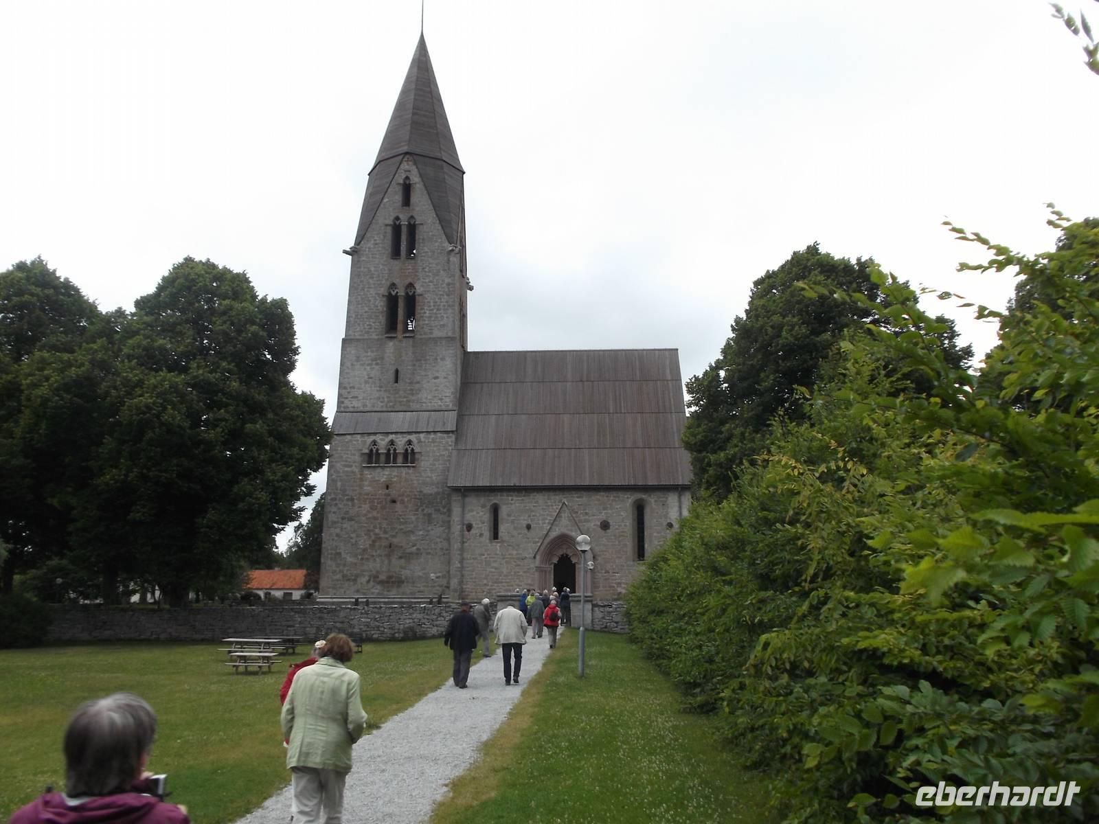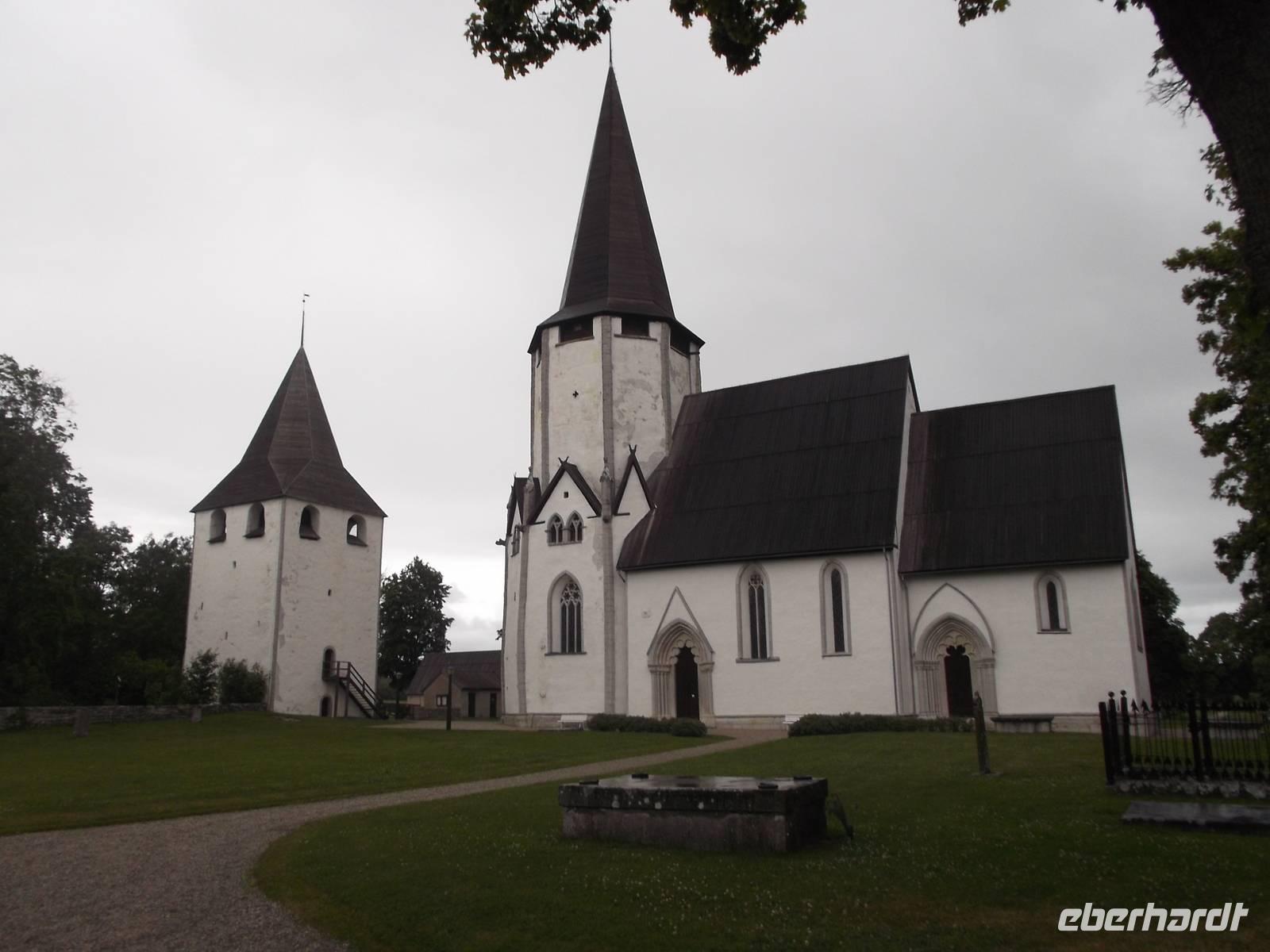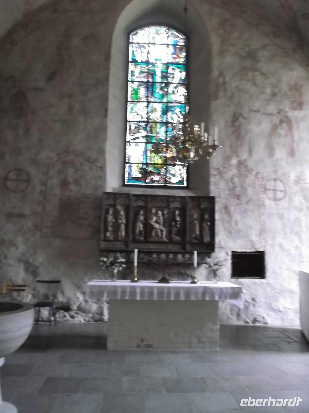Dass es auch im Südteil der Insel schöne Kirchen gibt, lernten wir am Beispiel der uralten, aus dem 13. Jh. stammenden Kirche von Öja mit den davorliegenden wuchtigen Resten einer einstigen „Kastale", eines mächtigen Wehrturmes. Den Innenraum der Kirche beherrscht ein gewaltiges Triumphkreuz aus der Erbauungszeit der Kirche, mit biblischen Szenen und der sehr plastisch gestalteten Figur des gekreuzigten Christus. Es dient als Lettner und trennt die beiden Teile der auch ansonsten beeindruckenden Kirche.