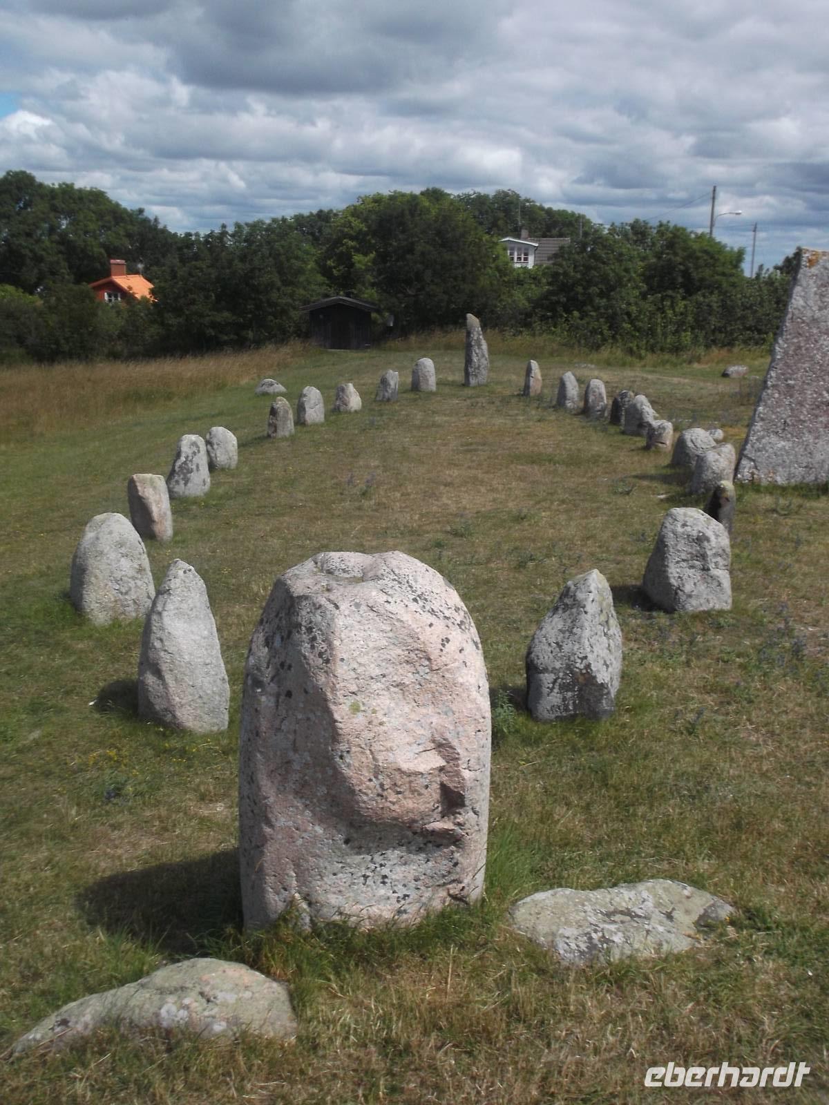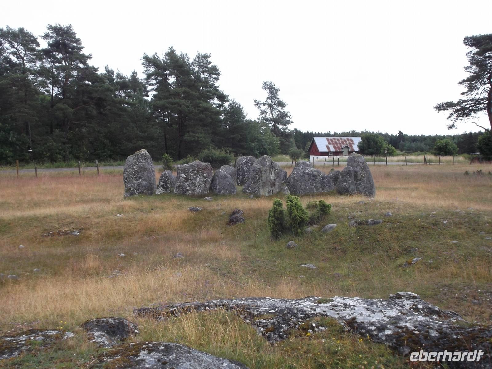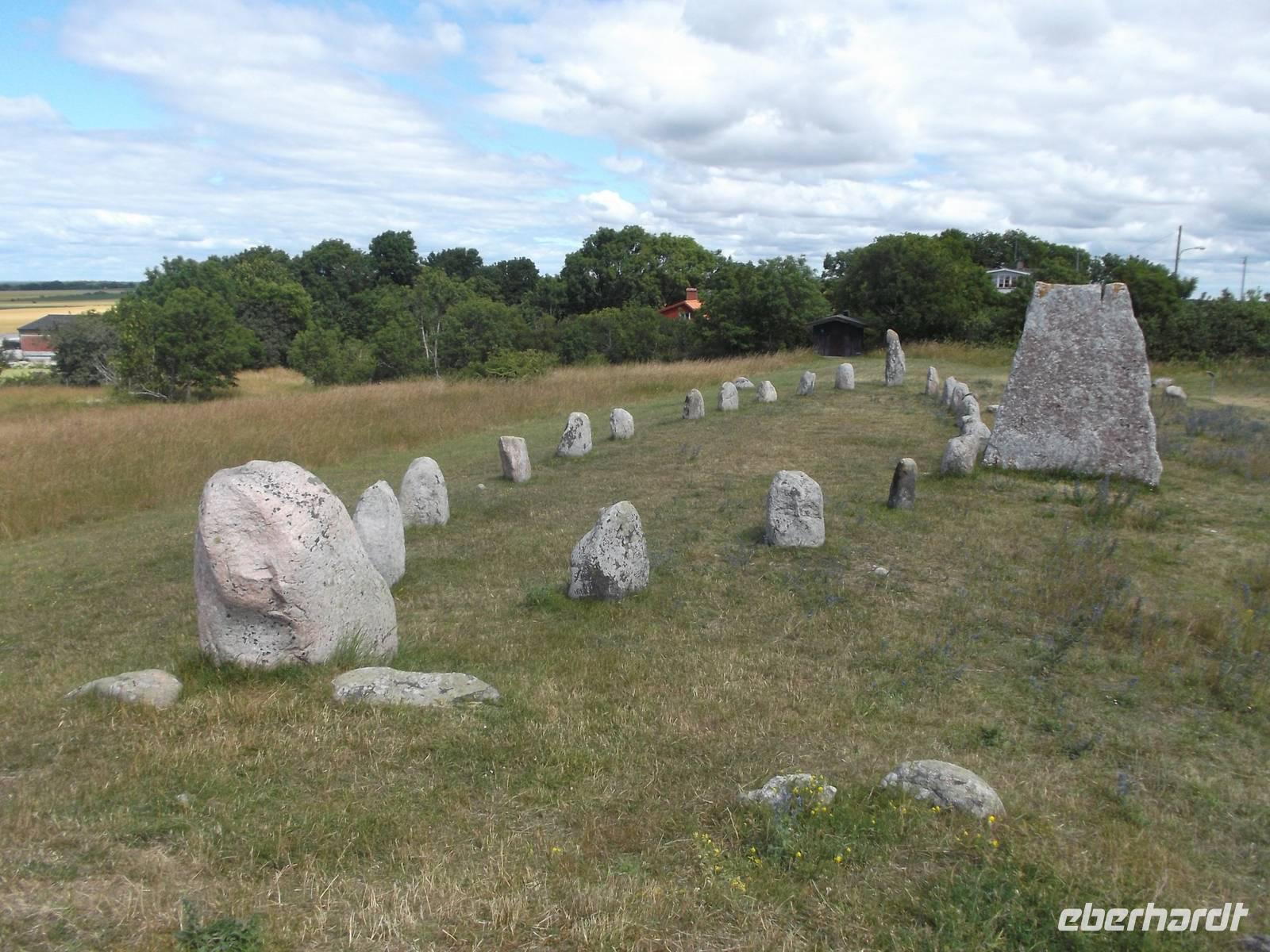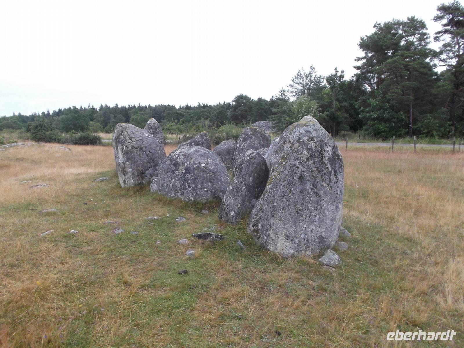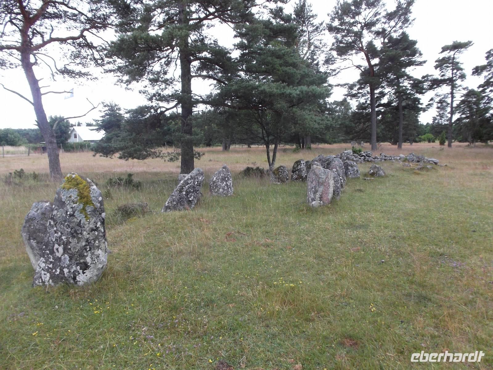 Von hier fuhren wir, weiter an der Küste und dann nicht weit vom Strand aber schon im Wald gelegenen zu einer prähistorischen Kultstätte. Dicht nebeneinander lagen hier ein Dolmen, ein Großsteingrab aus der Jungsteinzeit und eine für die Bronze- und Eisenzeit in Skandinavien typische Begräbnisstätte, eine „Schiffssetzung" aus großen Steinen, die aufrecht stehend die Umrisse eines Schiffes andeuten. 47 Meter lag war die Schiffssetzung von Gnisvärd, die damit die größte ihrer Art in Gotland ist. Auf den schwedischen Inseln und dem Festland gibt es mehrere hundert Kult- und Begräbnisstätten dieser Art.