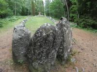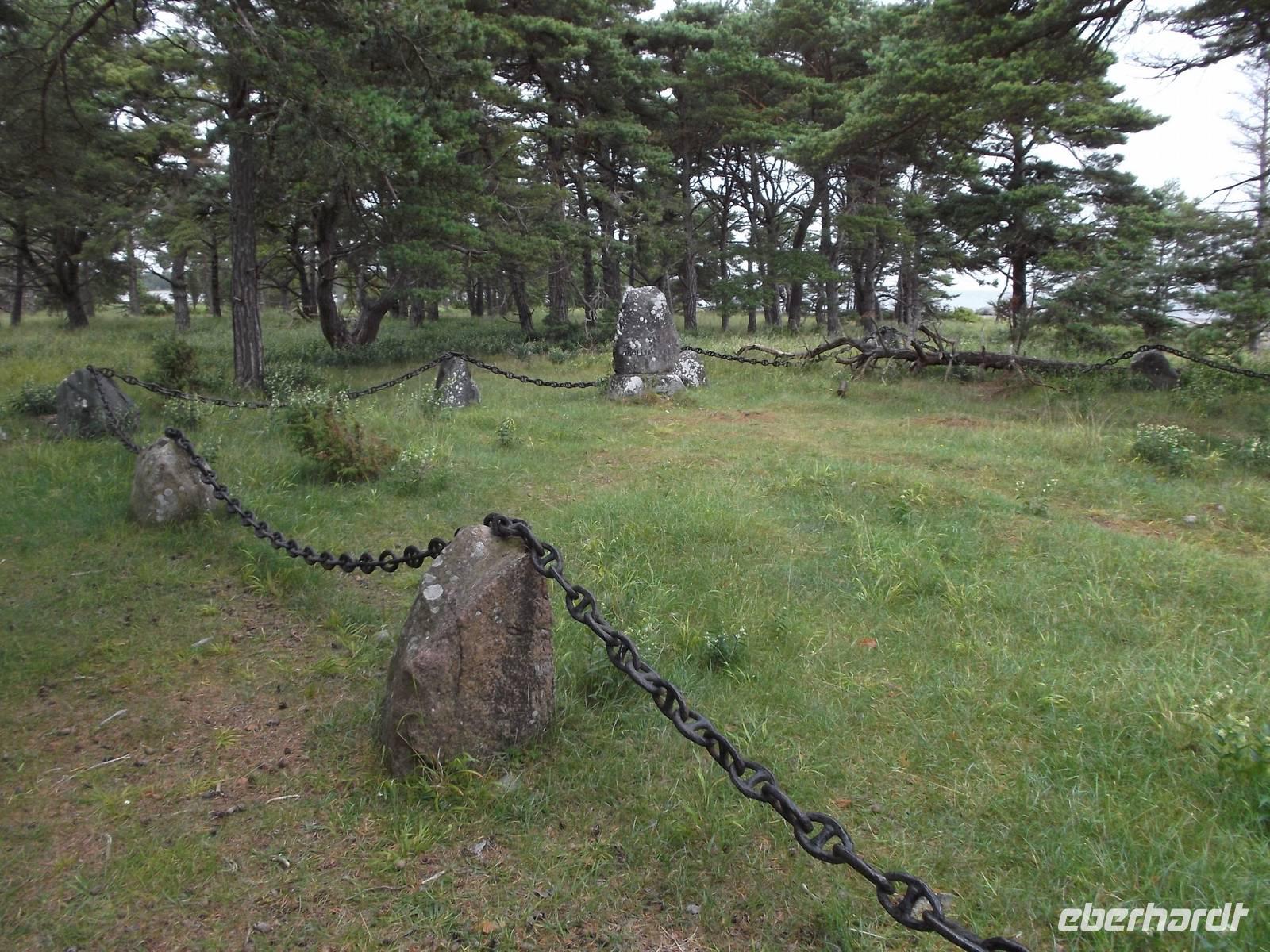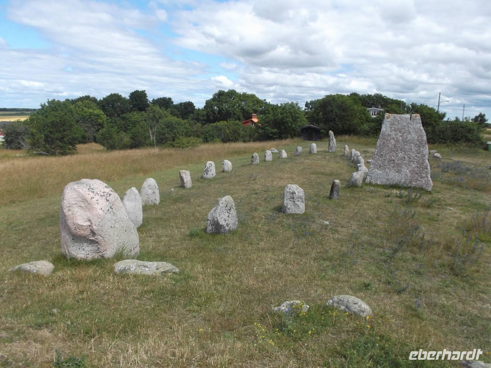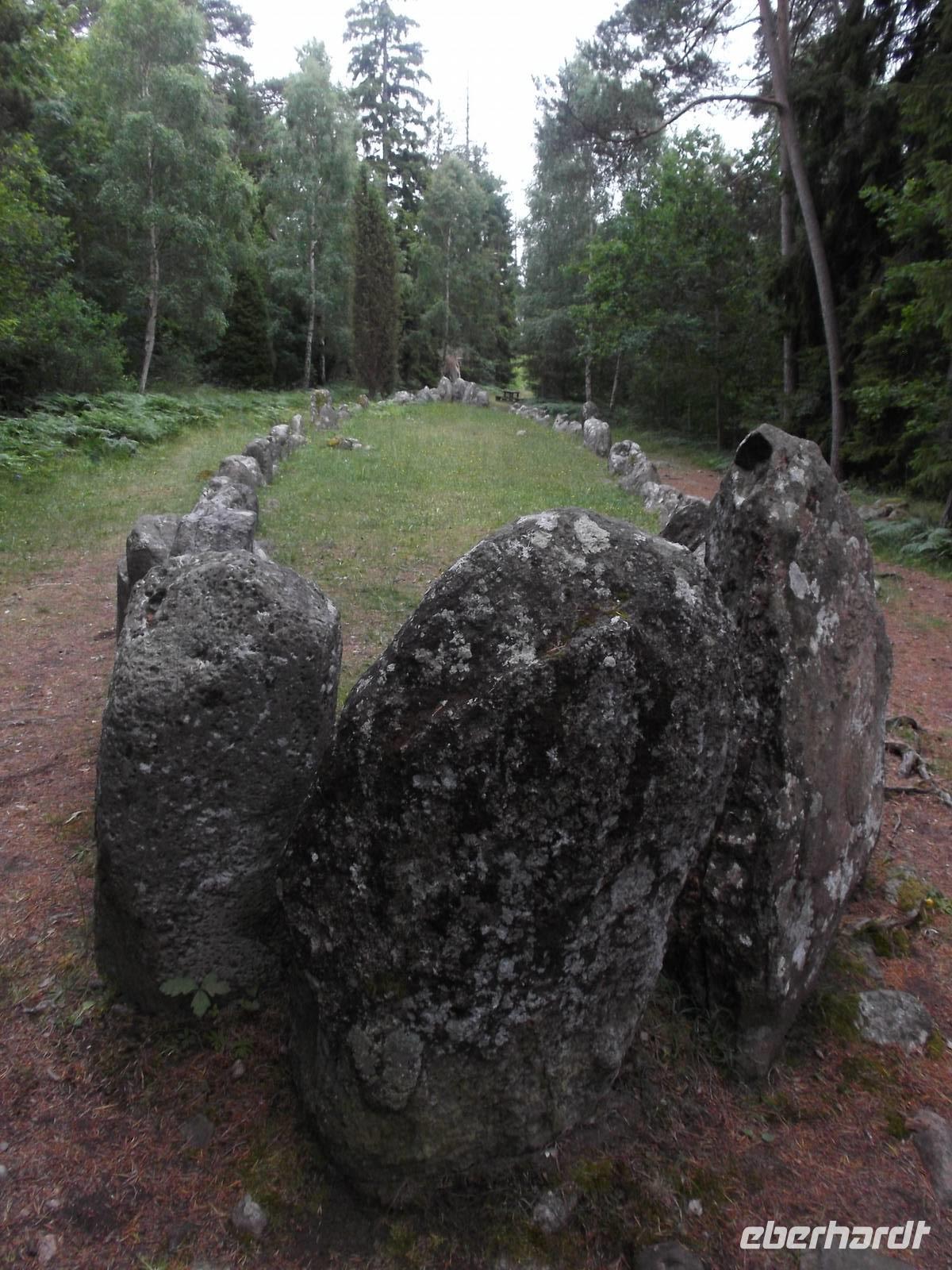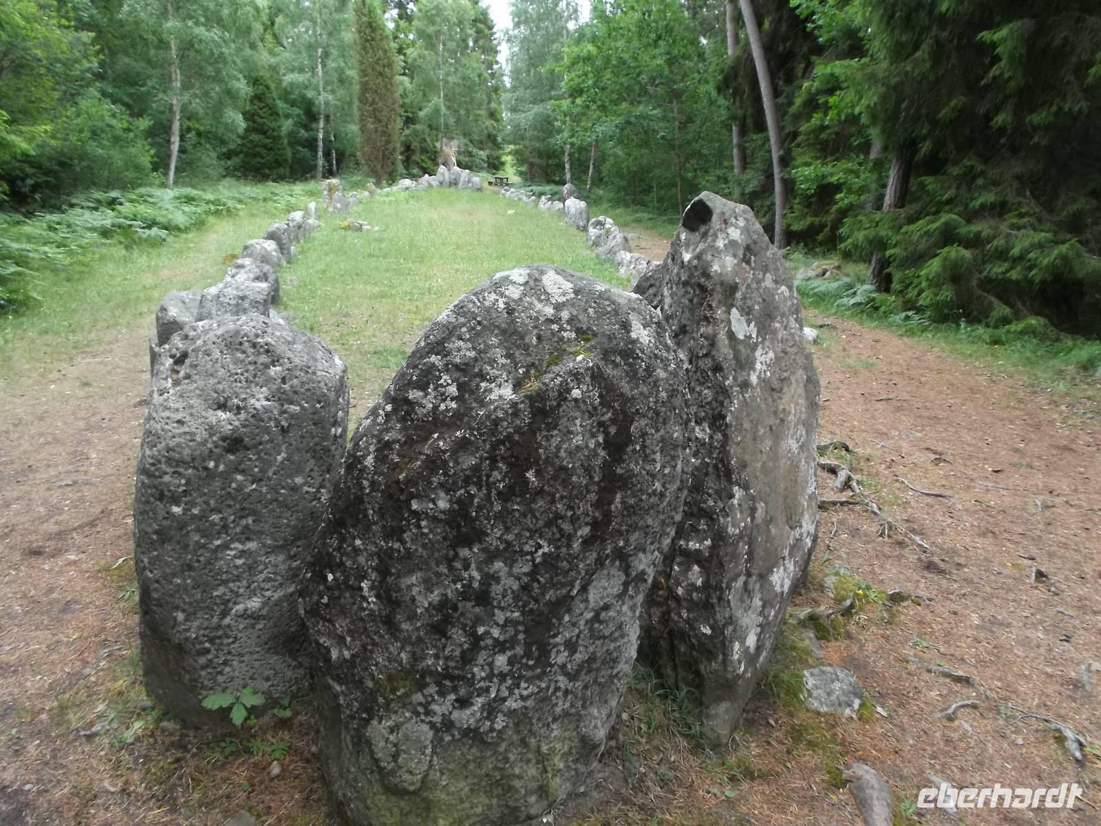 Von hier fuhren wir, weiter an der Küste und dann nicht weit vom Strand aber schon im Wald gelegenen zu einer prähistorischen Kultstätte. Dicht nebeneinander lagen hier ein Dolmen, ein Großsteingrab aus der Jungsteinzeit und eine für die Bronze- und Eisenzeit in Skandinavien typische Begräbnisstätte, eine „Schiffssetzung" aus großen Steinen, die aufrecht stehend die Umrisse eines Schiffes andeuten. 47 Meter lag war die Schiffssetzung von Gnisvärd, die damit die größte ihrer Art in Gotland ist. Auf den schwedischen Inseln und dem Festland gibt es mehrere hundert Kult- und Begräbnisstätten dieser Art.