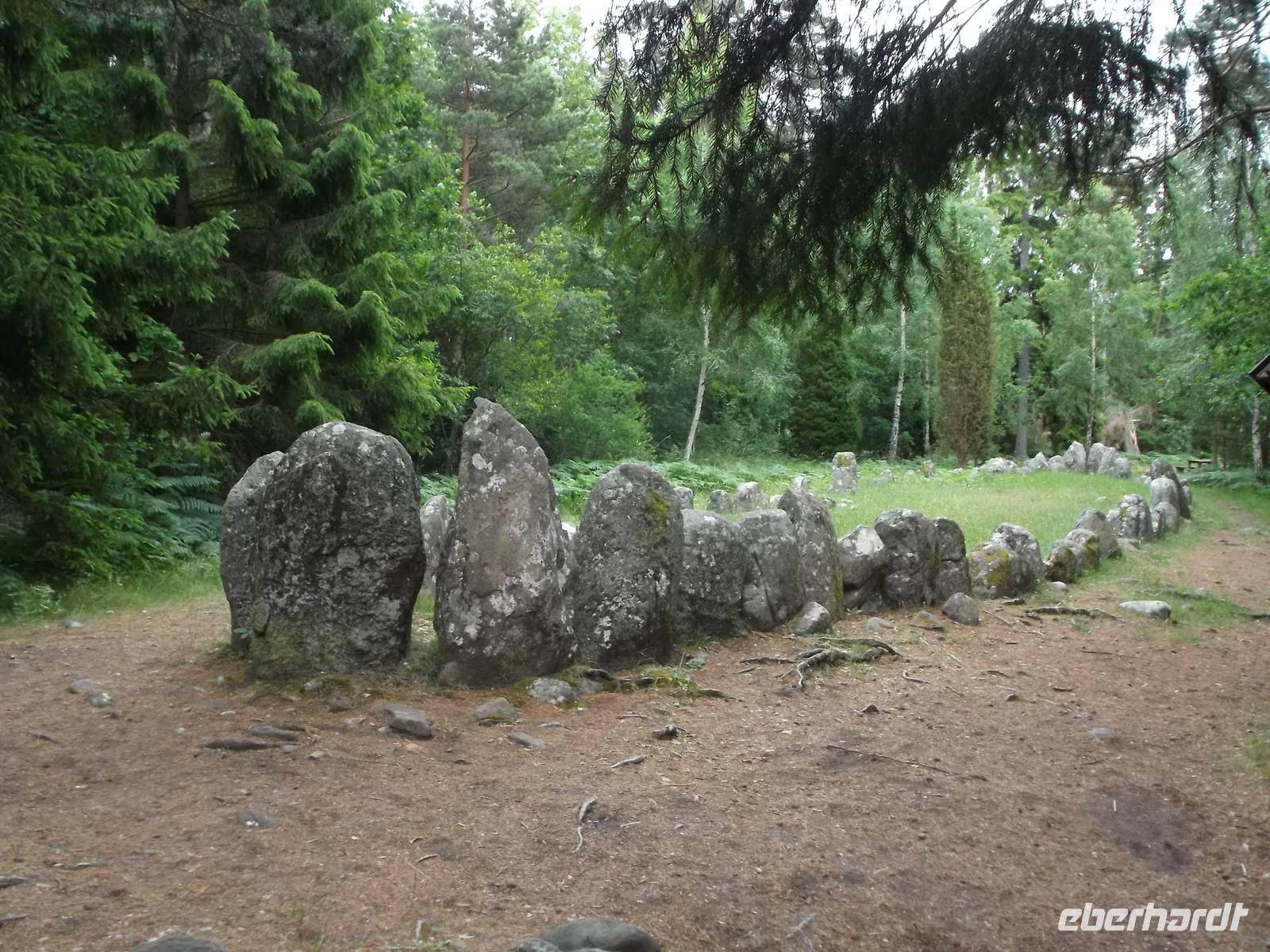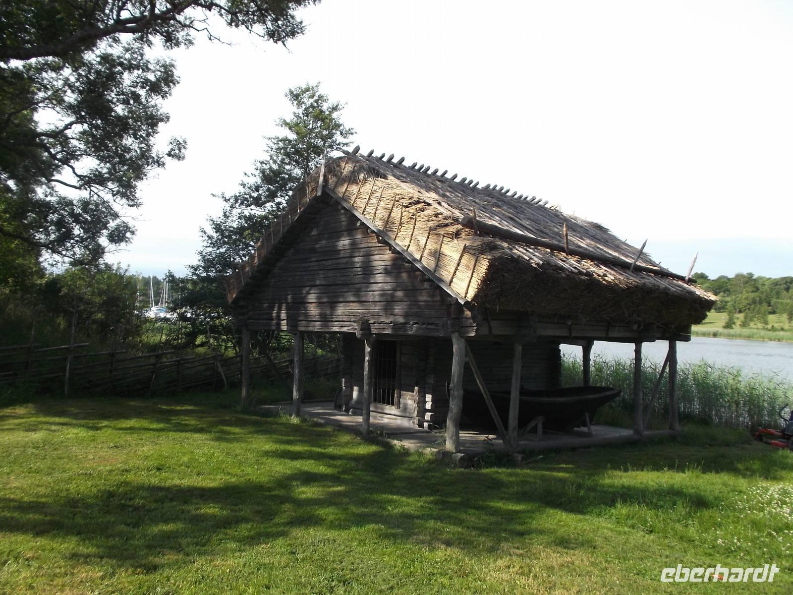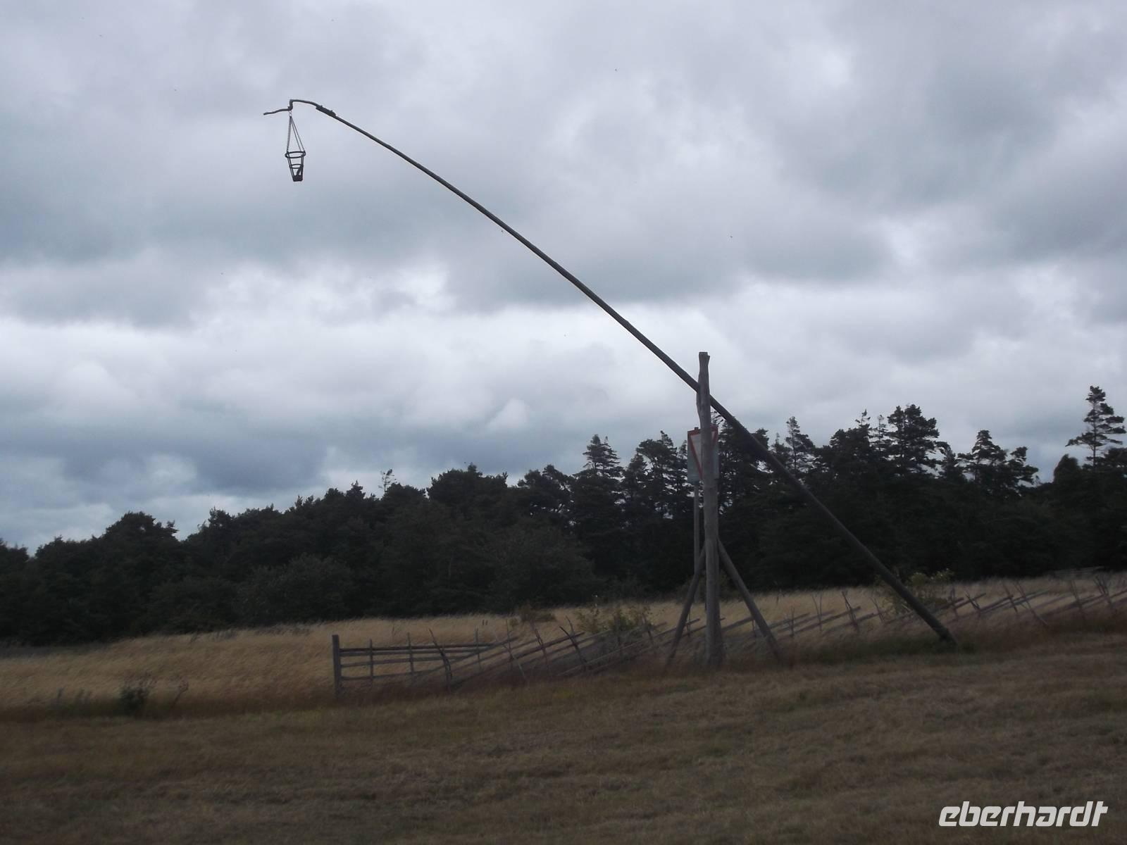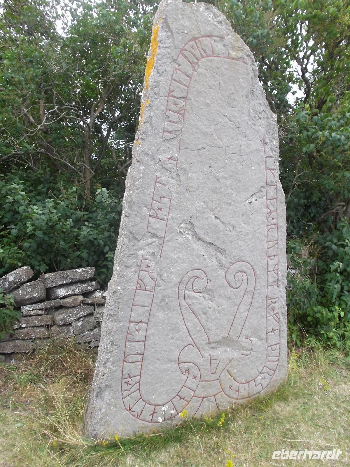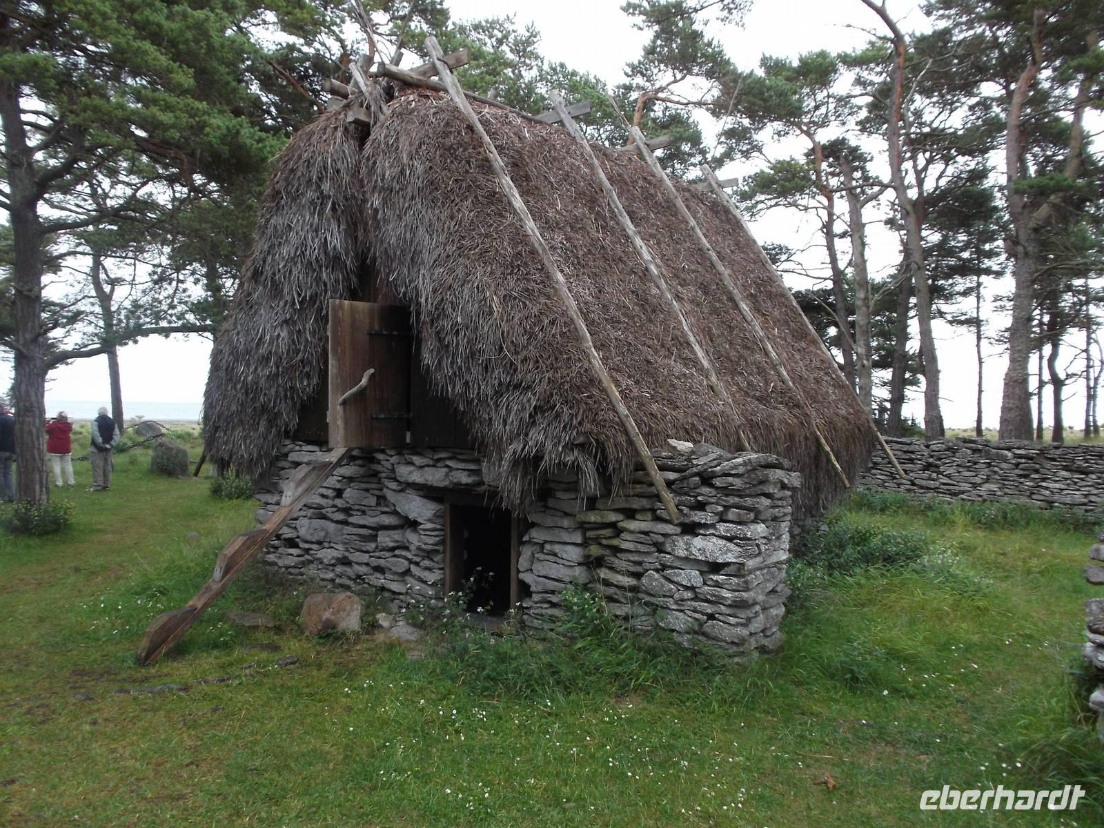 Von hier fuhren wir, weiter an der Küste und dann nicht weit vom Strand aber schon im Wald gelegenen zu einer prähistorischen Kultstätte. Dicht nebeneinander lagen hier ein Dolmen, ein Großsteingrab aus der Jungsteinzeit und eine für die Bronze- und Eisenzeit in Skandinavien typische Begräbnisstätte, eine „Schiffssetzung" aus großen Steinen, die aufrecht stehend die Umrisse eines Schiffes andeuten. 47 Meter lag war die Schiffssetzung von Gnisvärd, die damit die größte ihrer Art in Gotland ist. Auf den schwedischen Inseln und dem Festland gibt es mehrere hundert Kult- und Begräbnisstätten dieser Art.