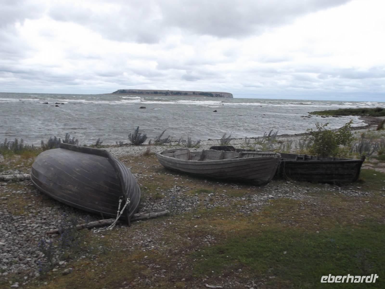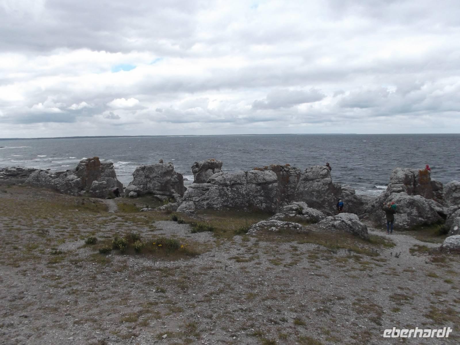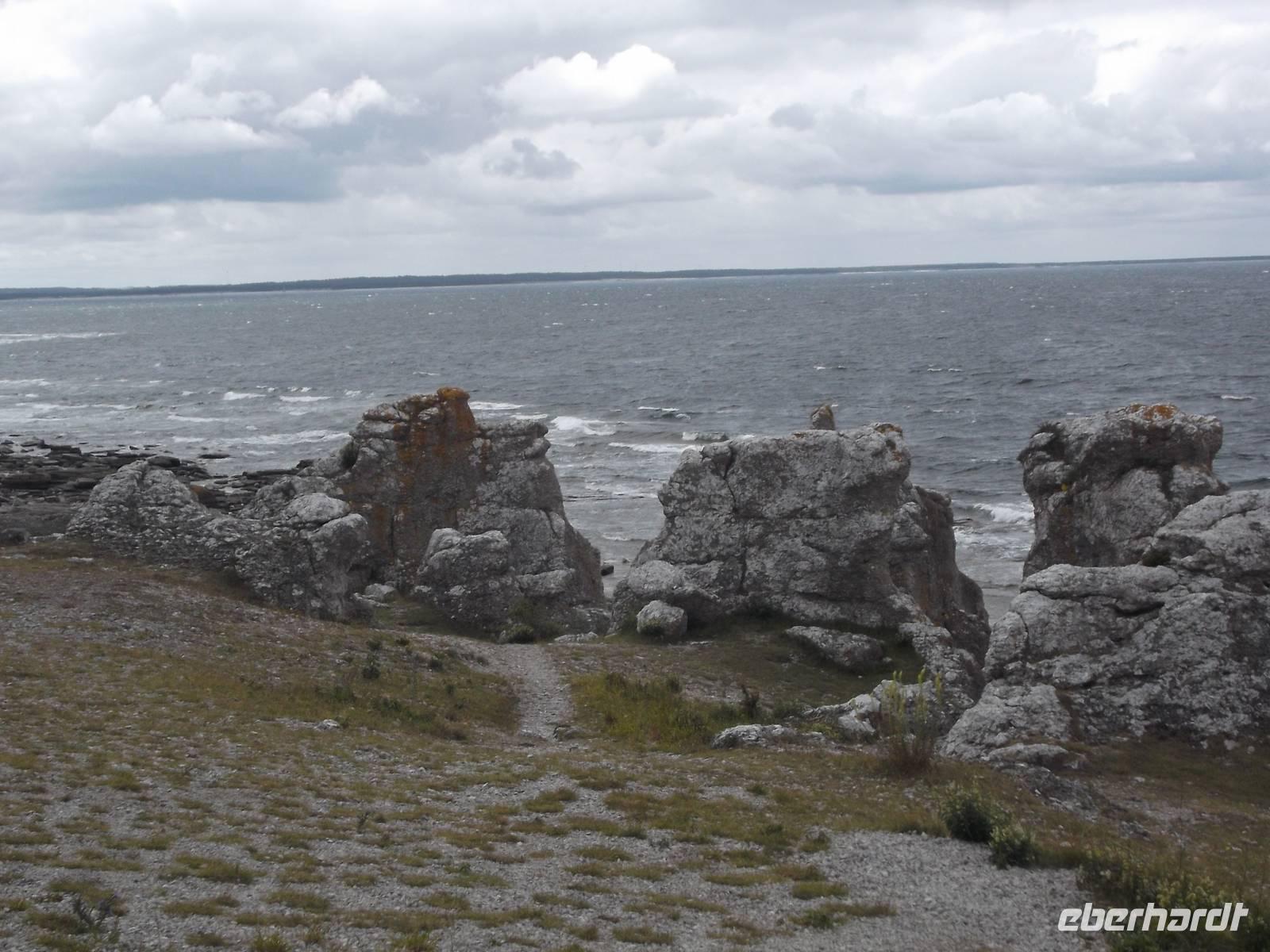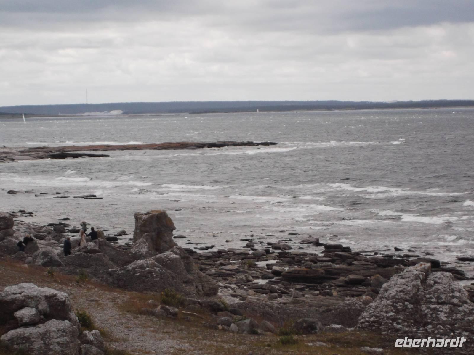 Auf dem weiteren Weg zeigte unser Busfahrer Holger Leich, wie kunstvoll er seinen Bus beherrschte. Auf einer schmalen, direkt am Ufer sich hinschlängelnden Straße hatten wir mitunter das Gefühl, fast auf dem Wasser der Ostsee zu fahren, das sich aufgrund des starken Windes gegen den hier flachen Strand warf. Wir machten eine Fotopause in einem ehemaligen Fischerdorf und hatten von Strand einen guten Ausblick über die bewegte See hin zu den Inseln Stora und Lilla Karlsö. Die oben flachen, wie Tafelberge etwa vier Kilometer vom Weststrand Gotlands aus der Ostsee ragenden, Klippen sind bekannte Vogelschutzgebiete.
