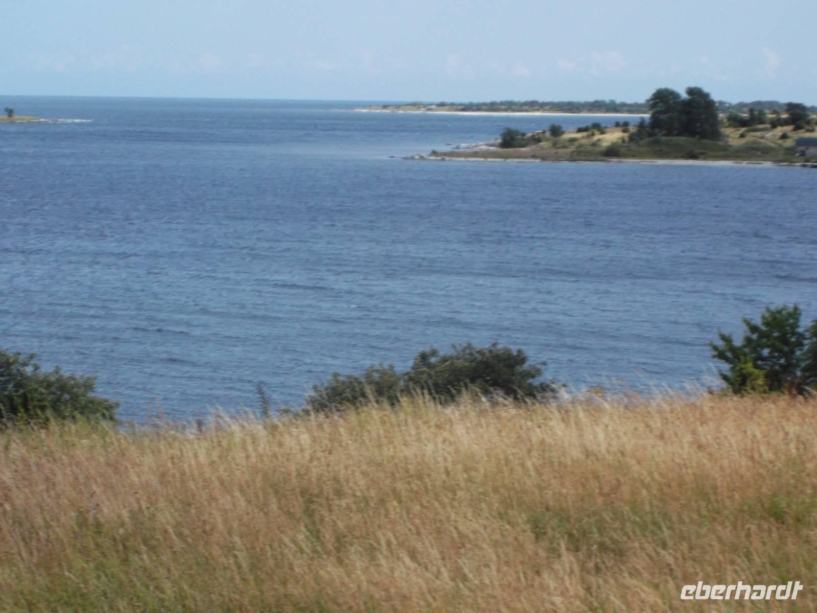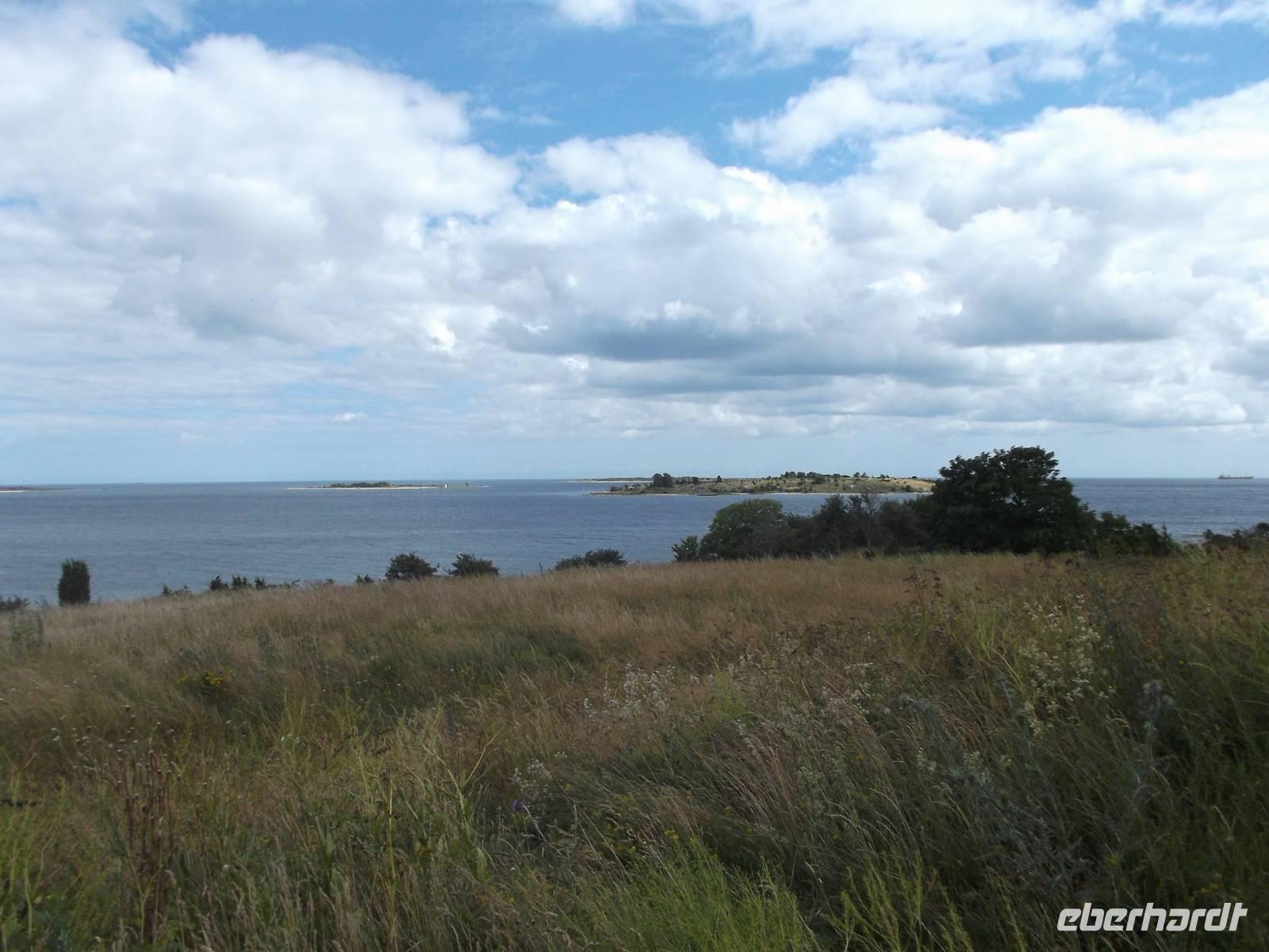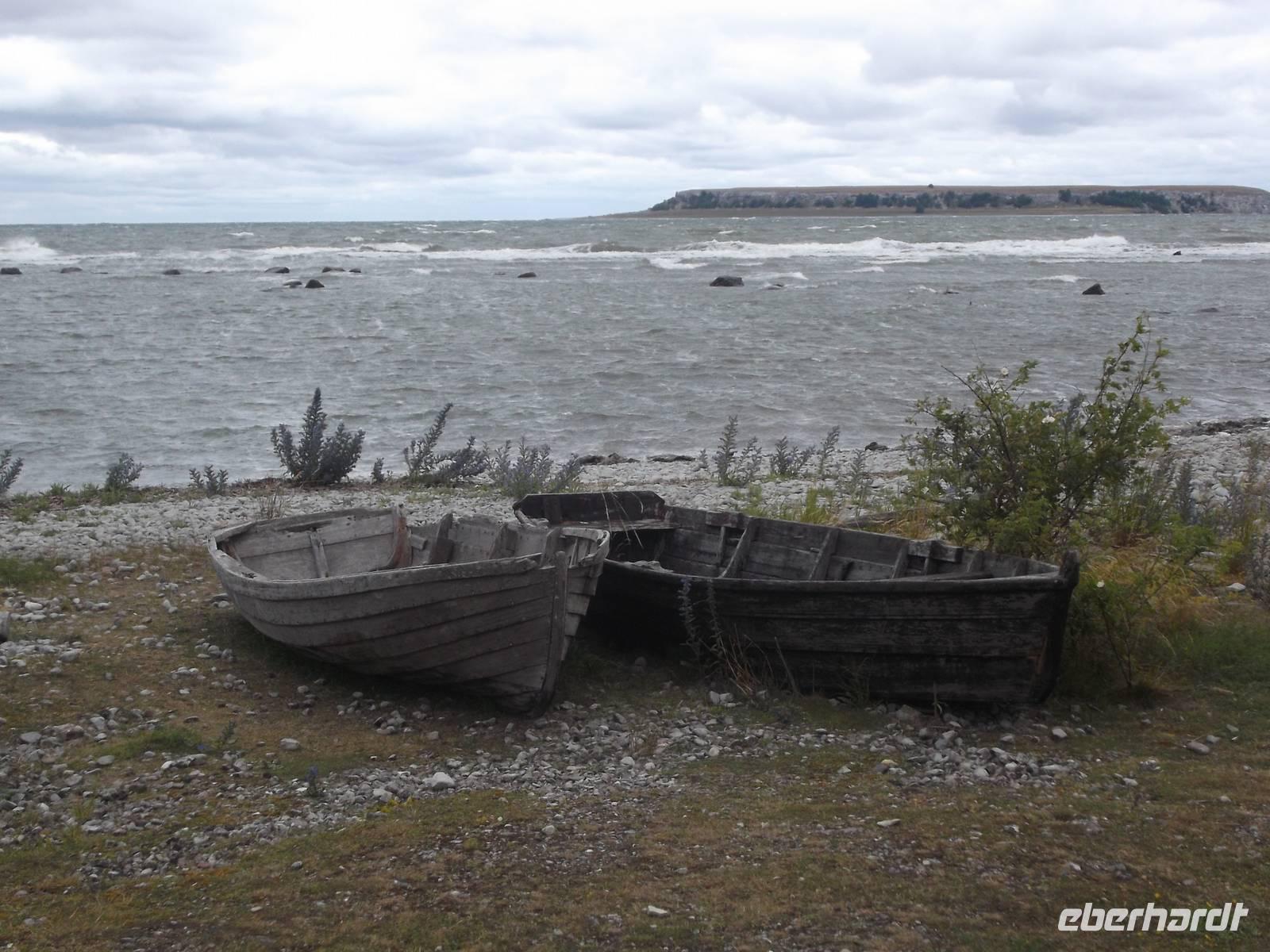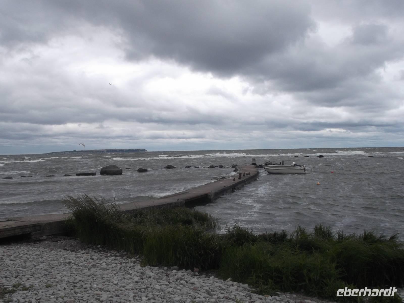 Auf dem weiteren Weg zeigte unser Busfahrer Holger Leich, wie kunstvoll er seinen Bus beherrschte. Auf einer schmalen, direkt am Ufer sich hinschlängelnden Straße hatten wir mitunter das Gefühl, fast auf dem Wasser der Ostsee zu fahren, das sich aufgrund des starken Windes gegen den hier flachen Strand warf. Wir machten eine Fotopause in einem ehemaligen Fischerdorf und hatten von Strand einen guten Ausblick über die bewegte See hin zu den Inseln Stora und Lilla Karlsö. Die oben flachen, wie Tafelberge etwa vier Kilometer vom Weststrand Gotlands aus der Ostsee ragenden, Klippen sind bekannte Vogelschutzgebiete.