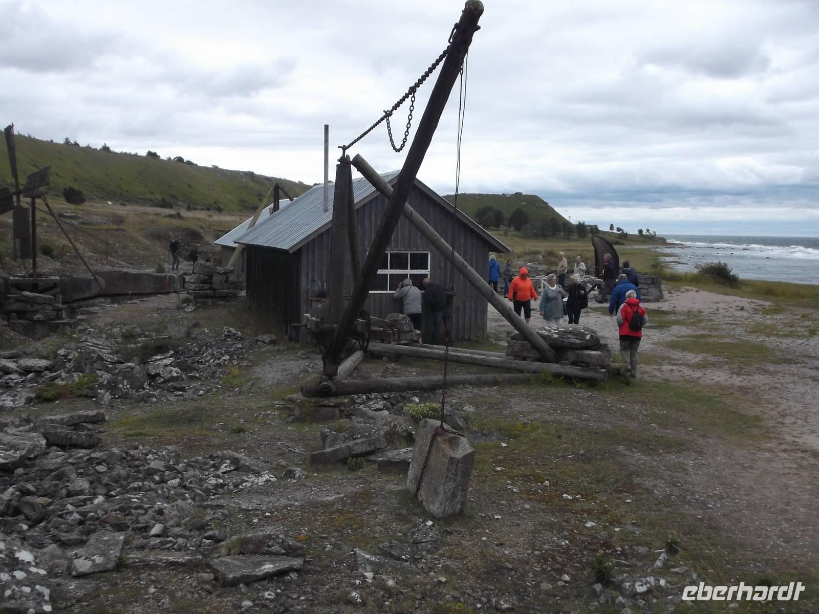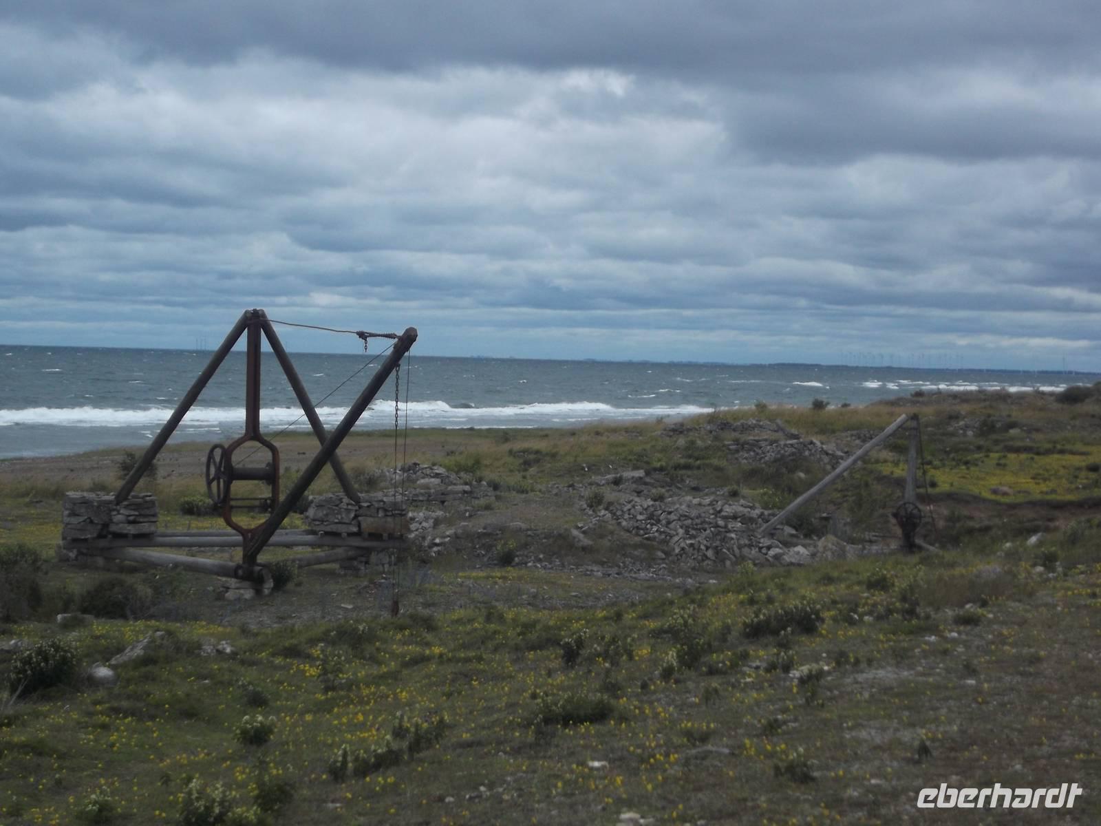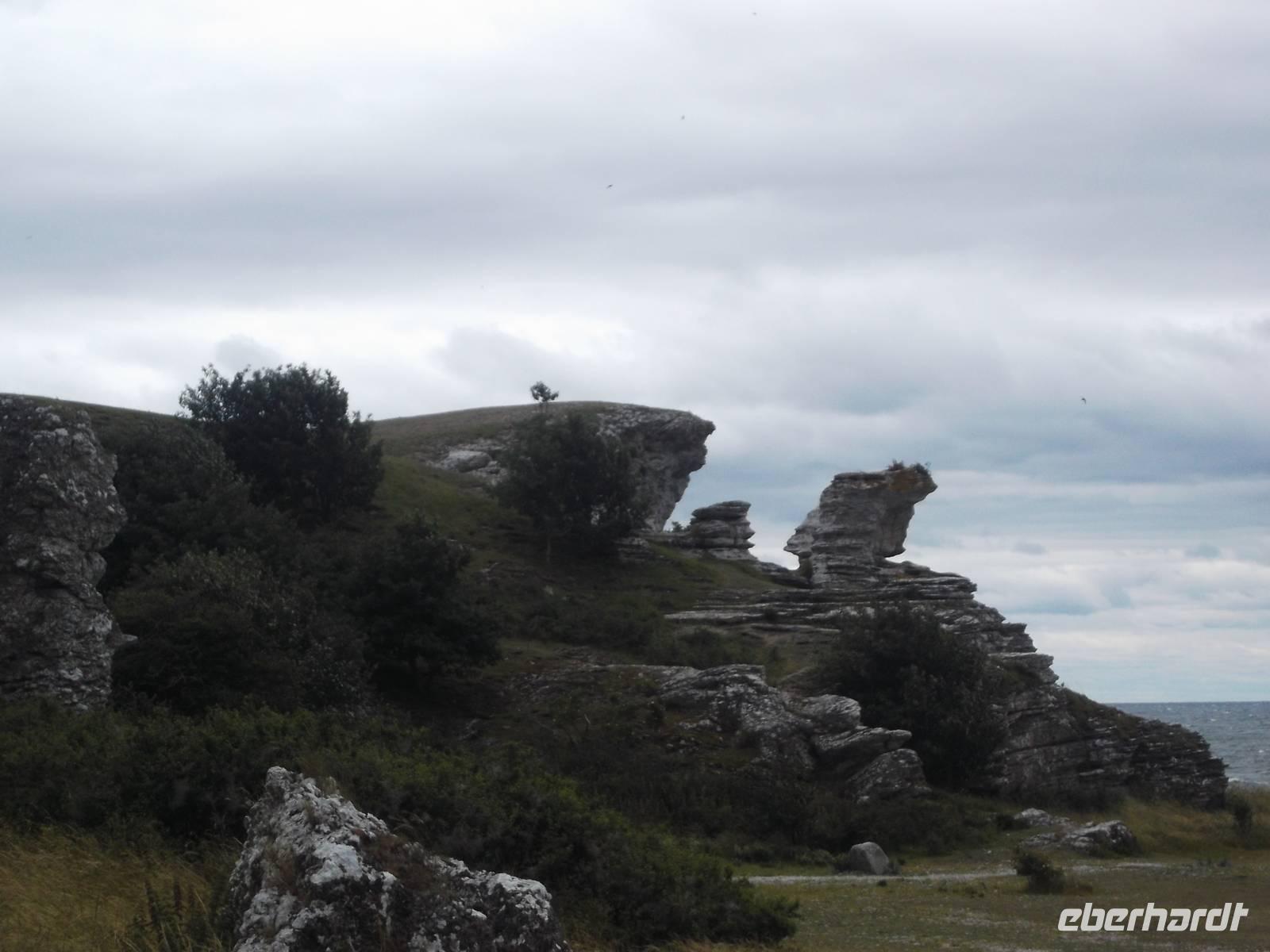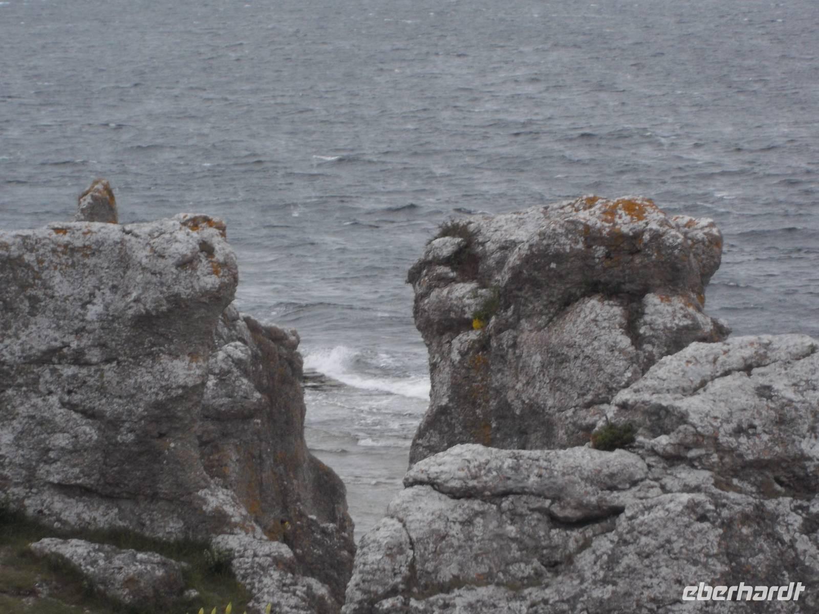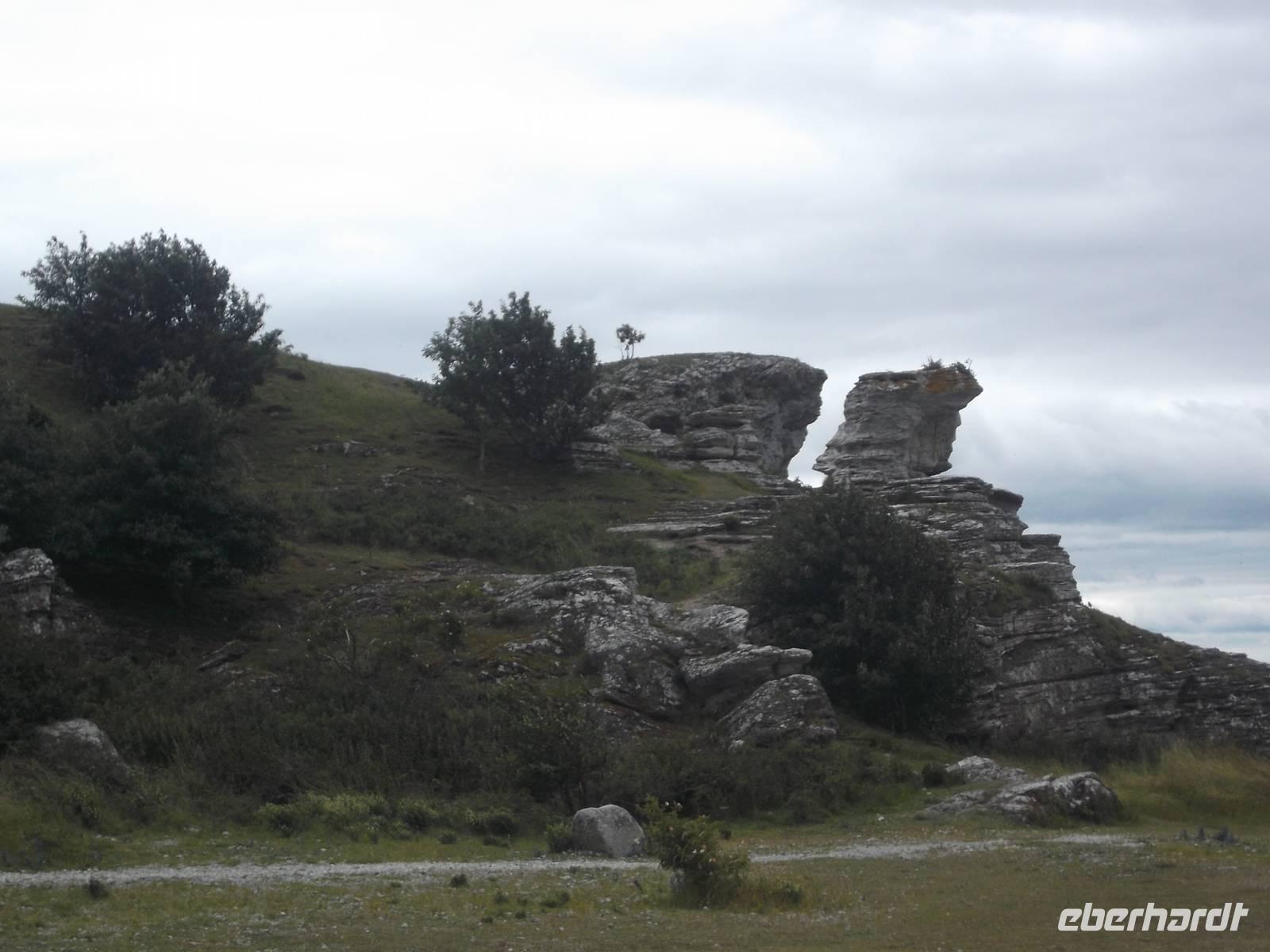 Von hier fuhren wir zur Südspitze der Insel Gotland. Eine „Hoburgen" genannte steile, knapp 40 m hohe Kalkstein-Steilküste zeigt sich hier sehr malerisch, ist aber von Sandsteinschichten durchzogen, die hier früher abgebaut wurden. Wir verweilten kurz am „Steinmuseum", in dem man einen guten Eindruck von den Gegebenheiten des Abbaues von Mühl- und Schleifsteinen gewinnen kann und wo einem die Leistungen der Arbeiter Hochachtung abnötigen: um den außerordentlich scharfen Wind, der auch uns zu schaffen machte, zu trotzen, arbeiteten sie früher im künstlich geschaffenen Windschatten, wozu halbierte ausgediente Fischerboote dienten und schlugen in Handarbeit die Steine aus dem Sandsteinflöz. Nach dem Aufenthalt hier besuchten wir „Hoburgsgubben", den „Alten Mann von Hoburg", einen Rauk mit Gesichtsformen, um den sich hier viele Legenden ranken. Umgeben von kleineren Raukar trotzt er schon seit vielen hundert Jahren dem kalten und heftigen Wind...