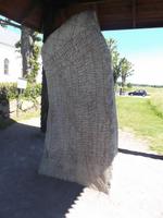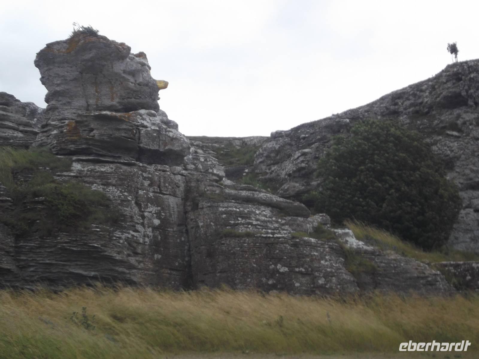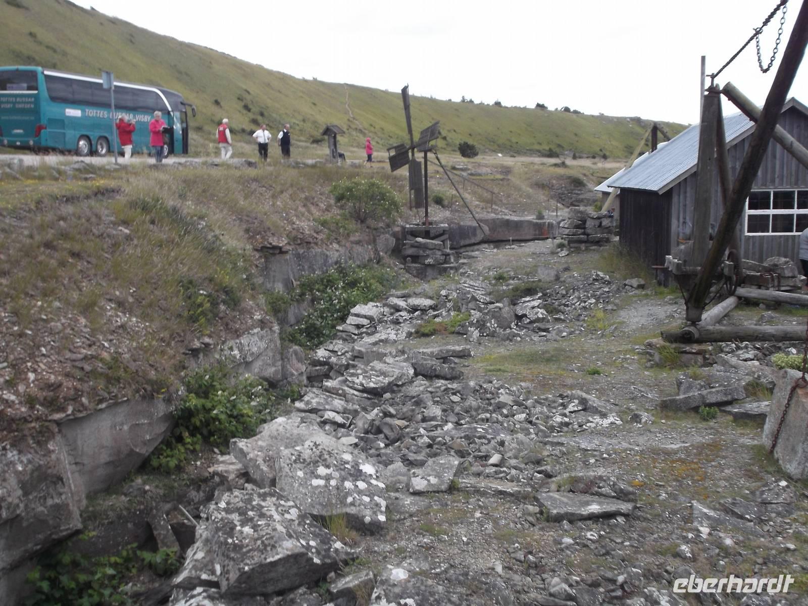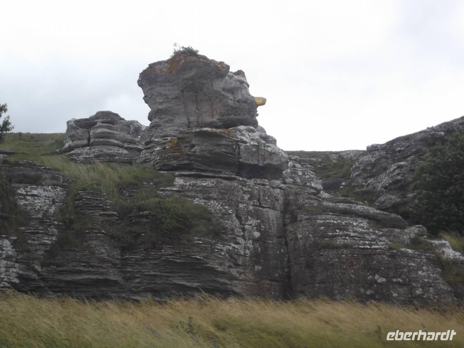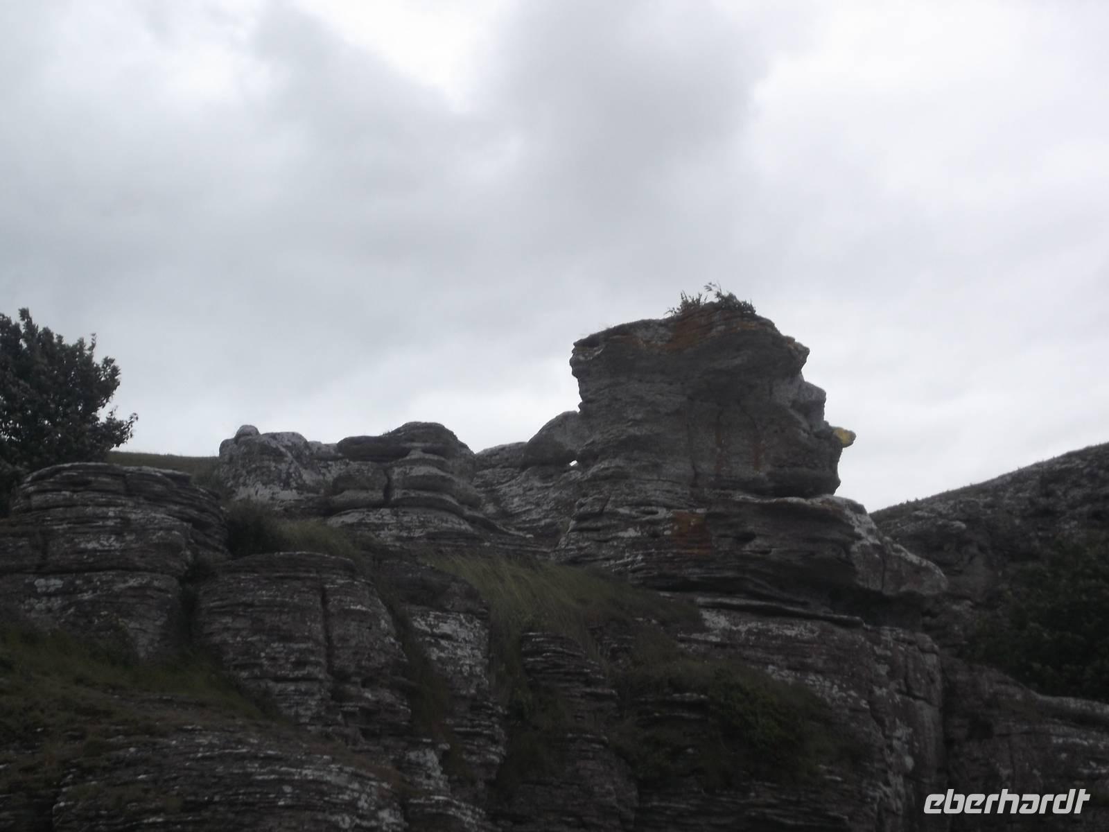 Von hier fuhren wir zur Südspitze der Insel Gotland. Eine „Hoburgen" genannte steile, knapp 40 m hohe Kalkstein-Steilküste zeigt sich hier sehr malerisch, ist aber von Sandsteinschichten durchzogen, die hier früher abgebaut wurden. Wir verweilten kurz am „Steinmuseum", in dem man einen guten Eindruck von den Gegebenheiten des Abbaues von Mühl- und Schleifsteinen gewinnen kann und wo einem die Leistungen der Arbeiter Hochachtung abnötigen: um den außerordentlich scharfen Wind, der auch uns zu schaffen machte, zu trotzen, arbeiteten sie früher im künstlich geschaffenen Windschatten, wozu halbierte ausgediente Fischerboote dienten und schlugen in Handarbeit die Steine aus dem Sandsteinflöz. Nach dem Aufenthalt hier besuchten wir „Hoburgsgubben", den „Alten Mann von Hoburg", einen Rauk mit Gesichtsformen, um den sich hier viele Legenden ranken. Umgeben von kleineren Raukar trotzt er schon seit vielen hundert Jahren dem kalten und heftigen Wind...