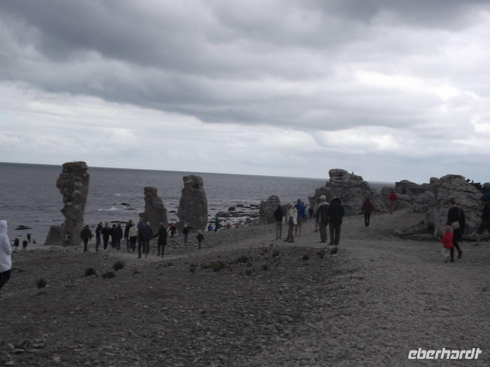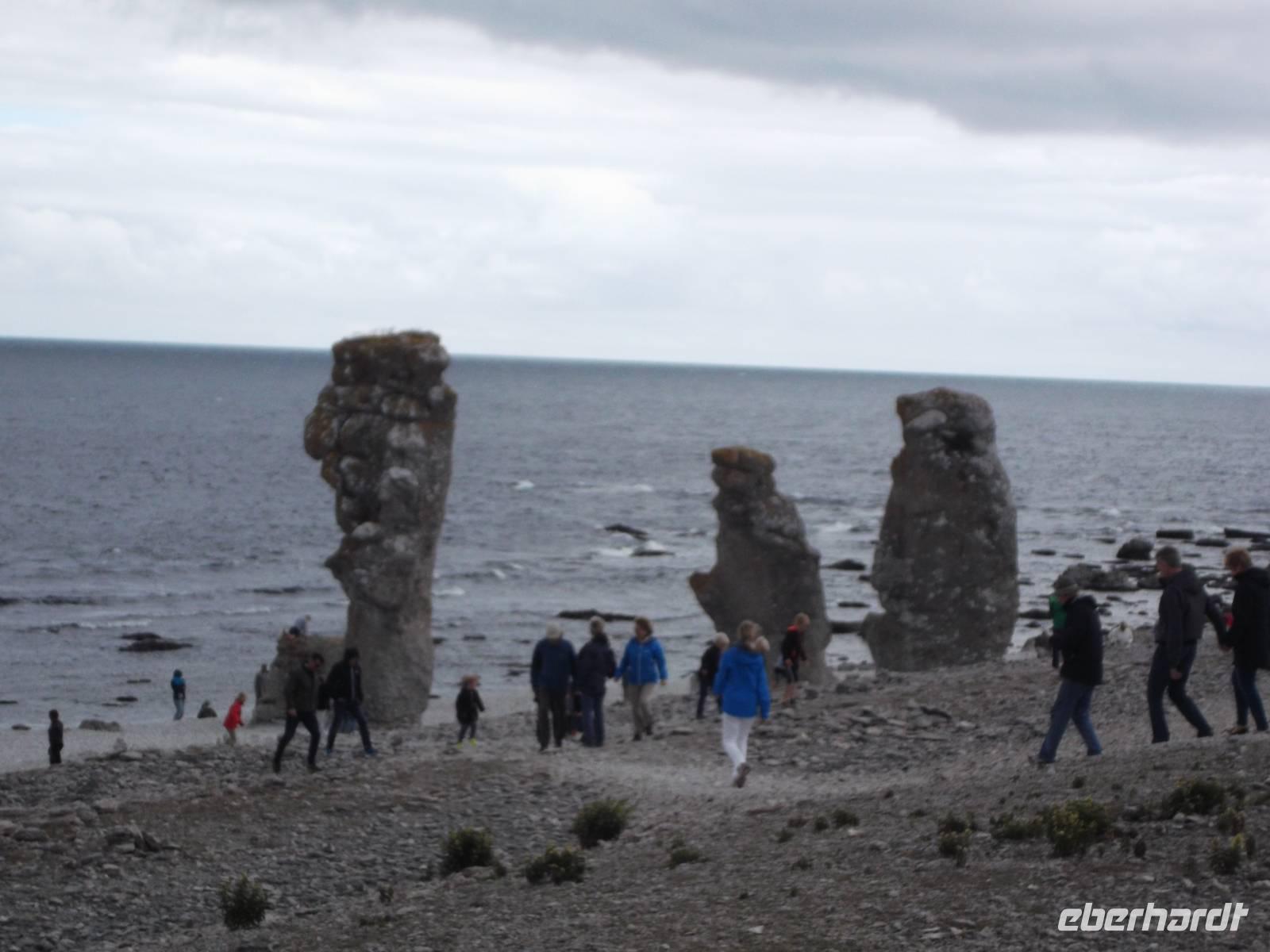 Heute würden wir den Norden der Insel Gotland kennenlernen. So fuhr unser Bus auf die Gotland vorgelagerte Insel Fårö zu, die wir auch ganz reibungslos nach einer guten Stunde Fahrt erreichten. Wir unterbrachen die Fahrt nur für einen Fotostopp an der besonders stattlichen, im 13. Jh. errichteten Kirche von Lärbro. Mit einer kleinen Fähre setzten wir über nach Fårö und hier statteten wir zunächst dem in herrlicher Lage am Waldrand direkt neben dem Strand befindlichen „englischen Friedhof" einen Besuch ab. Die friedliche Stätte wirkt fast wie ein Naturdenkmal - hier sind Soldaten der englischen Flotte beerdigt, die während des Krimkrieges in Schweden stationiert waren und hier einer grassierenden Cholera-Epidemie zum Opfer fielen. Unsere nächsten beiden Ziele lagen auch an der Küste - was bei dem eher schlechten Wetter heute unter anderem sehr viel Wind bedeutete. Die „Raukar" (Einzahl: Rauk) sind originelle Felsformationen an vielen Stellen von Gotlands Kalkstein-Küste, die nach der Eiszeit durch Erosion von Wind und Wellen geformt sind. Wie versteinerte Figuren stehen sie an der Steilküste und teilweise im Wasser und geben der menschlichen Phantasie Anregungen, in ihnen Sagen- und Märchengestalten zu sehen. Hier im Norden der Gotland vorgelagerten Insel Fårö findet man besonders viele dieser ausgewitterten Steinsäulen, an die sich tatsächlich so manche Geschichte knüpft, die man des Abends in den Kneipen oder zu Mittsommer am Lagerfeuer erzählt bekommt...