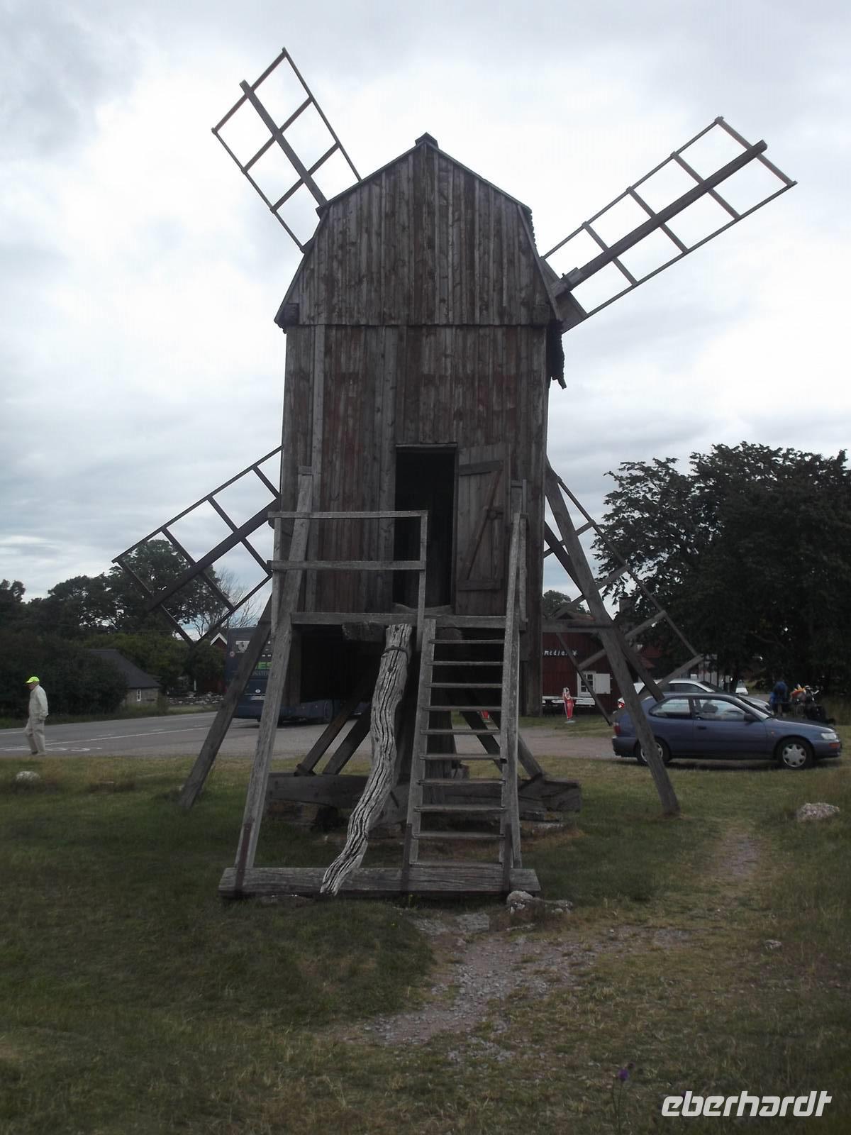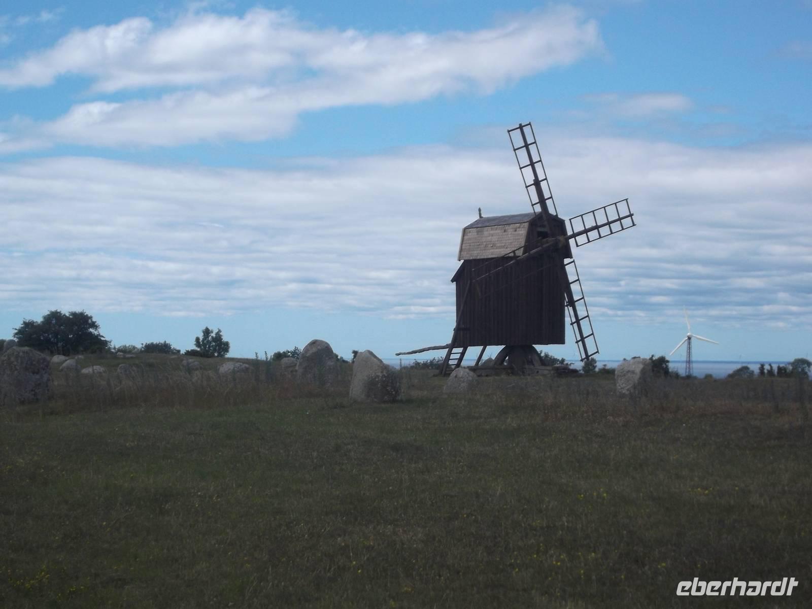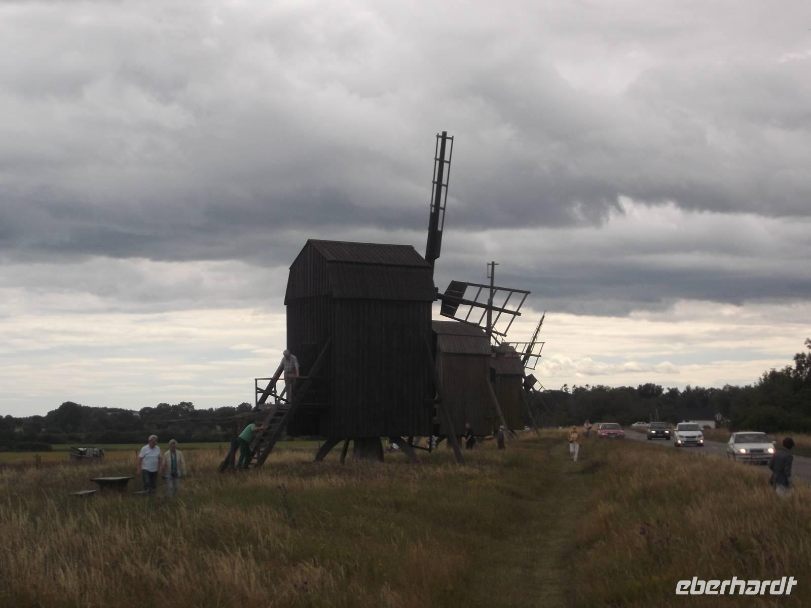 Besonders ins Auge fallen einem während eines Öland-Besuchs die vielen Windmühlen - Zeichen der früheren „Industrialisierung" der Insel. Über 2000 soll es gegeben haben und über 400 sind erhalten. Ein ganz besonders fotogene Ansammlunf findet man bei Lerkaka. Hier kümmert sich ein Verein darum, dass die Mühlen in gutem Erhaltungszustand und auch offen sind. Wir hatten Gelegenheit, ins die auf einem hohen Pfosten Stehenden und durch einen hölzernen Zahnradkranz drehbar gelagerten Mühlen genauer anzusehen. Schließlich statteten wir auch noch der besterhaltenen Mittelalterkirche Ölands einen Besuch ab. Gärdslösa stammt im Kern aus dem 12. Jh. wurde aber mehrfach erweitert und umgebaut. Auch sie trägt noch deutliche Züge einer Wehrkirche.