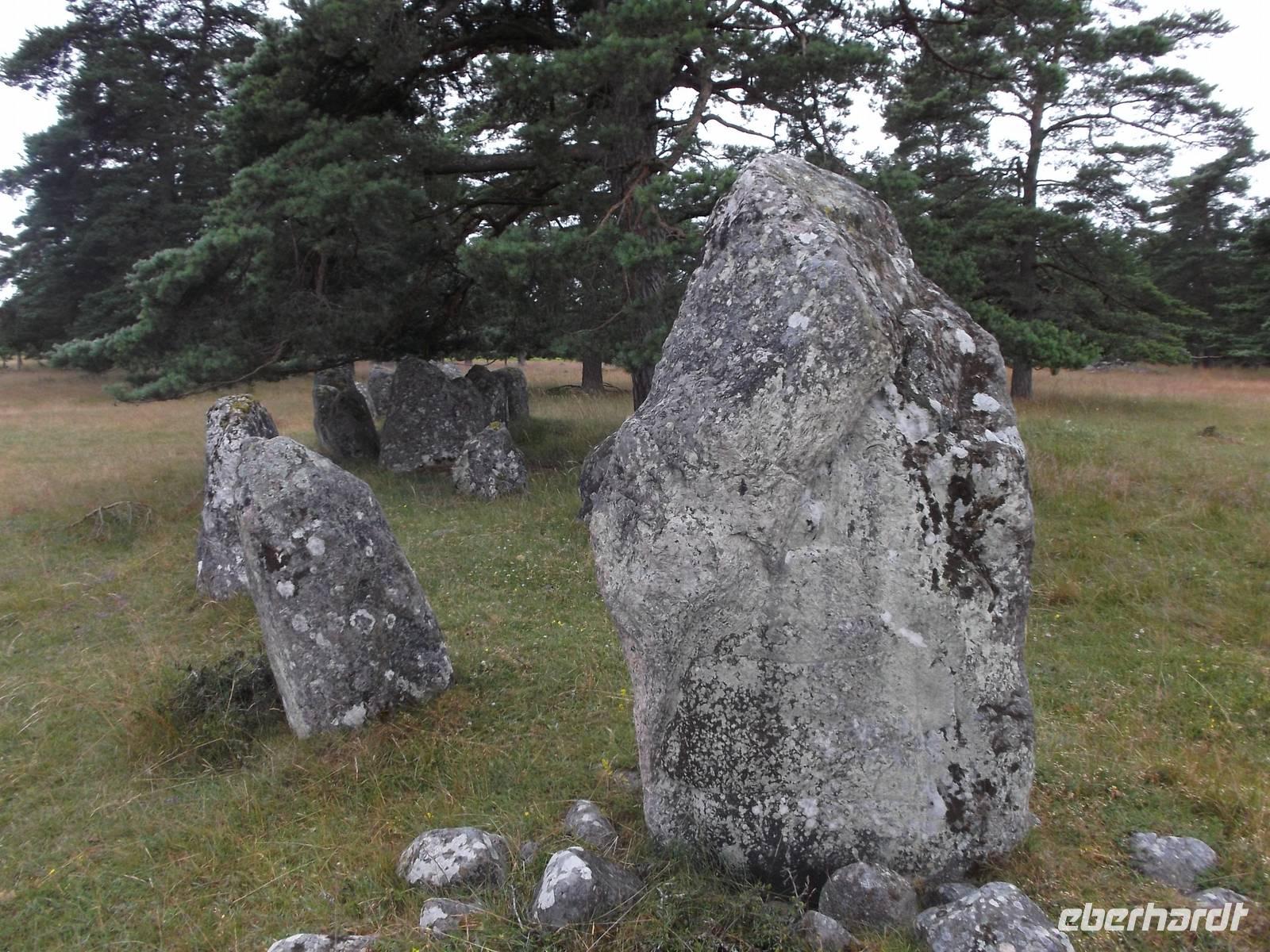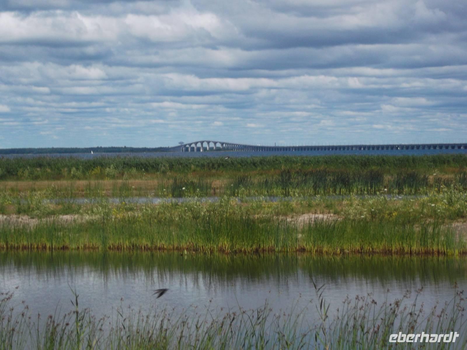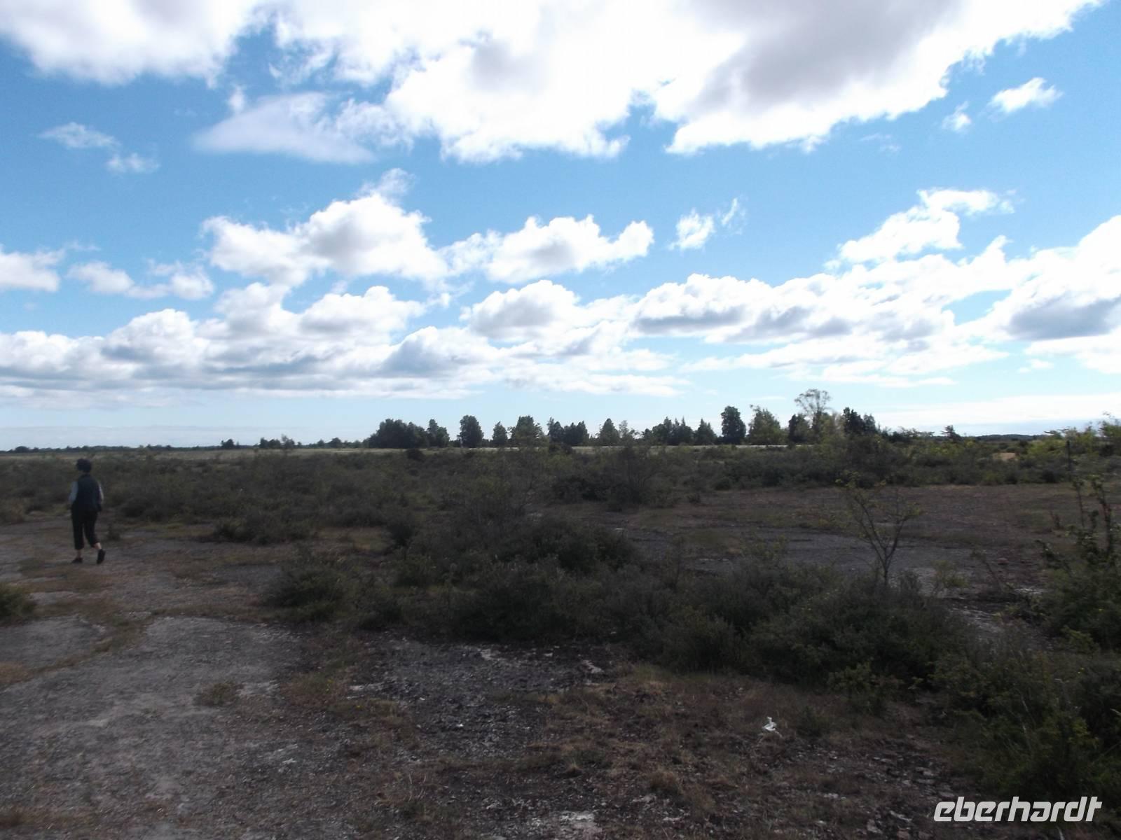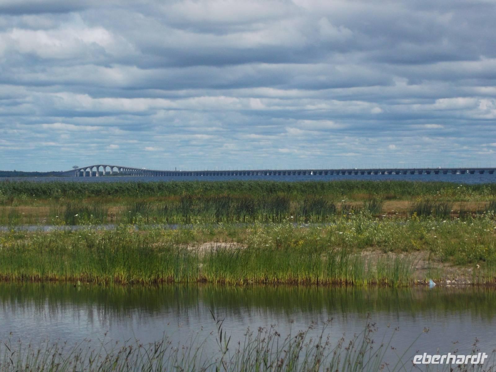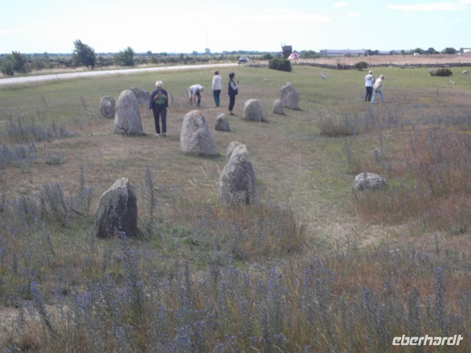 Im Hotel begrüßte uns nach dem Frühstück schon unser örtlicher Führer für heute. Da sie nur ein paar Schritte entfernt lag, begannen wir die Besichtigungen des heutigen Tages mit der Domkirche in Kalmar. 1602 bis 1915 war Kalmar Bischofssitz, obwohl die Stadt eigentlich älter ist, bereits im 14. Jh. war sie eine bedeutende, von deutschen Hansekaufleuten dominierte Handelsstadt, in der 1397 Abgesandte Dänemarks, Norwegens und Schwedens ein Bündnis gründeten, die sogenannte „Kalmarer Union", die für etwa eineinhalb Jahrhunderte Skandinavien zusammenschweißte. Doch seit der Loslösung von Schweden aus dem Bund waren vor allen Schweden und Dänemark verfeindet und führten jahrhundertelange Kriege gegeneinander, in denen schließlich Schweden dem Nachbarland große Geländestreifen abnahm. Nahezu alle 30 - Jahre gab es wieder Krieg, im sog. Kalmarkrieg wurde die Stadt weitgehend zerstört und brannte kurz danach noch ab - deshalb verlegte man die Stadt etwas von der Insel mit dem immer noch dominierenden Schloss weg und baute Sie nach Plänen vom Reißbrett neu auf. Am großen Markt entstand ein aufwendiger barocker Kirchenbau - unter König Karl X. Gustaf war 1660 Baubeginn, doch erst dessen Enkel Karl XII. weihte den lutherisch-protestantischen Bau schließlich 1703 ein. Kurz danach entstand auch der barocke Altar, in dem manche einen der schönsten Schwedens sehen. Nach einem kurzen Rundgang in der Kirche begann unsere Tour nach Öland. Seit 1972 verbindet eine Brücke die historisch kleinste Provinz Schwedens mit dem Festland und machte damit lange Wartezeiten auf die kleinen Fähren, die bis dahin die Verbindung zwischen Kalmar und Öland über den Kalmarsund hergestellt hatten, überflüssig. „Ölandbrun" ist 6072 m lang, hat 19 Dehnfugen und wird von ihren 156 Pfeilern durchschnittlich 36 m hoch getragen - hat aber einen bogenförmigen Teil für den Schiffsdurchlass, der die Fahrbahn knapp 42 m hoch führt. Auf der ölandischen Seite erreicht man den alten Fährhafen Färjestaden - und ist auf Öland, der knapp 140 km langen und nur 16 km breiten Insel, die mit ihren 1.347 km ² zwar nicht einmal halb so groß ist wie das gerade von uns verlassene Gotland, sich aber in Schweden gewaltiger Beliebheit als Ferieninsel erfreut. Wie auch das nur etwa 50 km Luftlinie von ihrer Nordspitze entfernte Gotland ist die Insel eine sich aus dem Meer erhebende Kalksteinplatte. Wie tischlflach und eben sie ist, erfuhren wir auch bei unserem ersten Halt. Vor allem die Südhälfte der Insel, auf der wir uns gerade befanden, wird von der fast wie eine spärlich bewachsene Betonwüste aussehenden Karst- und Heidelandschaft „Sora Alvar" eingenommen. Wir hatten hier Gelegenheit zum Fotografieren und Bummeln, ehe wir - immer noch südwärts - zum weitläufigen und bekannten Gräberfeld von Gettlinge fuhren. Es ist eines der größten in Schweden und enthält mehr als 200 Gräber, größtenteils Grabhügel der Bronze und Eisenzeit, aber auch Steinkreise und Schiffssetzungen. Deren größte und besterhaltenste imponiert noch heute mit über 30 m Länge und besteht aus 23 hierhergeschafften und aufgestellten Findlingen aus Granit.