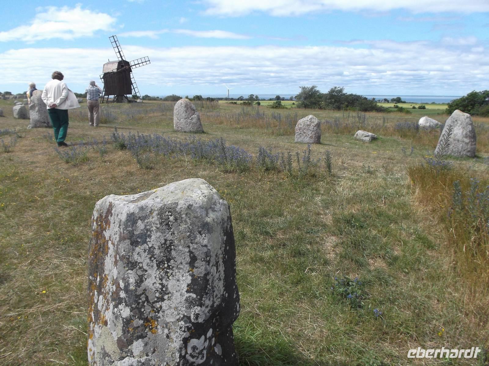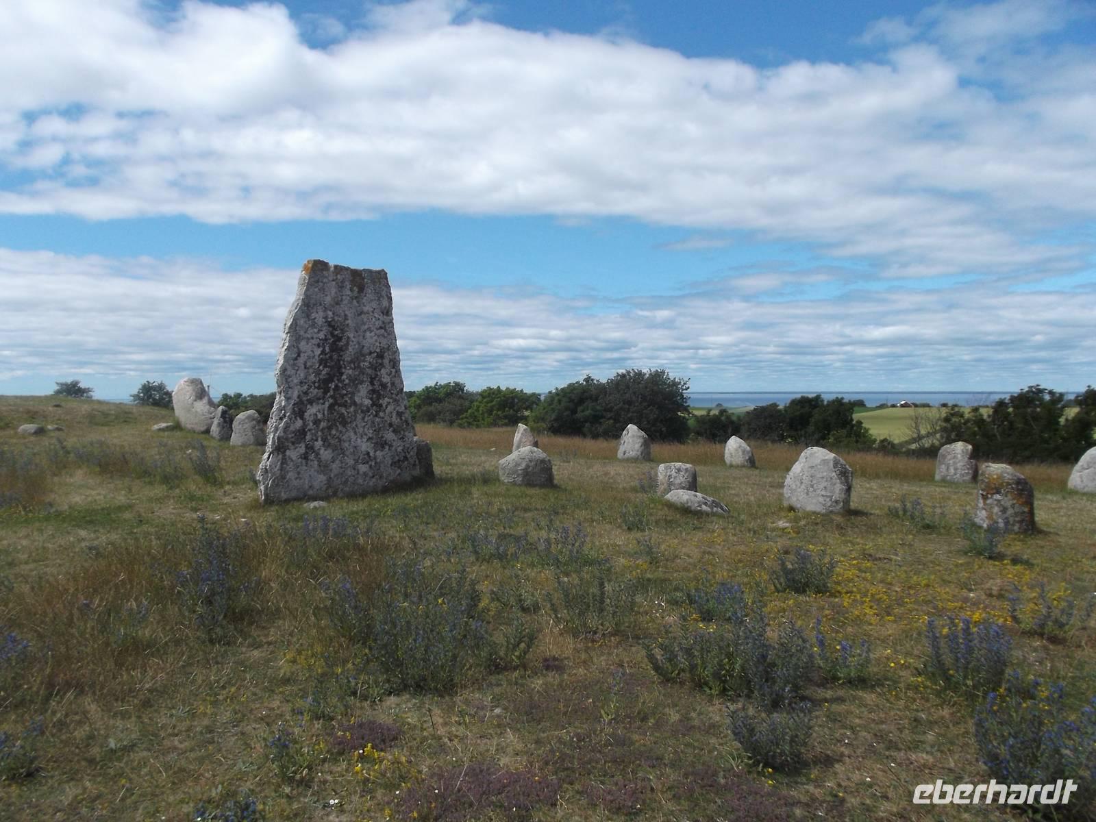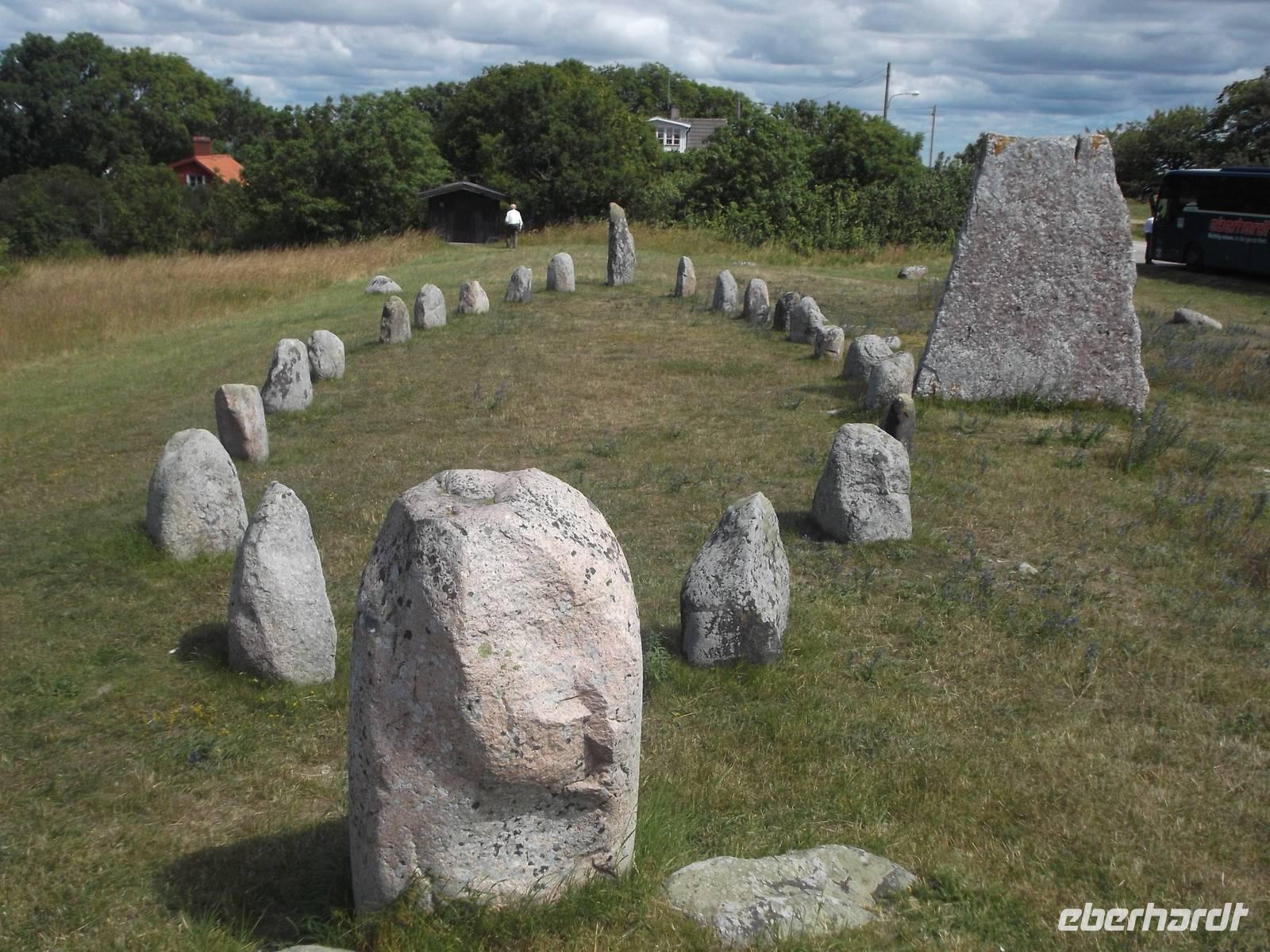 Auch heute Morgen begrüßte uns unser örtlicher Führer Bertil und holte uns am Hotel zur Rundfahrt durch das südliche Gotland ab. Wir gelangten zunächst an einer prähistorische Stätte - ein größeres Gräberfeld mit Resten von Steinkistengräbern, Steinkreisen und Schiffssetzungen. Gerade auf Gotland findet sich eine Häufung solcher Monumente und kündet von der nacheiszeitlichen Besiedlung des südlichen Ostseeraumes in der Jungsteinzeit, vor allem aber in der Bronzezeit und nachfolgenden Eisenzeit.