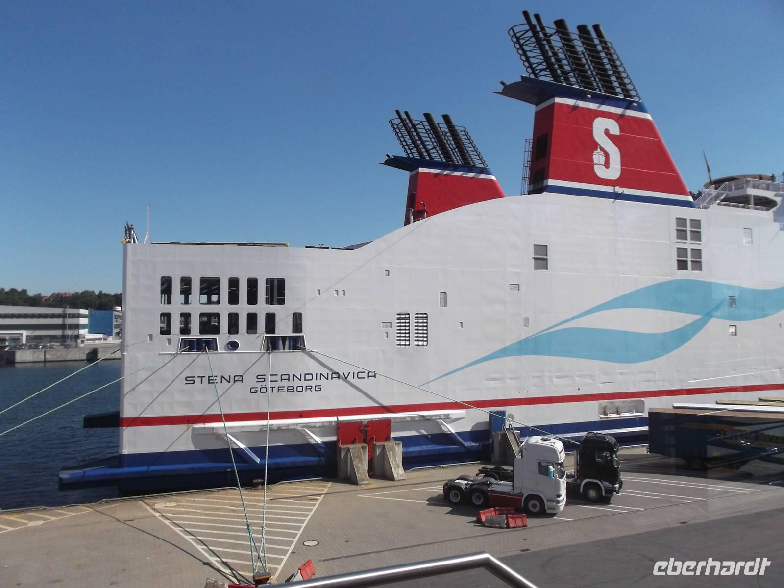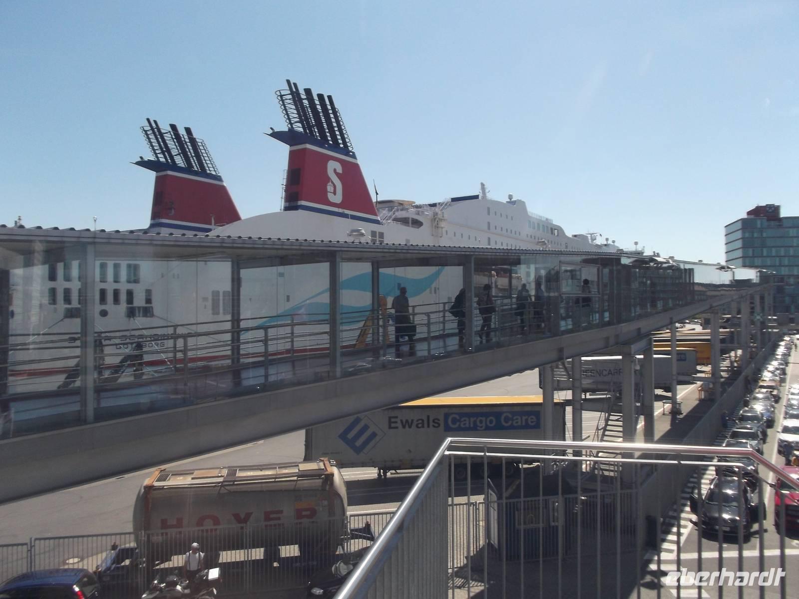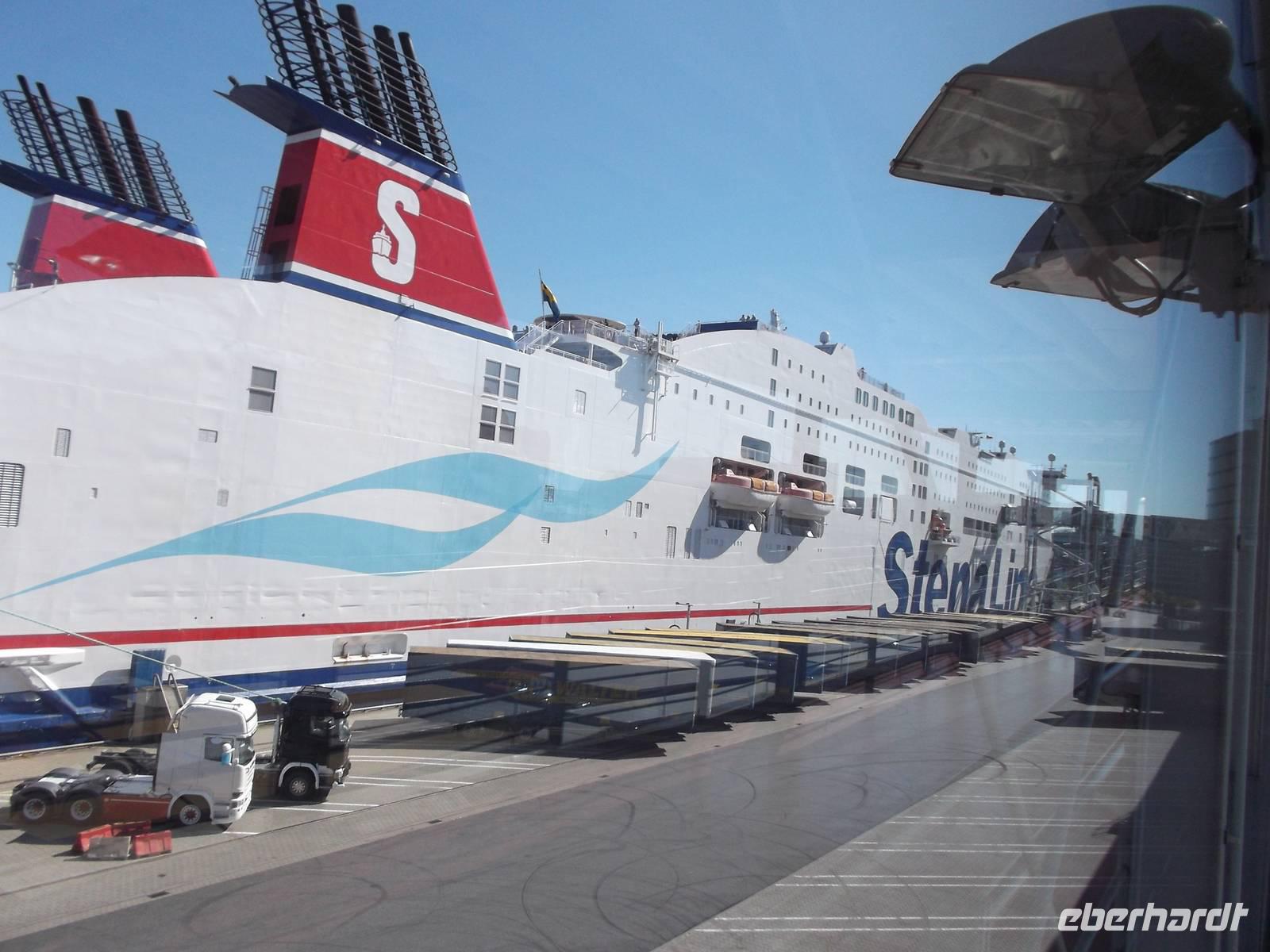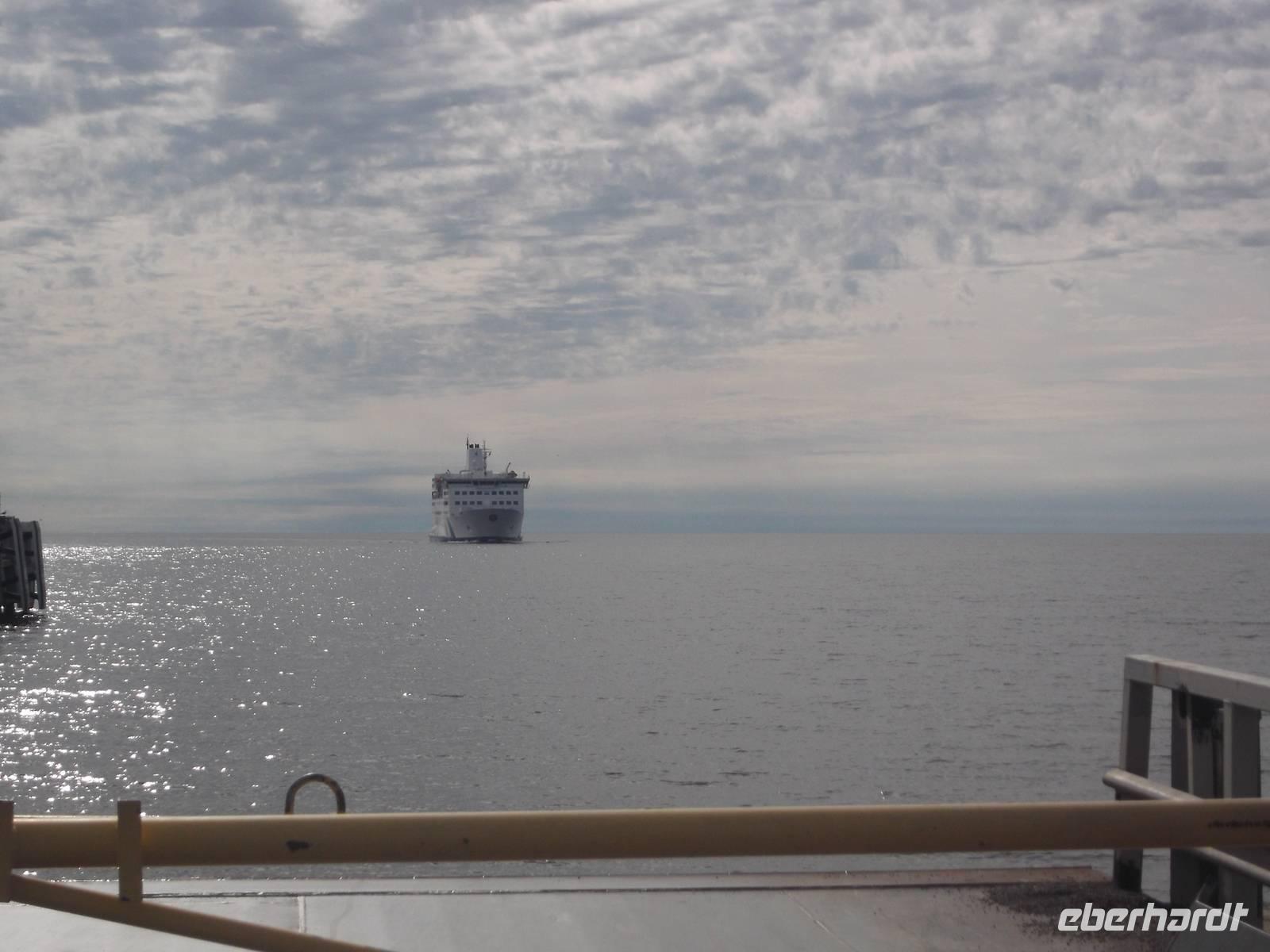Nach dem Check in und Empfang der Kabinenschlüssel betraten wir mit unserem Fährgepäck das Schiff „Stena Scandinavica", das erstaunlich lange Wege und kleine, aber auch sehr komfortable Kabinen bereithält. Um 18.00 Uhr trafen wir uns zu einem echten Schlemmer-Abendessen im Buffetrestaurant. Noch während dieser leckeren Mahlzeit stach das Fährschiff in See und die Badeorte der Kieler Förde zogen vorüber, bis zuletzt der Turm des Marine-Ehrenmals von Laboe auftauchte und wir die deutsche Küste verließen.