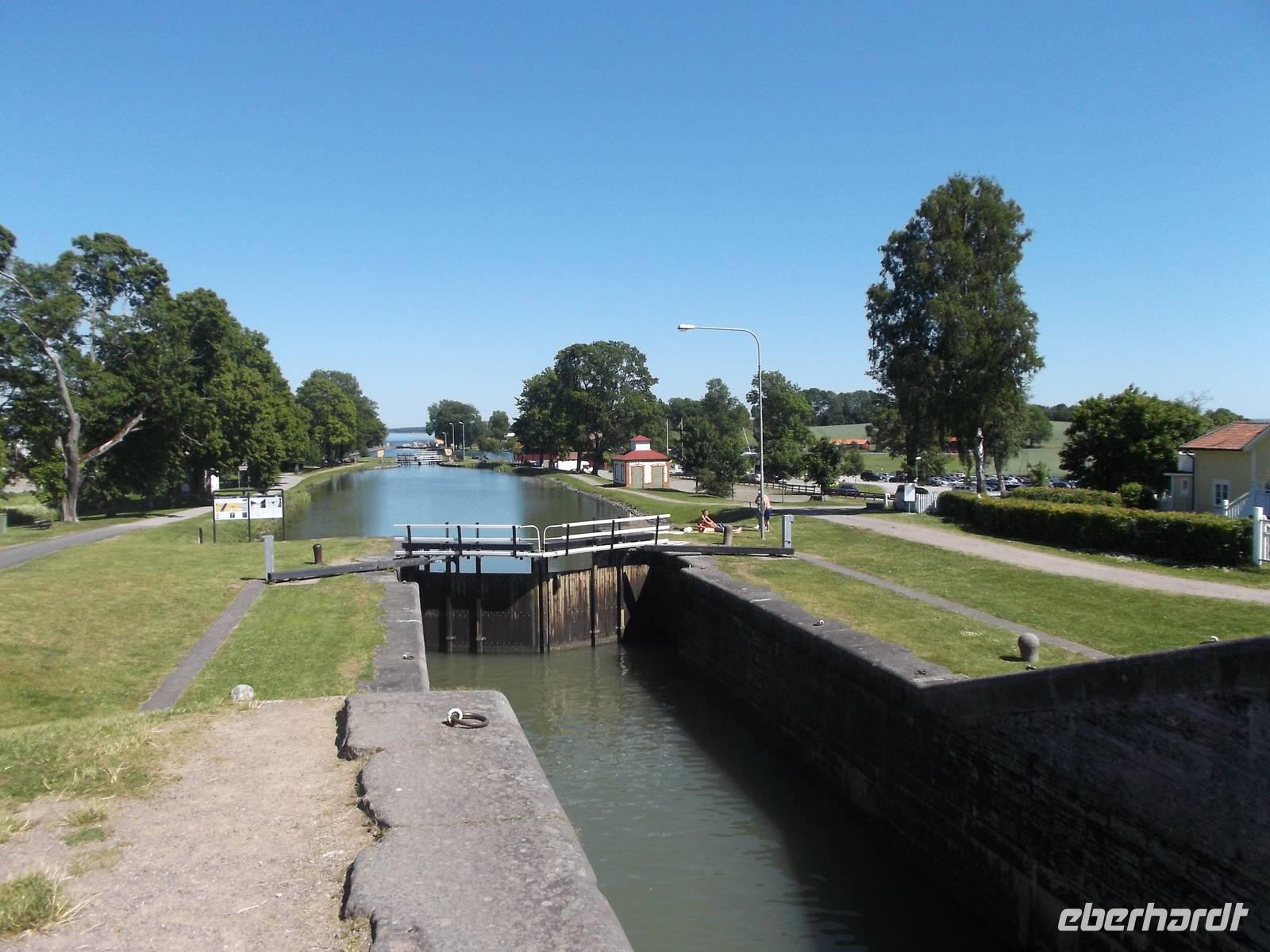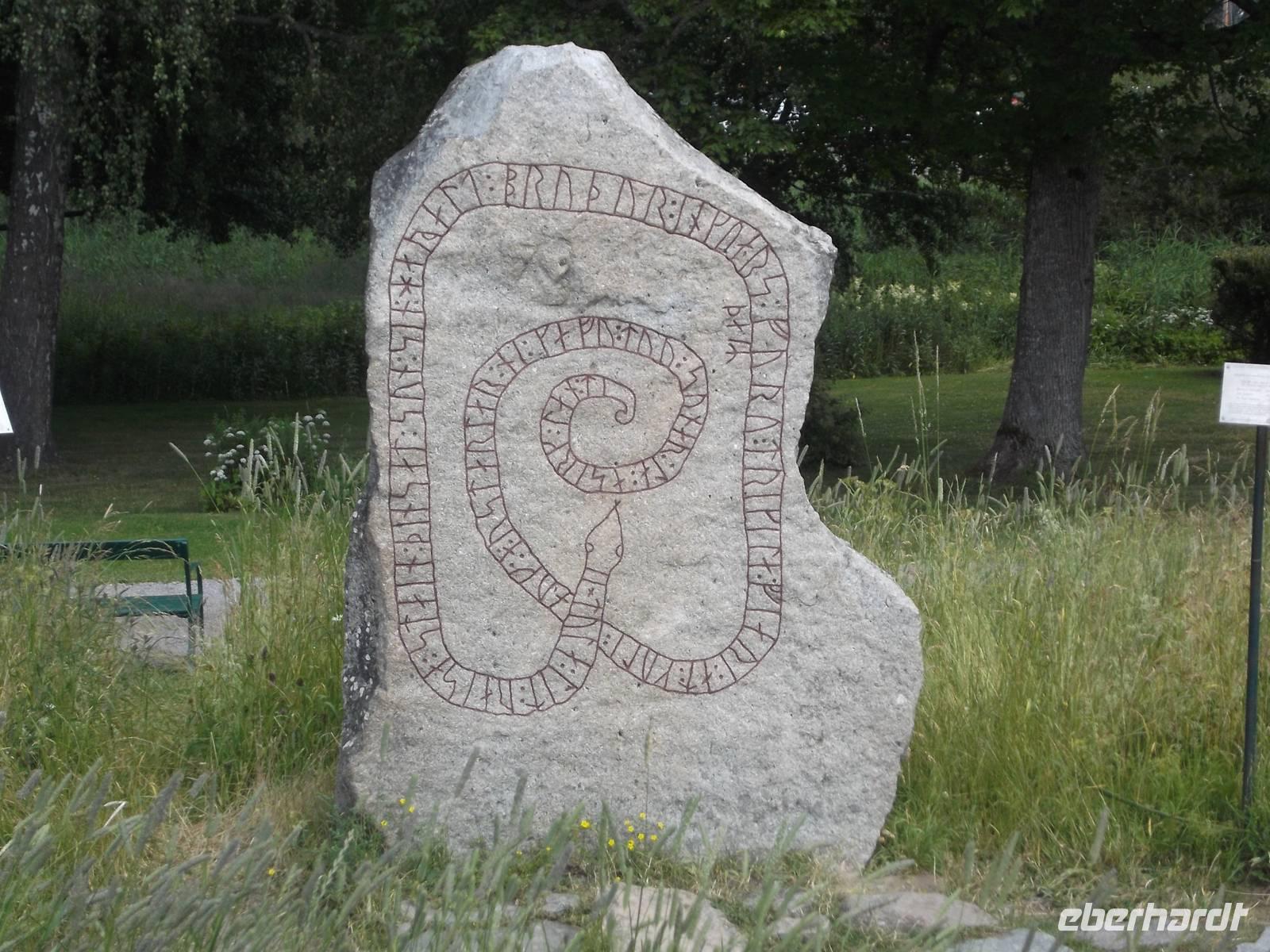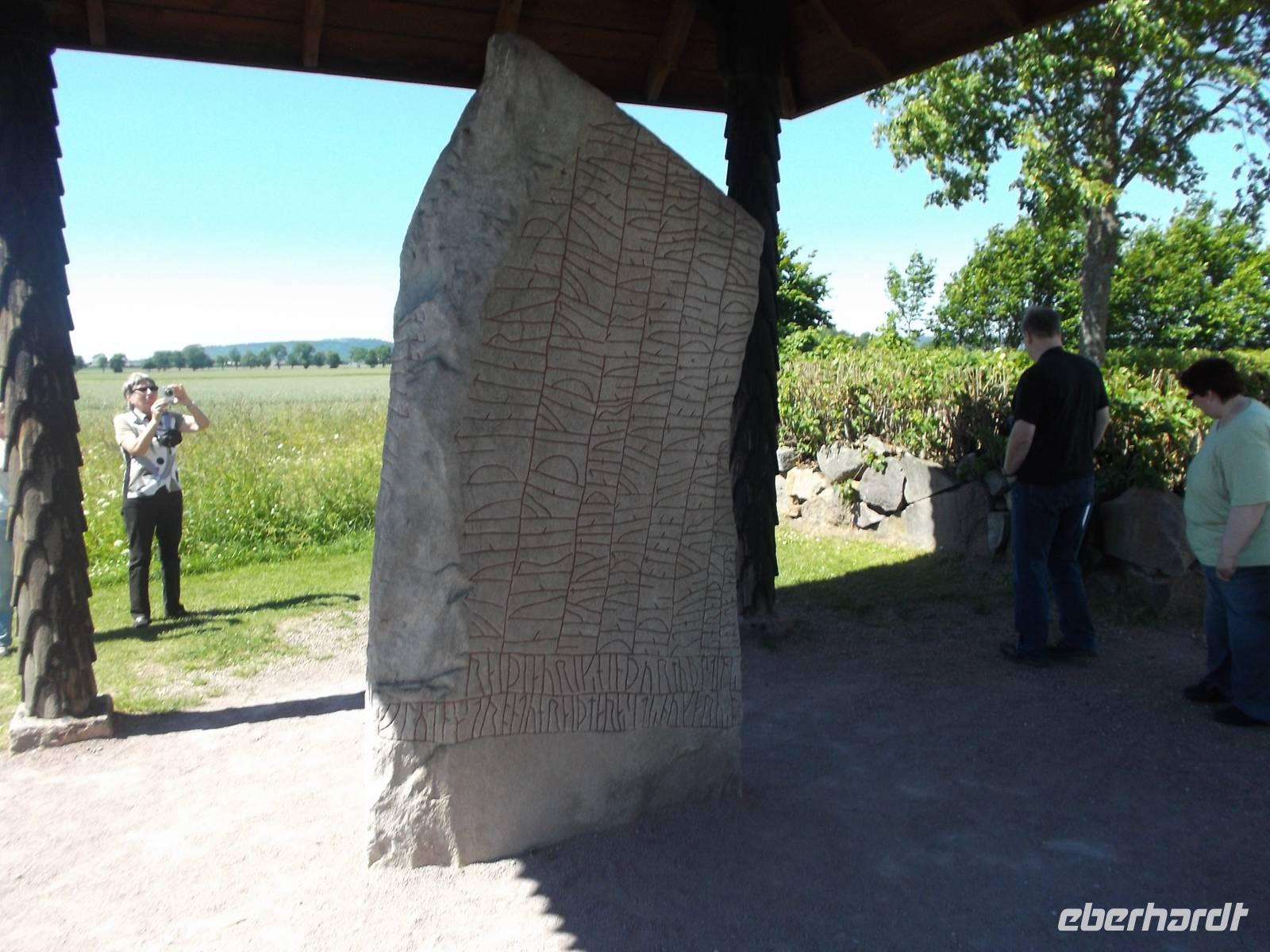 Unsere Mittagspause mit Verpflegung aus der Bordküche nahmen wir an einem bestimmten Platz nach einem Umweg mit „Richtig Reisen!"-Charakter ein. Wir fuhren zu dem berühmten Runenstein von Rök, der fast so etwas wie ein „schwedisches National-Monument" darstellt. Er ist - unter den vielen hundert skandinavischen Runensteinen - der mit den meisten Runen und zudem besonders interessant dekoriert. Trotz seinem etwas abgelegenen Standort ist er ein weithin bekannter Gedenkstein der alten Wikinger und ein zumindest von Schweden häufig besuchtes Monument. Nach meinen Erklärungen zum Runenstein, nach Freizeit und Bordservice ging es weiter - und eigentlich gleich zum nächsten Extra. Wir hatten noch genügend Zeit für einen Abstecher zum Götakanal, dem schon im 19. Jahrhundert erbauten längsten Kanal Schwedens. Er führt quer durch Südschweden und verbindet durch Seenhindurch und per Kanalstrecken Schwedens größten See, den Vänern, mit Stockholm und der Ostsee. Tausende schwedische Soldaten gruben ihn im 18 Jh. Mit der Hand, um Transportschiffen längere Wege und vor allen die sonst fälligen Zollzahlungen an Dänemark zu ersparen. In seinem Verlauf überwinden mehr als 50 Schleusen die zwischen den Teilabschnitten liegenden Höhenunterschiede von über 90 m. Besonders malerisch sind hier die fünf hintereinander liegenden Schleusen von Berg, unmittelbar vor dem Roxensee. Bei herrlichem Wetter hatten wir hier genügend Zeit für einen idyllischen Spaziergang oder auch zum Eis-Essen.