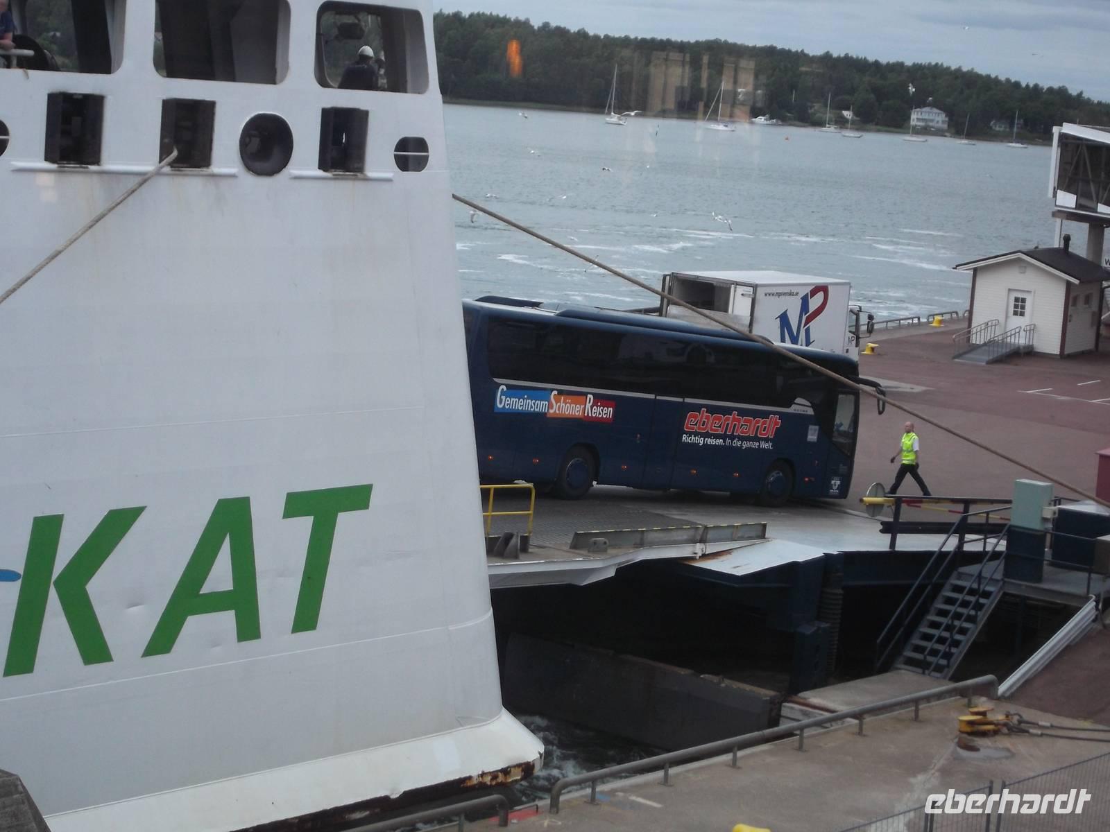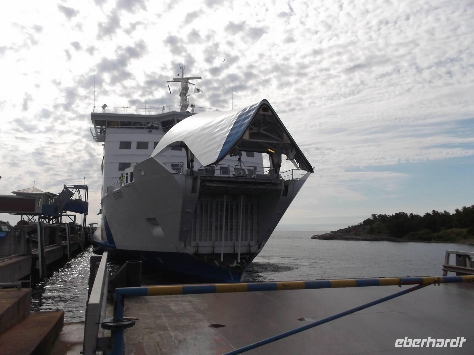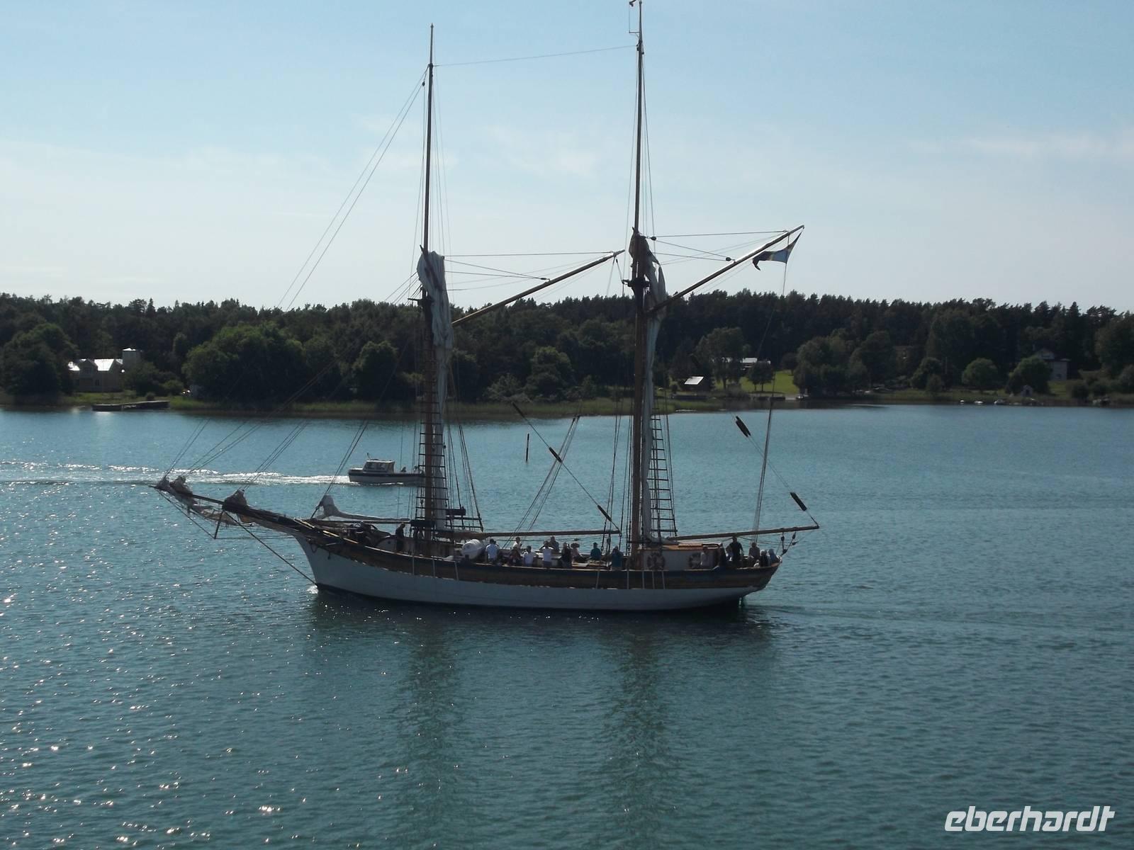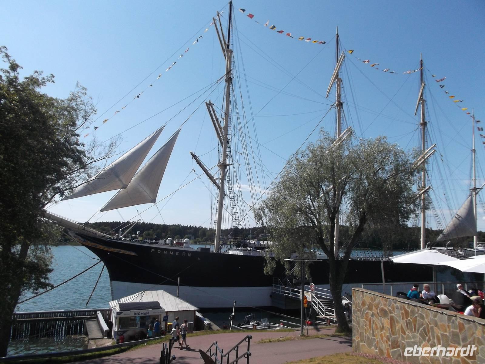 Recht früh mussten wir heute frühstücken, denn wir wollten die Frühfähre zu den Åland-Inseln erreichen. Schon um sieben Uhr saßen alle im Bus und wir machten uns auf den Weg zum Fährhafen von Grisslehamn. Rechtzeitig angekommen konnten wir das Eintreffen der Fähre filmen, die nach Eckerö auf den Åland-Inseln fahren würde, bevor wir an Bord genau dieses Fährschiffes gingen. Zwei Stunden dauerte die Überfahrt zu den Autonomen Inseln, die aber zum Staatsgebiet von Finnland gehören. Daher mussten wir uns auch auf finnische Zeit einstellen - d.h. unsere Uhren wurden eine Stunde vorgestellt. In Eckerö gingen wir von Bord und fuhren mit unserem Bus in Richtung Mariehamn. Das ist der Hauptort der über 6000 Åland-Inseln, von denen aber bloß ein Hundertstel bewohnt ist. Traditionell sind die Ålands eine entmilitarisierte Zone, die zwar seit Gründung des finnischen Staates zu Finnland gehören, auf denen aber schwedisch gesprochen wird und die eine Selbstverwaltung besitzen. Lieblich präsentierten sich die malerischen Eilande um den Hauptort, den wir während einer Führung näher kennenlernten. Neben der Runde durch die Stadt Mariehamn - erst 1861 vom damaligen Landesherrn; dem russischen Zaren, gegründet und nach seiner Frau benannt - war einer der Tages-Höhepunkte der Besuch des Großseglers „Pommern". Das fast hundert Meter lange dreimastige Segelschiff stammt aus den ersten Jahren des 20. Jahrhunderts und diente über vierzig Jahre als Frachtschiff vorwiegend zur Beförderung von Getreide. Wir konnten uns viele Details dieses Seglers ausführlich anschauen, der einstmals zur größten Reederei der Welt - mit über 40 größeren und kleineren Segelschiffen - gehörte.