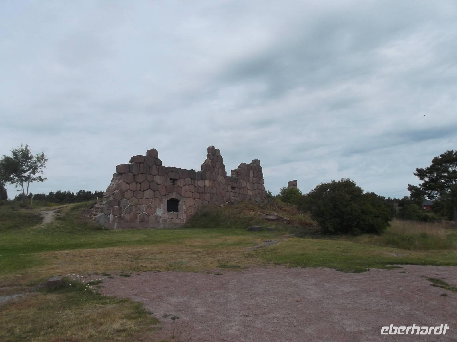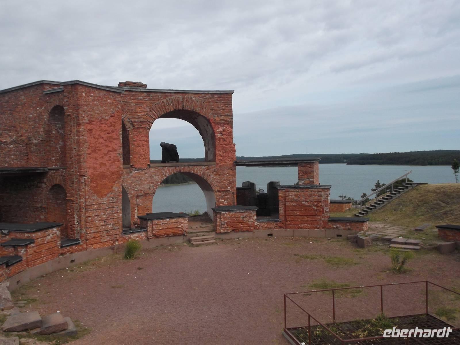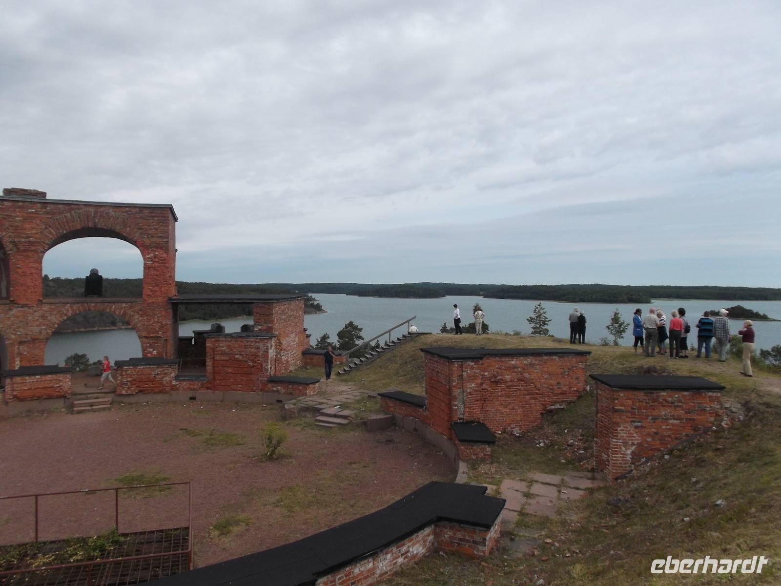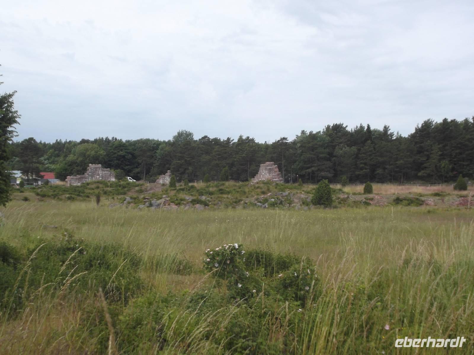 Unerwartet gewaltige Ausmaße hatten dann die Ruinen der einstigen Festung Bomarsund. Als 1809 Russland Schweden im letzten Russisch-schwedischen Krieg besiegt hatte, wurde aus dem jahrhundertelang zu Schweden gehörenden Finnland ein russischen Großfürstentum, zu dem auch miteroberten Åland-Inseln gehörten. Als Absicherung gegen eventuelle schwedische Angriffe ließ der Zar hier eine Garnisonsfestung errichten. Umgeben von mehreren gewaltigen Kanonentürmen auf den umliegenden Anhöhen - von denen wir die Ruine des Kanonenturms von Prästö besichtigten, errichteten die russischen Truppen hier ein umfangreiches, kanonengespicktes Militärquartier ein. Wenige Jahrzehnte später, zur Zeit des Krimkrieges gelang es aber einer englisch-französischen Flotte mit Hilfe åländischer Führer, den Russen in den Rücken zu fallen und Kanonentürme und Festung einzunehmen. Später haben sie dann die Festung Bomarsund so gründlich geschleift und gesprengt, dass nur noch wenige Mauerreste übrig blieben - die aber zeigen noch ziemlich genau die einstige Größe des imposanten Bauwerks.