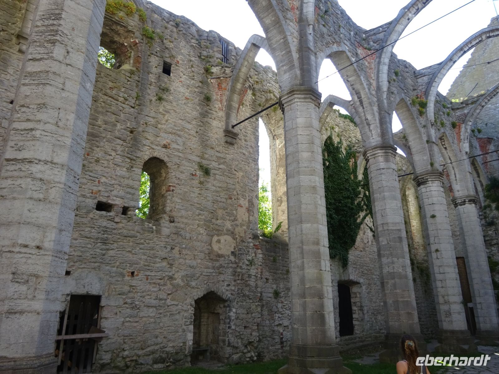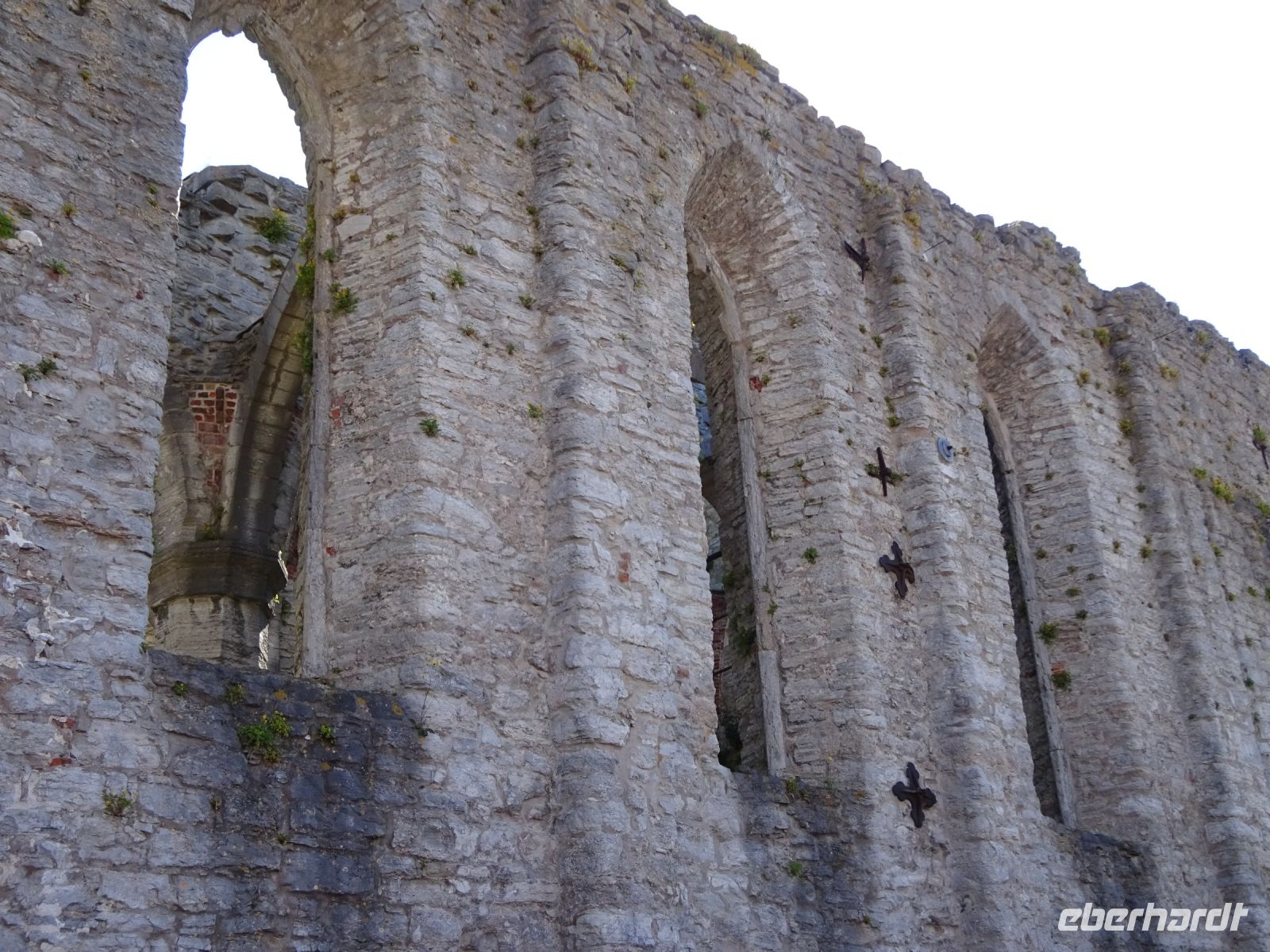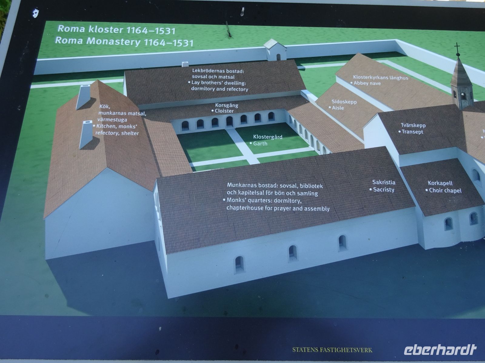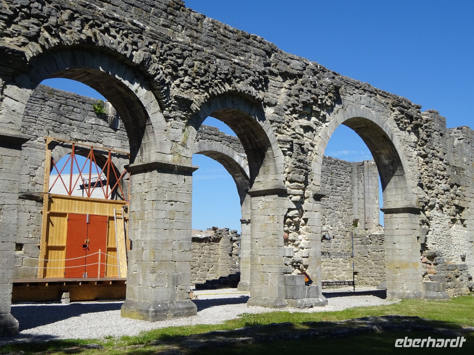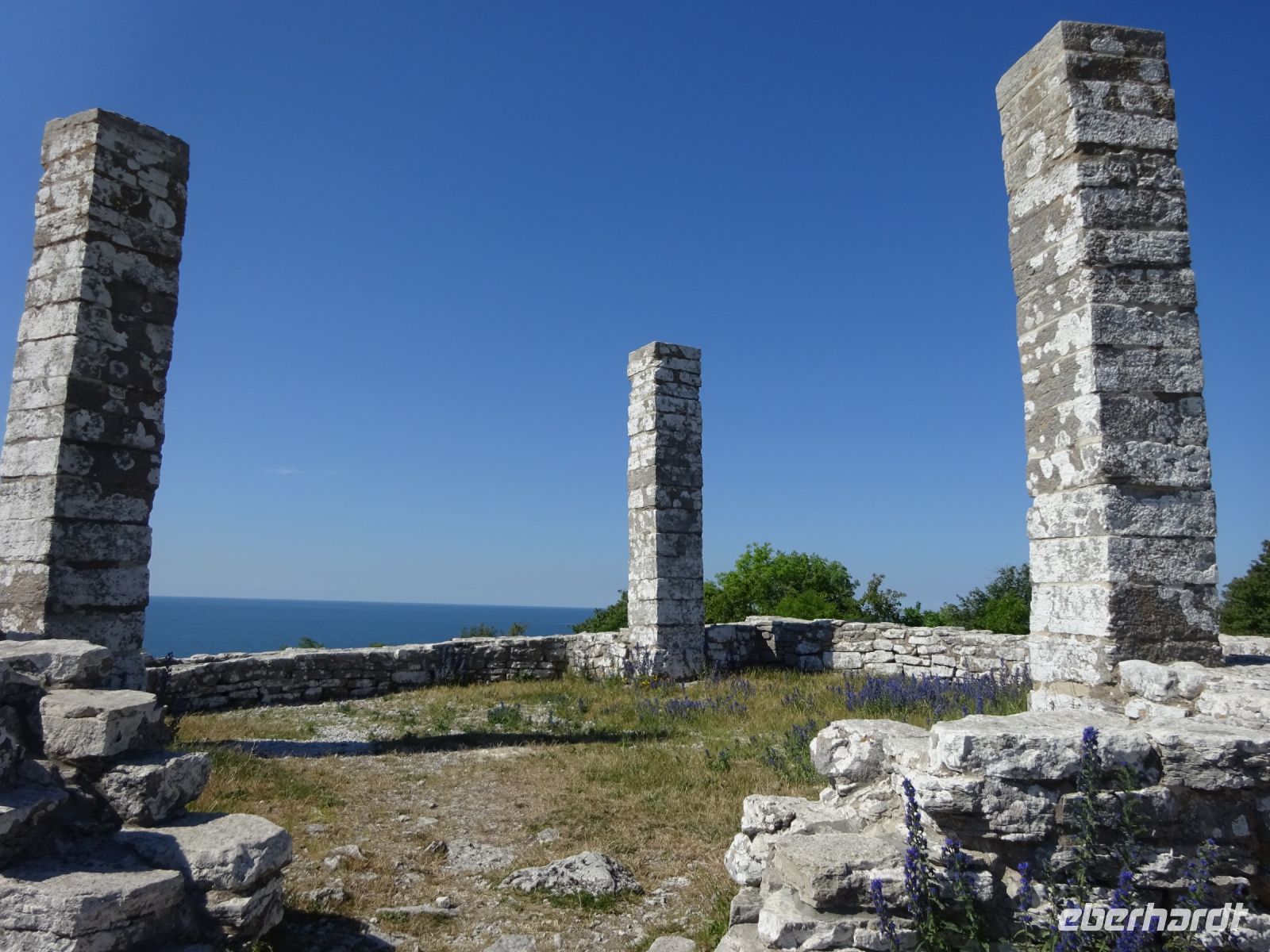Nächstes Ziel unserer Rundfahrt war die Kirche von Lärbro. Wieder konnten wir auch innen alles kennenlernen. Weiter fuhren wir nach St. Olovsholm, sahen einen Grabhügel, eins der zahlreichen Gräberfelder und eine Schiffsetzung, d.h. eine Begräbnisstätte in Form eines Schiffes. An einem der schönsten Plätze am Wasser überhaupt, machten wir eine längere Pause, bestaunten die dort stehenden Raukar-Steine, auch immer wieder die Flora, z.B. Natterköpfe. Und Gunnar brachte uns die Schätze und Wunder Gotlands nahe, sprach über die Goten, von denen die Insel ihren Namen hat, machte uns auf die Vegetation in den Wäldern und in der Heide aufmerksam. Vorbei ging es an der romanischen Dorfkirche von Källunge bis hin zum Romakloster, einer großen Anlage, von deren Ausmaß die noch erhalten gebliebenen Ruinen zeugen. Am Ende der Tour sahen wir uns noch den Dom von Visby, die Marienkirche an.