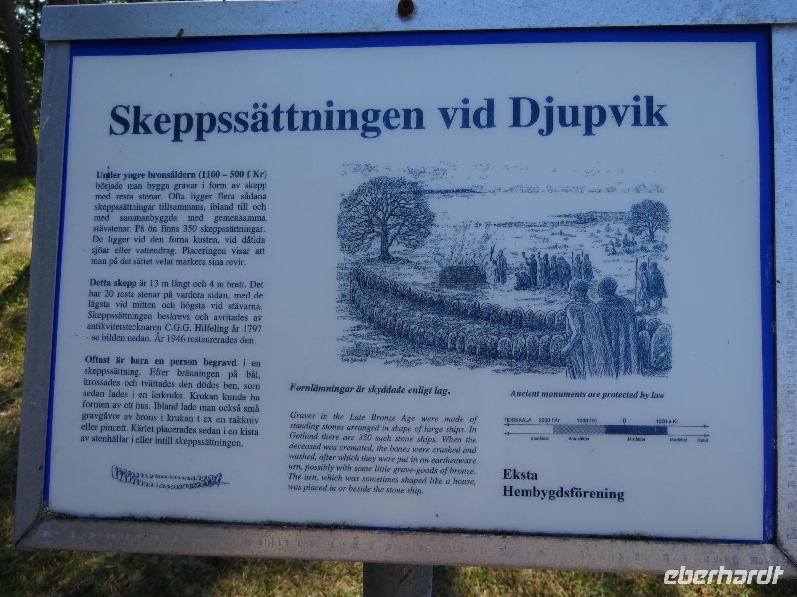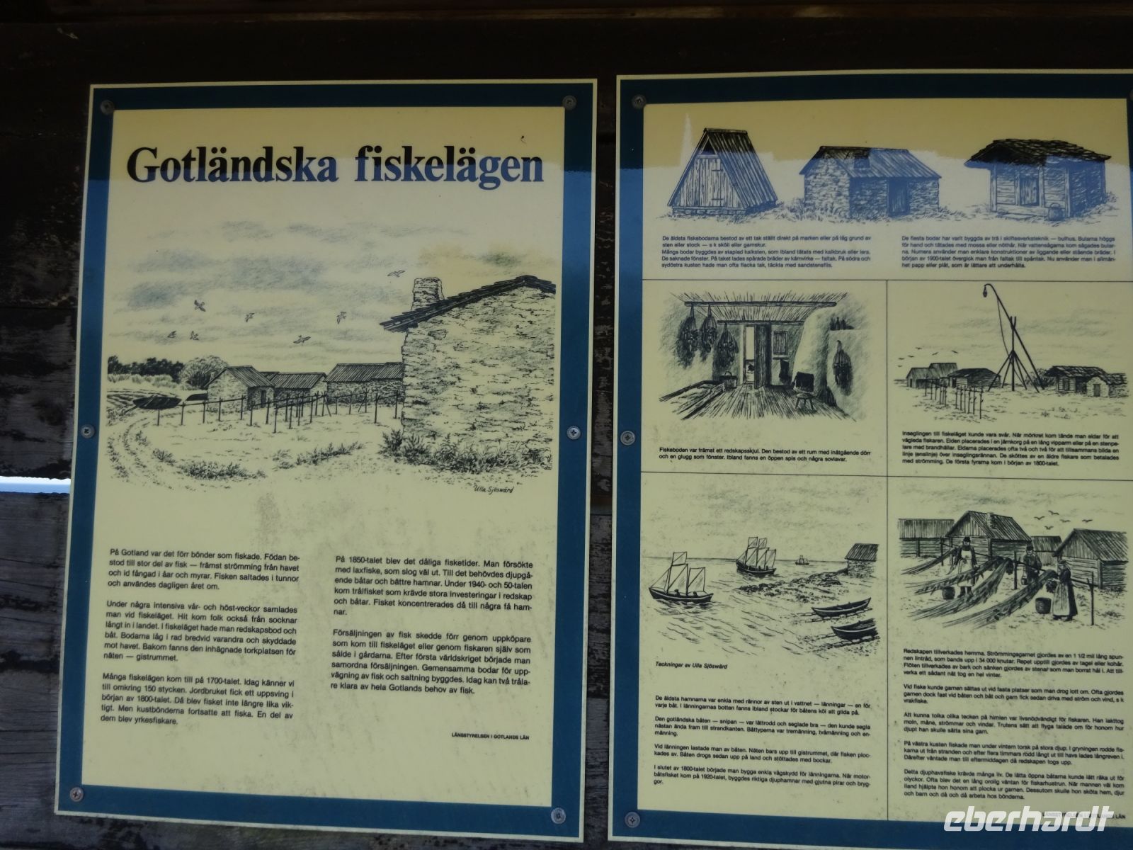 Unser Weg führte uns entlang einer landschaftlich sehr schönen Strecke bis an die Südspitze der Insel. Zunächst besuchten wir jedoch das Fischerdorf Djupvik. Hier sahen wir uns die Schiffsetzungen an, Steingräber, die wie ein Schiffsrumpf gestaltet sind. Und auch die alten Fischerhütten unmittelbar am Strand sind sehenswert. Sie erinnern an die wichtigste Einnahmequelle der Gotländer, den Fischfang.