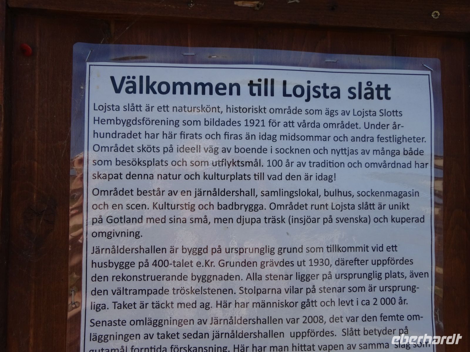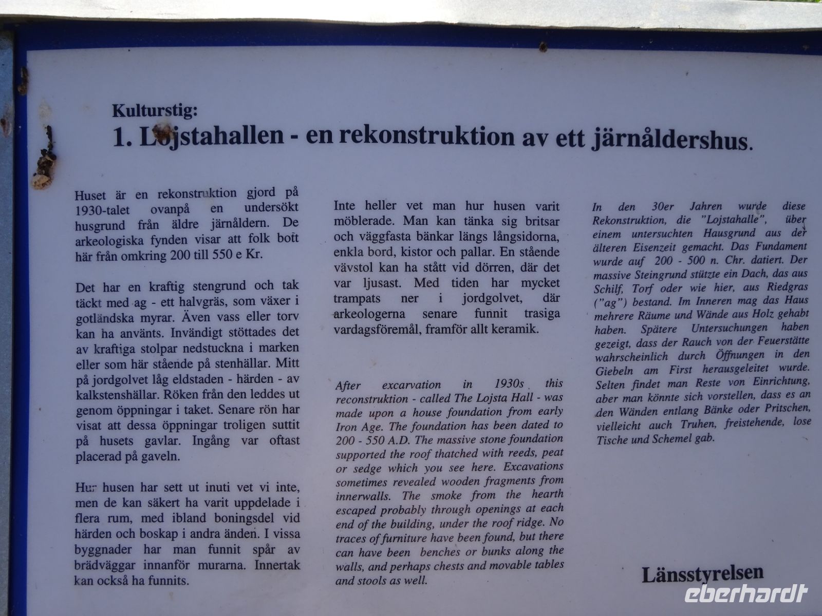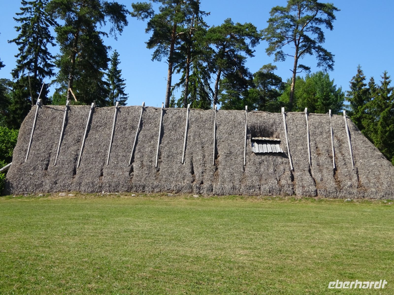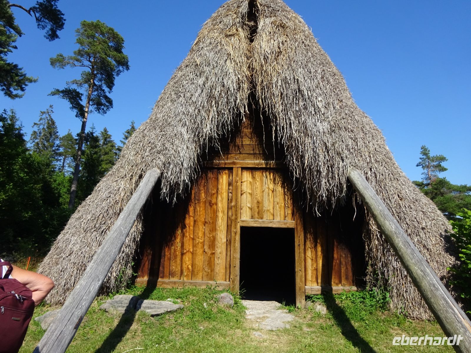 Nächste Station unserer Rundfahrt war die Kirche in Grötlingbo, Südgotlands Kathedrale. Und schließlich fuhren wir nach Lojsta slott, wo ein eisenzeitliches Vikinger-Langhaus aus dem 3. Jh. am Originalfundort und nach Originalbefunden rekonstruiert worden ist. Alles befindet sich in einem sehr schönen Areal mit weiteren Gebäuden, die Platz für Erholung und Veranstaltungen im Freien bieten, ein Ort, an dem man gern noch länger verweilen möchte.