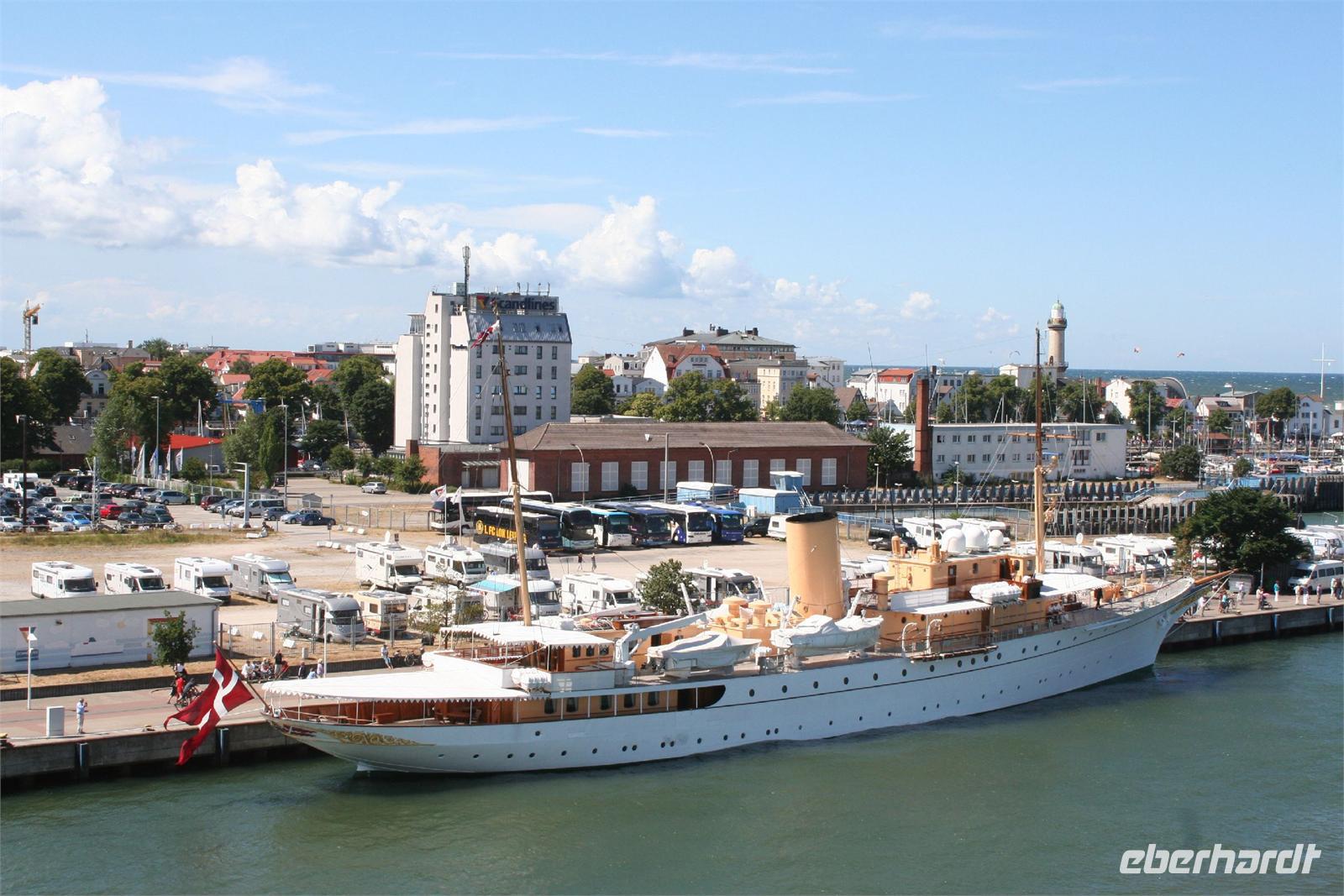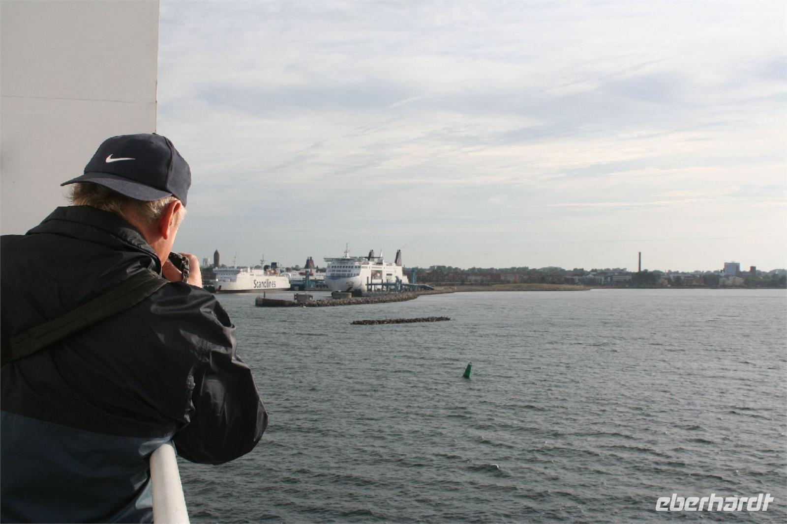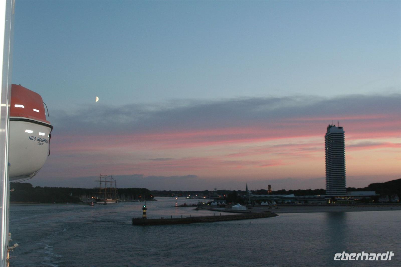 Am letzten Tag mußten wir wieder sehr zeitig aufstehen, ab 6 Uhr gab es Frühstück. Beim Koffer verladen sahen wir noch die letzten "Nachtschwärmer" auf ihrem Nachhauseweg, bevor wir nach Trelleborg zum Fährhafen abfuhren. Pünktlich checkten wir auf der Standardfähre der TT-Line ein, die uns in 6-stündiger Fahrzeit nach Rostock-Warnemünde brachte. Die Fähre ist weniger komfortabel als die Premiumschiffe der TT-Line (Hinfahrt), aber uns wurde nicht langweilig. Gegen Mittag zeigte sich auch die Sonne und wir konnten den Hafeneinlauf in Rostock-Warnemünde von den Sonnendecks betrachten. Das königliche Schiff der Königin Margarete von Dänemark lag im Hafen und am Strand um das Hotel "Neptun" wimmelte es vor Menschen.