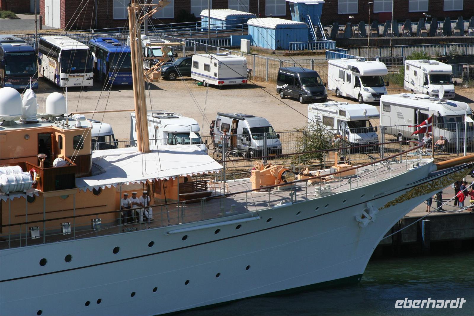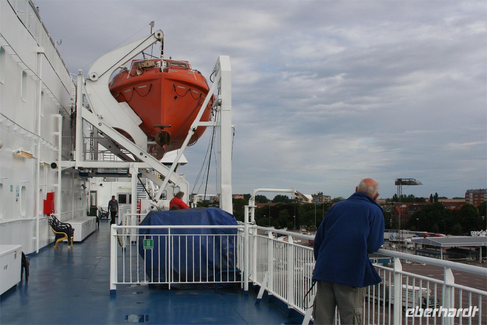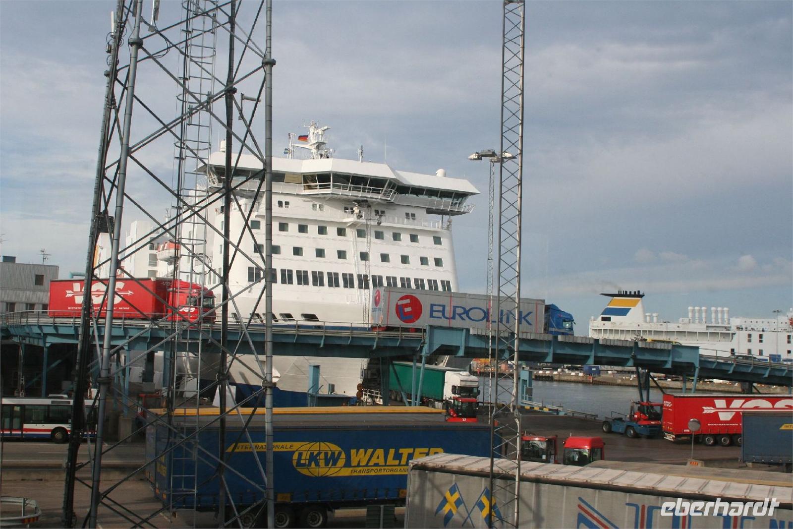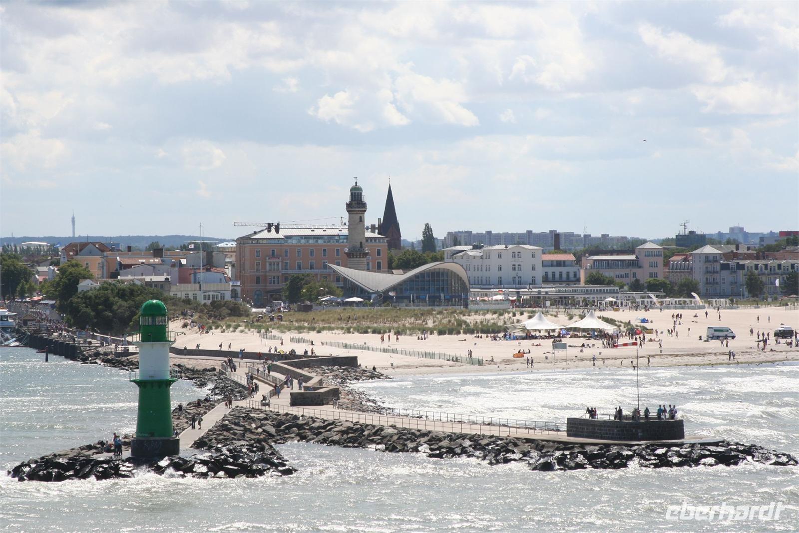Am letzten Tag mußten wir wieder sehr zeitig aufstehen, ab 6 Uhr gab es Frühstück. Beim Koffer verladen sahen wir noch die letzten "Nachtschwärmer" auf ihrem Nachhauseweg, bevor wir nach Trelleborg zum Fährhafen abfuhren. Pünktlich checkten wir auf der Standardfähre der TT-Line ein, die uns in 6-stündiger Fahrzeit nach Rostock-Warnemünde brachte. Die Fähre ist weniger komfortabel als die Premiumschiffe der TT-Line (Hinfahrt), aber uns wurde nicht langweilig. Gegen Mittag zeigte sich auch die Sonne und wir konnten den Hafeneinlauf in Rostock-Warnemünde von den Sonnendecks betrachten. Das königliche Schiff der Königin Margarete von Dänemark lag im Hafen und am Strand um das Hotel "Neptun" wimmelte es vor Menschen.