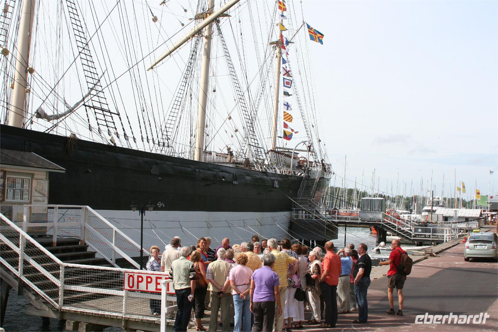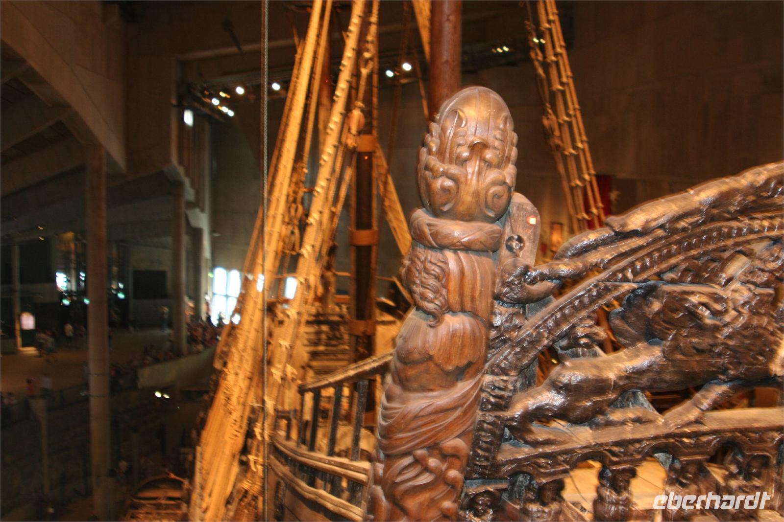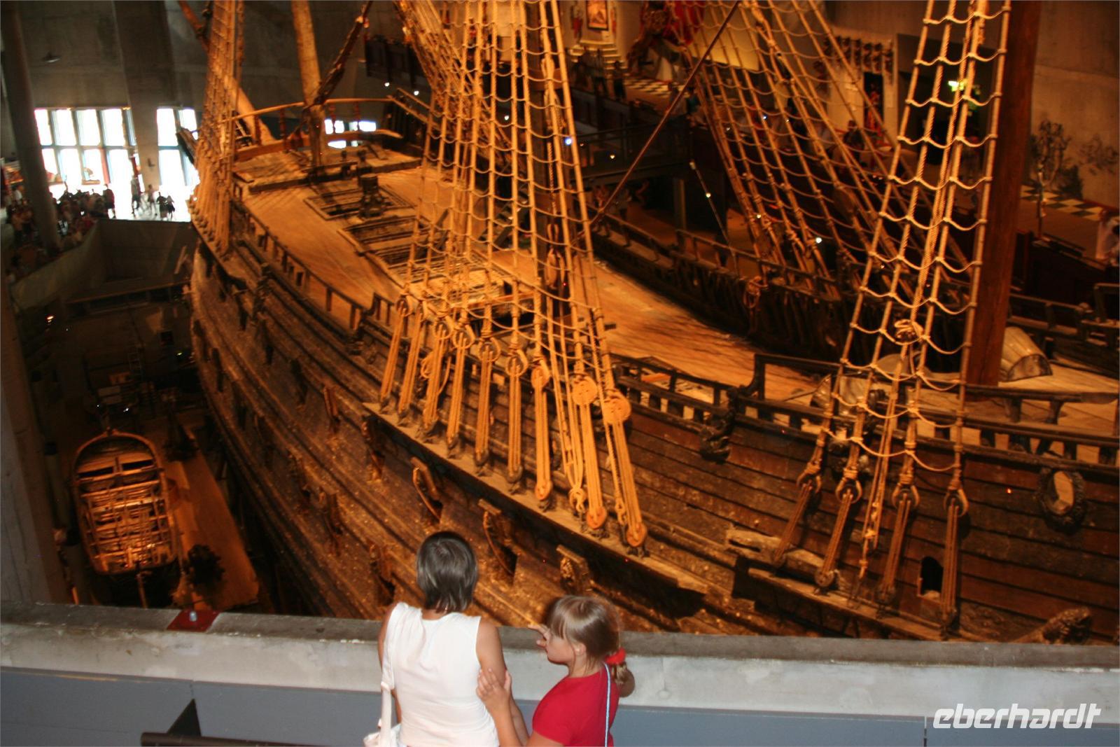 Die Innenstadt Stockholms verteilt sich malerisch auf 14 Inseln. Interessant für uns die Entstehungsgeschichte der Stadt. Nur ein paar Inselchen ragten hier vor 6.000 Jahren aus Wasser. Durch das Schmelzen des Eises hob sich das Land und Stockholm, die "Insel aus Pfählen" entstand. Später, im frühen Mittelalter entwickelte sich Stockholm aufgrund seiner Lage zum Zentrum des Ostseehandels. Direkt am Wasser bummelten wir die Promenade am Strömmen entlang. Am Vormittag fehlen noch die bunten Touristenströme und wir genoßen den einmaligen Blick auf Gamla Stan mit dem Königsschloss. Einige erinnerten sich sofort an die Märchenhochzeit von Kronprinzessin Viktoria und ihrem Daniel, die hier mit dem Boot zum Königsschloss schipperte, wo sie von Tausenden Schweden bejubelt wurden. Über eine kleine Brücke spazierten wir nach Skeppsholmen. Auf dieser kleinen, grünen Insel befinden sich zahlreiche Museen, u.a. das Museum Moderne Kunst, welches zu den besten der Welt gehört. Bunte Skulturen von Niki de Saint Phalle zieren die Parkanlagen. Mit unserem Bus fuhren wir weiter nach Södermalm, auf der anderen Seite des Strömmens. Rene, unser Busfahrer meisterte die verzweigt angelegte Verkehrkreuzung über die Slussen (Schleuse). So mancher hat sich hier schon verfahren! Oberhalb von Södermalm befinden sich herrliche Aussichtsterrassen, deren Ausblicke wir genoßen. Wir entdeckten mehrere Kreuzfahrtschiffe im Hafen, dessen zahlreichen Passagieren wir später noch begegnen sollten. Über Langholmen, einer der grünen Lungen Stockholms, gelangten wir nach Kungsholmen. Schon von weitem sahen wir den goldglänzenden Rathausturm des Stadshuset, aber auch unzählige Touristenbusse, die sich aneinander reihten. Ein kleiner Vorgeschmack auf unseren anschließenden Bummel durch die Altstadt (Gamla stan). Standesgemäß parkte unser Bus direkt vor dem Königsschloss und wurde "bewacht". Wir bummelten durch die engen, mit Kopfstein gepflasterten Gassen zum Stortorget. Der Platz wird umrahmt von bunten Häuserfassaden, die im 17. und 18. Jahrhundert entstanden. Das schönste Haus am Platz ist das der ehemaligen Stockholmer Börse aus dem Jahre 1778, wo heute das Nobelmuseet eingerichtet ist. Nur das obere Geschoss ist für Besucher unzugänglich. Hier beraten die Mitglieder der Schwedischen Akademie geheim über die Auswahl der Nobelpreisträger. Nach der, leider viel zu kurzen Besichtigung der Altstadt fuhren wir nach Djurgarden, der "Freizeitinsel" der Stockholmer. Ab dem 16. Jahrhundert war der "Tiergarten" königliches Jagdrevier. Gleich am Eingang zur Insel ragen 3 mächtige Schiffsmasten aus dem Vasamuseet, vor dem sich "Menschenschlangen" ansammelten. Wir mußten jedoch nicht warten und begaben uns ins Innere. Vor unseren Augen erhob sich das mächtige Flaggschiff "Vasa". König Gustav Vasa hatte dem Bau dieses Schiffes eine bedeutende Rolle in der Schwedischen Kriegsmarine zugedacht. Doch es sollte anders kommen. Bereits auf der Jungfernfahrt der "Vasa" im Jahre 1628 sank das Schiff im Stockholmer Strömmen, nach nur wenigen Metern Seeweg. Nach 333 Jahren wurde das Wrack dann in einer einzigartigen Aktion geborgen. Es dauerte weitere 17 Jahre bis das "größte Puzzle der Welt" (fast 95 % Originalteile konnten verwendet werden!) wieder zusammengesetzt war.