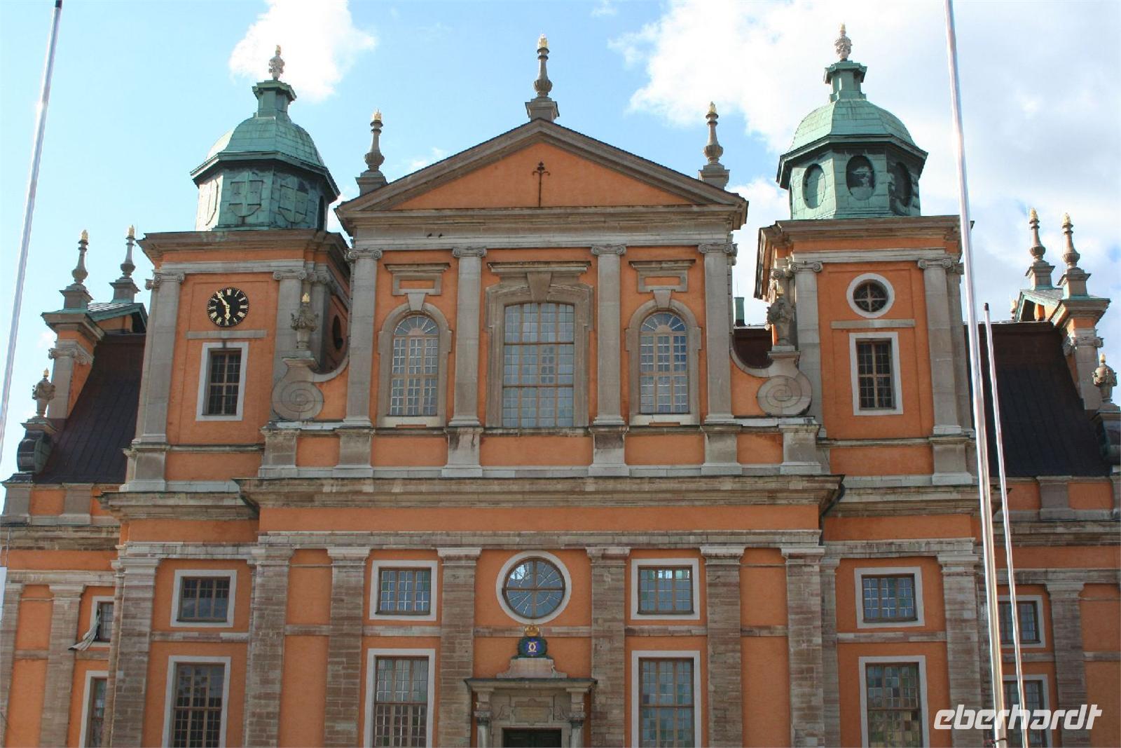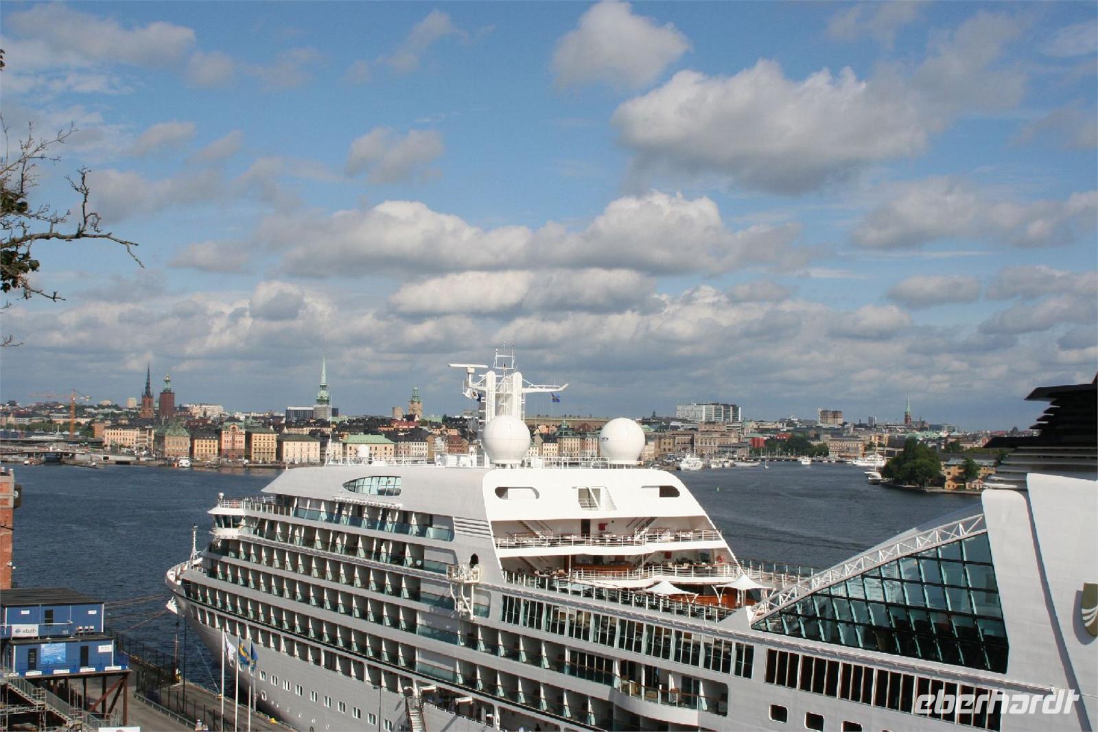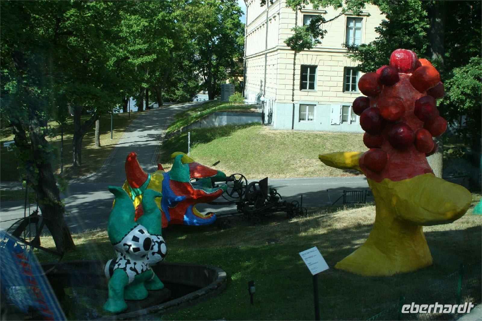 Die Innenstadt Stockholms verteilt sich malerisch auf 14 Inseln. Interessant für uns die Entstehungsgeschichte der Stadt. Nur ein paar Inselchen ragten hier vor 6.000 Jahren aus Wasser. Durch das Schmelzen des Eises hob sich das Land und Stockholm, die "Insel aus Pfählen" entstand. Später, im frühen Mittelalter entwickelte sich Stockholm aufgrund seiner Lage zum Zentrum des Ostseehandels. Direkt am Wasser bummelten wir die Promenade am Strömmen entlang. Am Vormittag fehlen noch die bunten Touristenströme und wir genoßen den einmaligen Blick auf Gamla Stan mit dem Königsschloss. Einige erinnerten sich sofort an die Märchenhochzeit von Kronprinzessin Viktoria und ihrem Daniel, die hier mit dem Boot zum Königsschloss schipperte, wo sie von Tausenden Schweden bejubelt wurden. Über eine kleine Brücke spazierten wir nach Skeppsholmen. Auf dieser kleinen, grünen Insel befinden sich zahlreiche Museen, u.a. das Museum Moderne Kunst, welches zu den besten der Welt gehört. Bunte Skulturen von Niki de Saint Phalle zieren die Parkanlagen. Mit unserem Bus fuhren wir weiter nach Södermalm, auf der anderen Seite des Strömmens. Rene, unser Busfahrer meisterte die verzweigt angelegte Verkehrkreuzung über die Slussen (Schleuse). So mancher hat sich hier schon verfahren! Oberhalb von Södermalm befinden sich herrliche Aussichtsterrassen, deren Ausblicke wir genoßen. Wir entdeckten mehrere Kreuzfahrtschiffe im Hafen, dessen zahlreichen Passagieren wir später noch begegnen sollten. Über Langholmen, einer der grünen Lungen Stockholms, gelangten wir nach Kungsholmen. Schon von weitem sahen wir den goldglänzenden Rathausturm des Stadshuset, aber auch unzählige Touristenbusse, die sich aneinander reihten. Ein kleiner Vorgeschmack auf unseren anschließenden Bummel durch die Altstadt (Gamla stan). Standesgemäß parkte unser Bus direkt vor dem Königsschloss und wurde "bewacht". Wir bummelten durch die engen, mit Kopfstein gepflasterten Gassen zum Stortorget. Der Platz wird umrahmt von bunten Häuserfassaden, die im 17. und 18. Jahrhundert entstanden. Das schönste Haus am Platz ist das der ehemaligen Stockholmer Börse aus dem Jahre 1778, wo heute das Nobelmuseet eingerichtet ist. Nur das obere Geschoss ist für Besucher unzugänglich. Hier beraten die Mitglieder der Schwedischen Akademie geheim über die Auswahl der Nobelpreisträger. Nach der, leider viel zu kurzen Besichtigung der Altstadt fuhren wir nach Djurgarden, der "Freizeitinsel" der Stockholmer. Ab dem 16. Jahrhundert war der "Tiergarten" königliches Jagdrevier. Gleich am Eingang zur Insel ragen 3 mächtige Schiffsmasten aus dem Vasamuseet, vor dem sich "Menschenschlangen" ansammelten. Wir mußten jedoch nicht warten und begaben uns ins Innere. Vor unseren Augen erhob sich das mächtige Flaggschiff "Vasa". König Gustav Vasa hatte dem Bau dieses Schiffes eine bedeutende Rolle in der Schwedischen Kriegsmarine zugedacht. Doch es sollte anders kommen. Bereits auf der Jungfernfahrt der "Vasa" im Jahre 1628 sank das Schiff im Stockholmer Strömmen, nach nur wenigen Metern Seeweg. Nach 333 Jahren wurde das Wrack dann in einer einzigartigen Aktion geborgen. Es dauerte weitere 17 Jahre bis das "größte Puzzle der Welt" (fast 95 % Originalteile konnten verwendet werden!) wieder zusammengesetzt war.