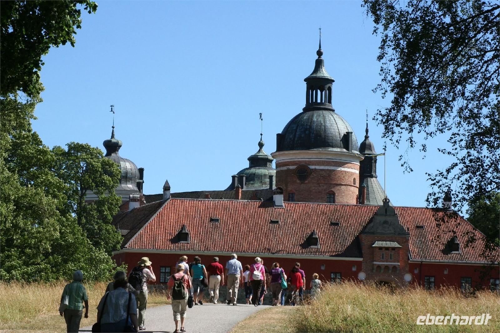 Am Nachmittag erreichten wir Mariefred. Traumhaft, auf einer kleinen Insel im Mälarsee gelegen, erblickten wir schon von Weitem das rote Backsteinschloss. Schloß Gripsholm ist uns, dank Kurt Tucholskys gleichnamigen Romans, bestens bekannt. In diesem Märchenschloss erlebten wir eine ausführliche Führung in zwei Gruppen. Im 14. Jahrhundert ursprünglich als Burg angelegt, liess König Gustav Vasa ab 1537 den heutigen Bau errichten. Beim Rundgang faszinierte uns besonders das Originalmobilar in den Gemächern, die kunstvollen Wandverzierungen und die filigran gearbeiteten Deckentäfelungen. Überall hängen Herrscherporträts, auch Kurfürsten von Sachsen sind darunter zu finden. Auf Schloß Gripsholm befindet sich die umfangreichste staatliche Porträtsammlung. Im Inneren wurde auf helle Beleuchtung verzichtet, das Fotografieren ist untersagt, um diese Schätze noch lange so zu erhalten. Anschließend weilten wir noch am Grab von Kurt Tucholsky, der auf dem Friedhof von Mariefred beigesetzt wurde. Die Grabplatte mit der Inschrift „Alles Vergängliche ist nur ein Gleichnis" aus Goethes Faust II wurde erst nach Ende des 2. Weltkrieges auf Tucholskys Grab gelegt. Am Abend erreichten wir Stockholm, die schwedische Hauptstadt. Für die nächsten 2 Nächte ist das moderne Scandic Hotel Ariadne in Östermalm, am Rande der Stadt, unser „Zuhause". Die Auffahrt mit dem Lift in unsere Zimmer in der 12. und 13. Etage gestaltete sich als spannend und „technisch anspruchsvoll";-). Zum Abendessen wurde für uns ein abwechsungsreiches Buffet vorbereitet, stilles Wasser stand gratis auf unseren Tischen, andere Getränke erhielten wir an der Bar.