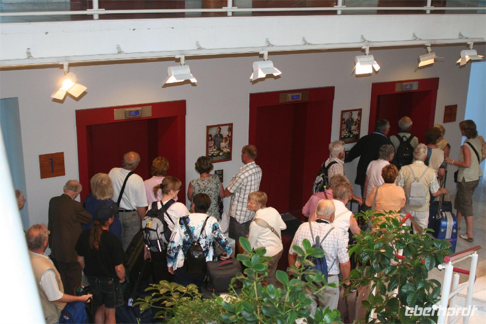 Nach dem zeitigen Frühstück verstauten wir das Gepäck wieder im Bus, was etwas schwierig war, weil der Lift "out of order" anzeigte. Eilige Gäste hatten es zu eilig und so steckte der Lift zwischen 2 Etagen fest, Gott sei Dank ohne Gäste! Die freundlichen Hotelmitarbeiter halfen unkomliziert, so konnten wir pünktlich abfahren. Das Wetter war nicht so sommerlich wie in den letzten Tagen.