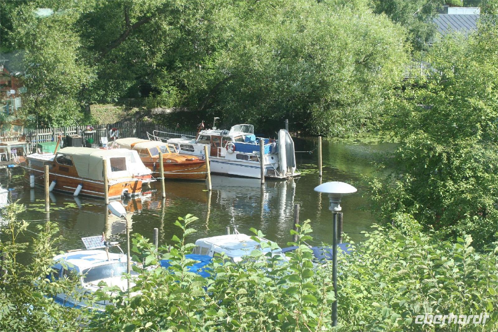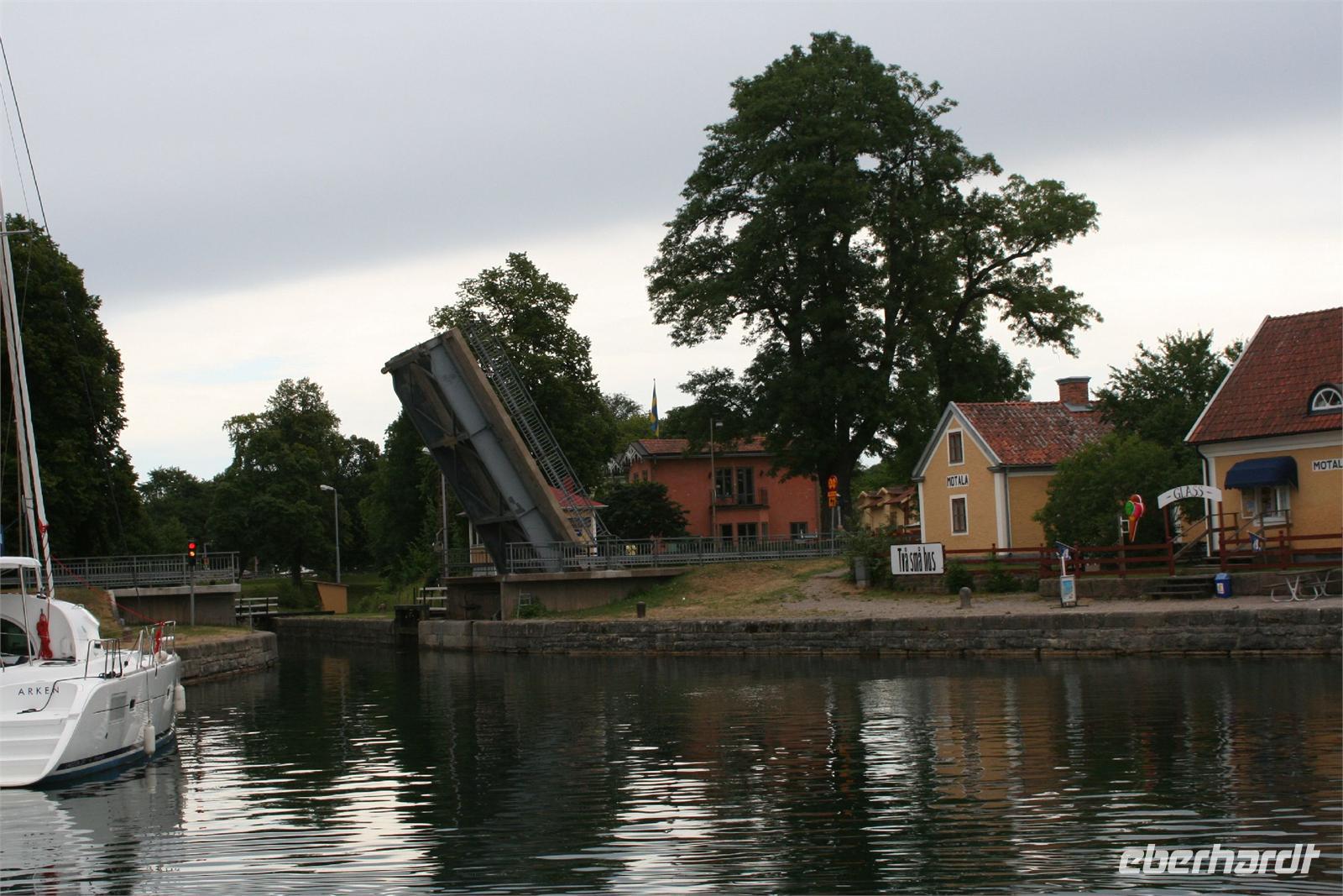 Der Himmel war grau und es war deutlich kühler, aber es regnete nicht. In Motala bestiegen wir unser Schiff "M/S Kung Sverker" und die beschauliche Fahrt durch einen Teil des 190 km langen Göta-Kanals konnte beginnen. Claudia nahm beim Kapitän Platz und erklärte über Lautsprecher die Route und Sehenswürdigkeiten. Unsere Fahrt mit 11 Knoten führte uns von Motala nach Borensberg.
