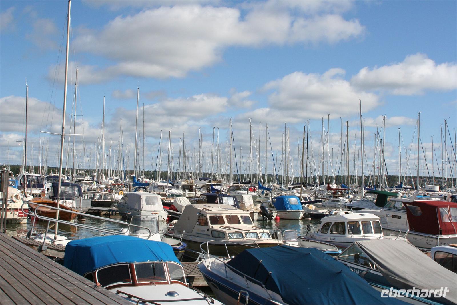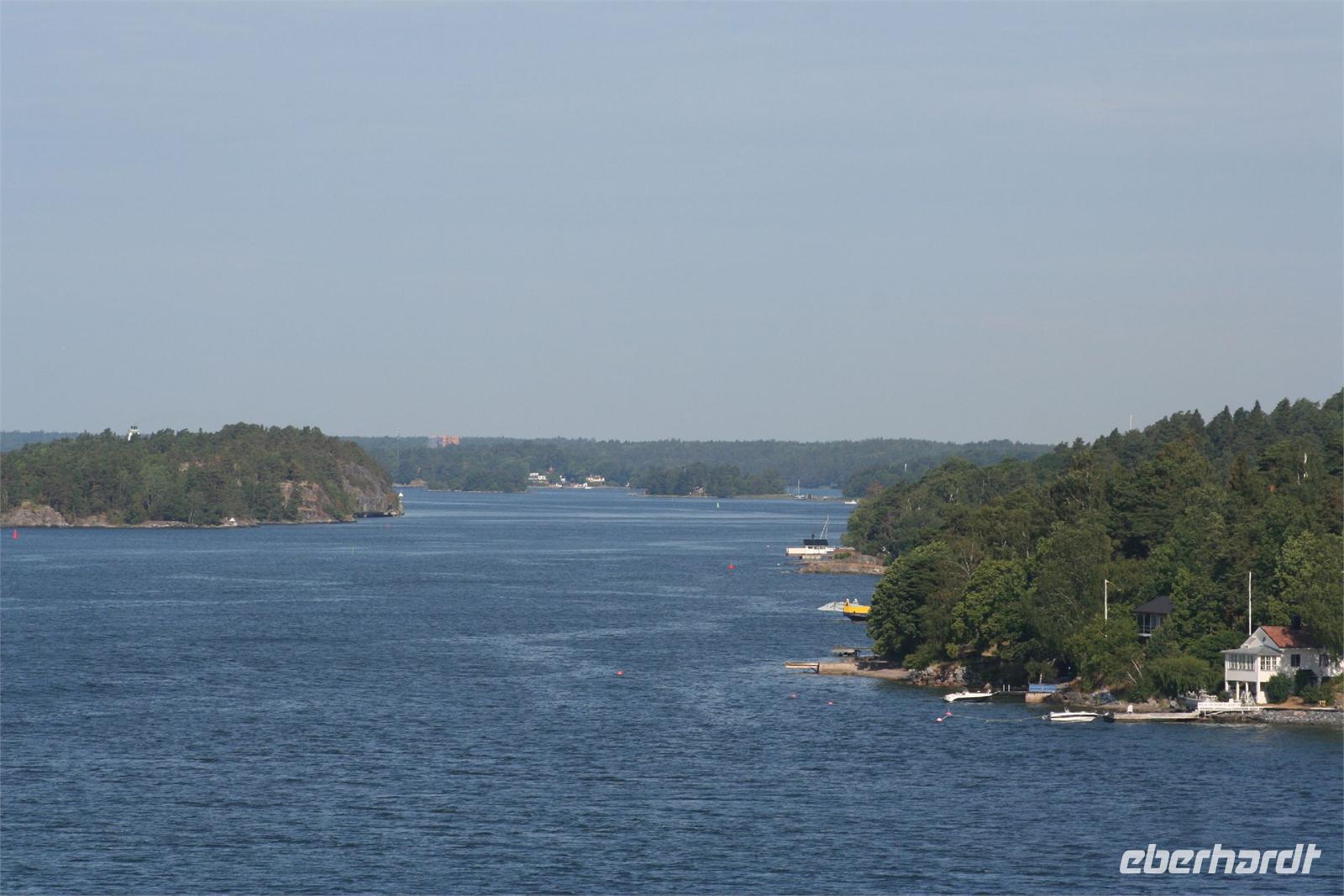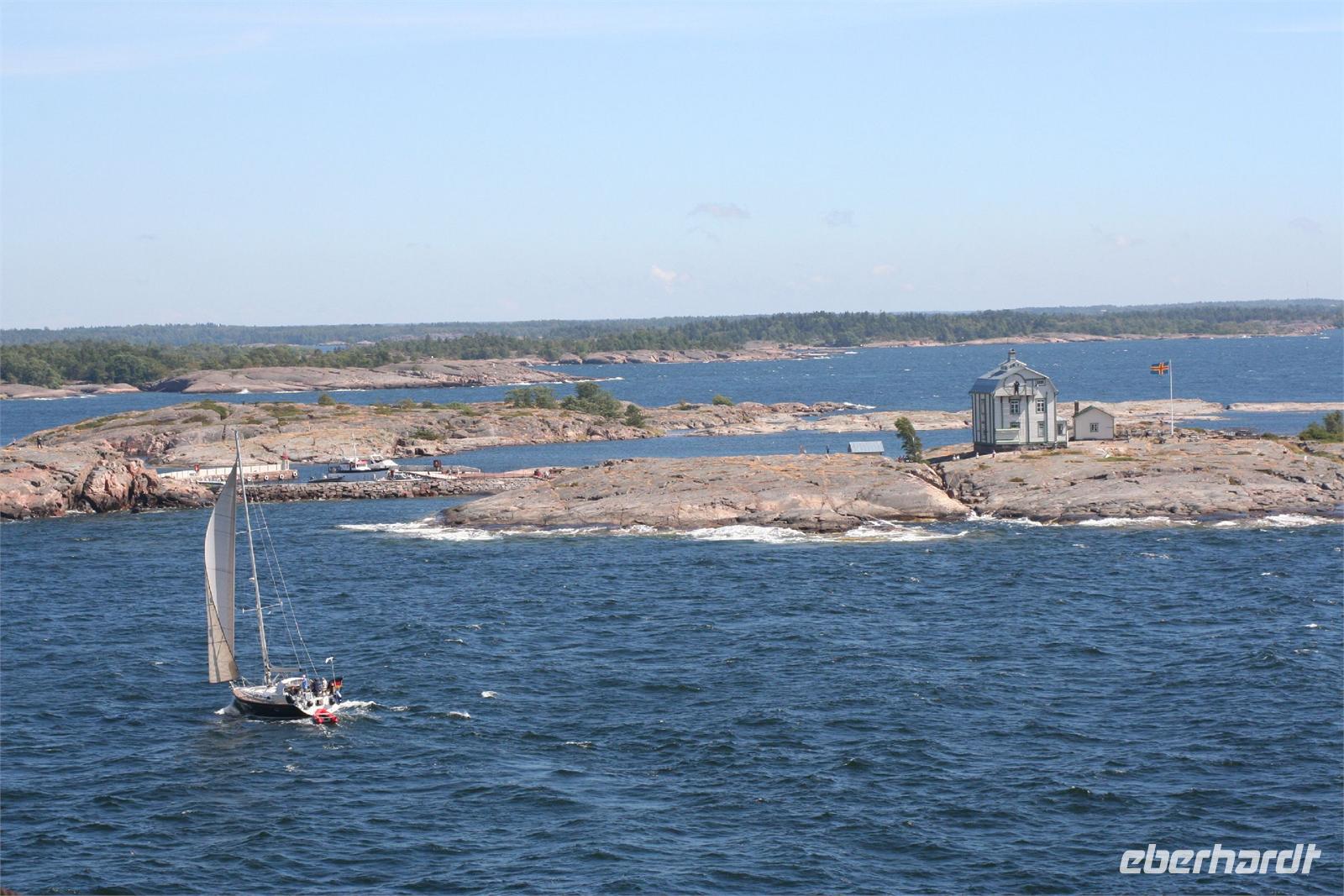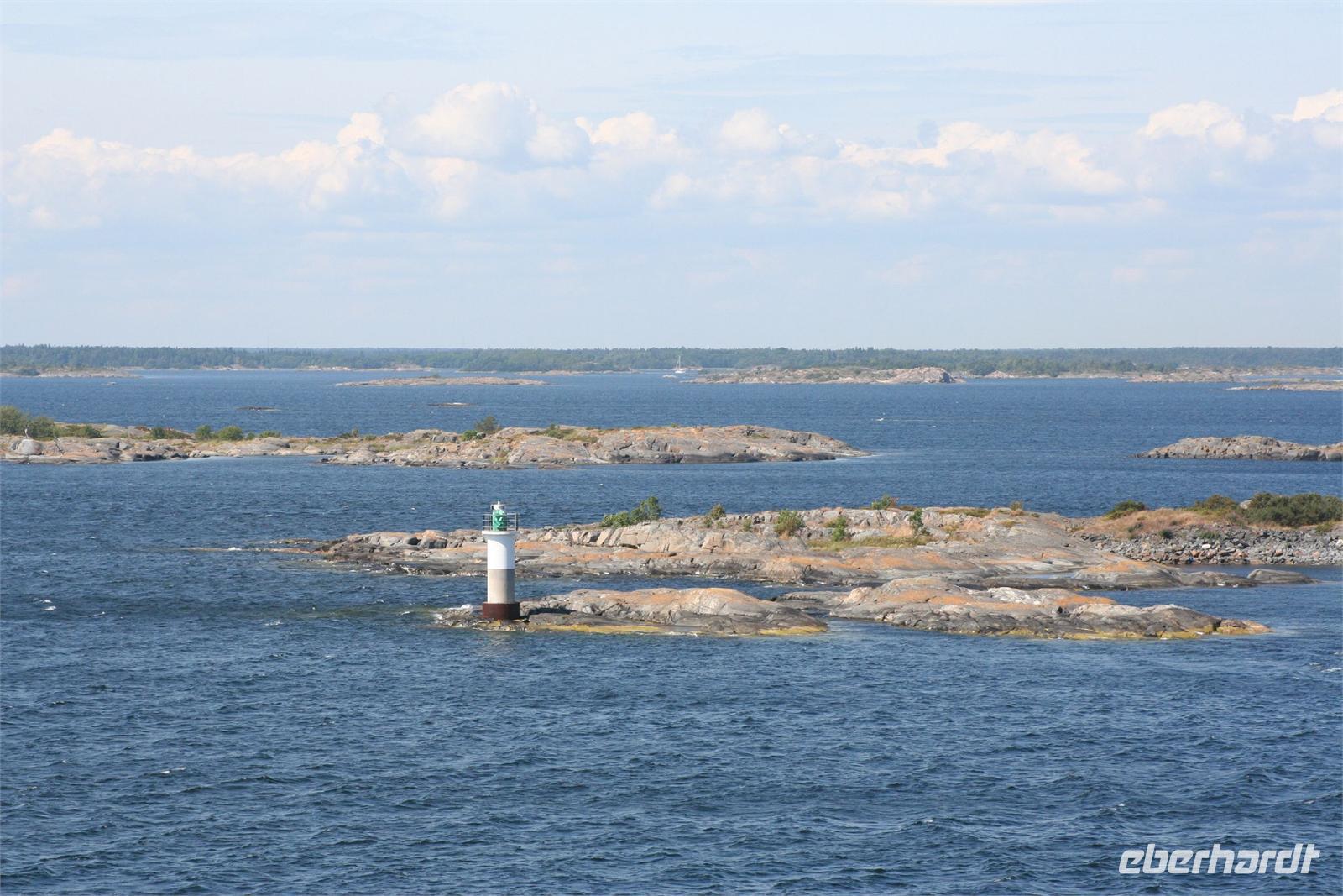Bei Sonnenschein und fast 30 ° C genossen wir eine kurzweilige Schifffahrt auf den Sonnendecks durch eine einmalige Landschaft. Verzaubert betrachteten wir die vielen Inseln, bewohnt oder unbewohnt, durch das sich unser, doch gewaltiges Fährschiff seinen Weg suchte. Immer wieder eröffneten sich für uns neue Fotomotive, die wir in uns aufsaugten. Als die Schären felsiger wurden, war Aland in Sicht. Die kleine Schäre mit dem ehemaligen Lotsenhäuschen signalisierte die Hafeneinfahrt von Mariehamn, der einzigen richtigen Stadt auf den Aland-Inseln.