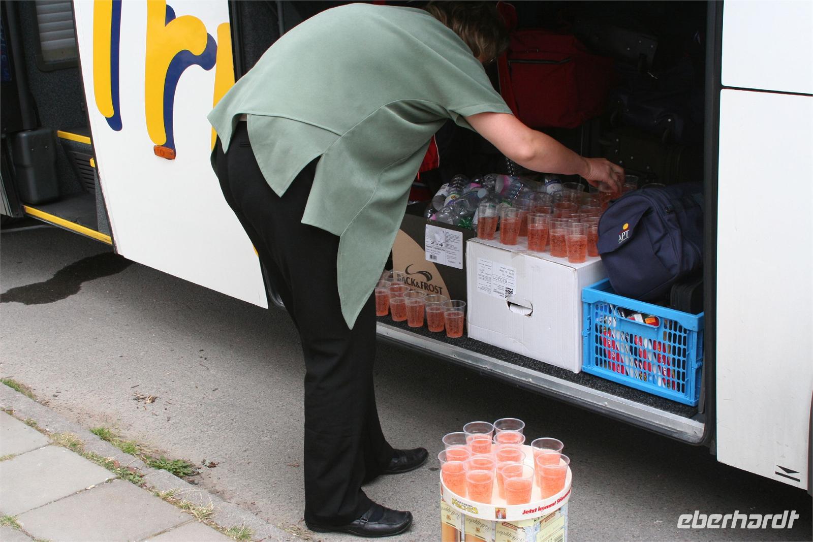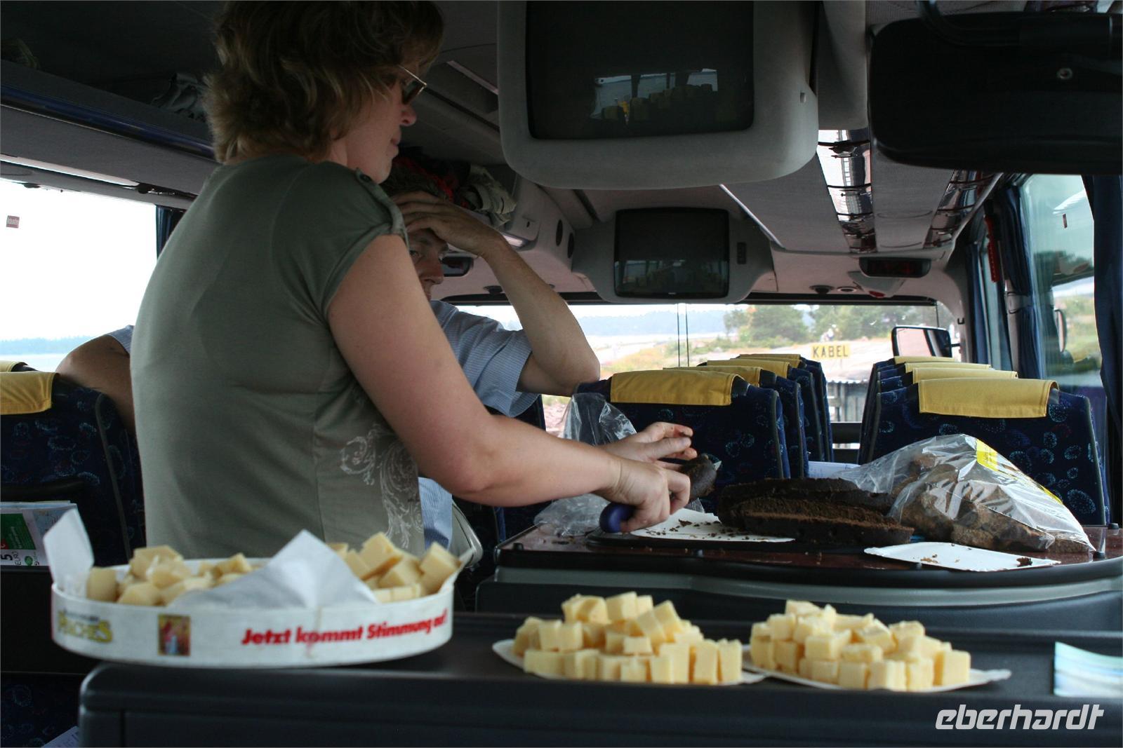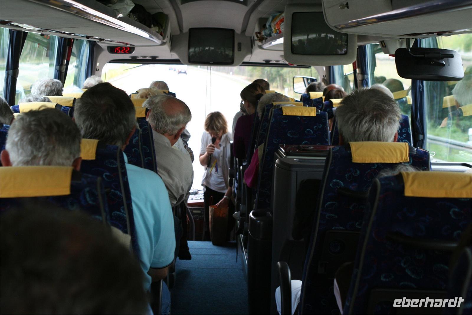Mit dem Bus traten wir dann unsere Heimreise an, die sich durch Staus etwas verzögerte. Die Zeit im Bus vertrieben wir uns mit einem Ratespiel. Die Frage: Wieviel Bus-Kilometer bewältigten wir auf dieser Reise, konnten einige Reisegäste fast genau beantworten (3.313 km) und wurden dafür mit kleinen Mitbringseln wie Vasa-Knäckebrot prämiert. Claudia erzählte uns noch die obligatorische Gute-Nacht-Geschichte, die sie uns jeden Abend präsentierte.