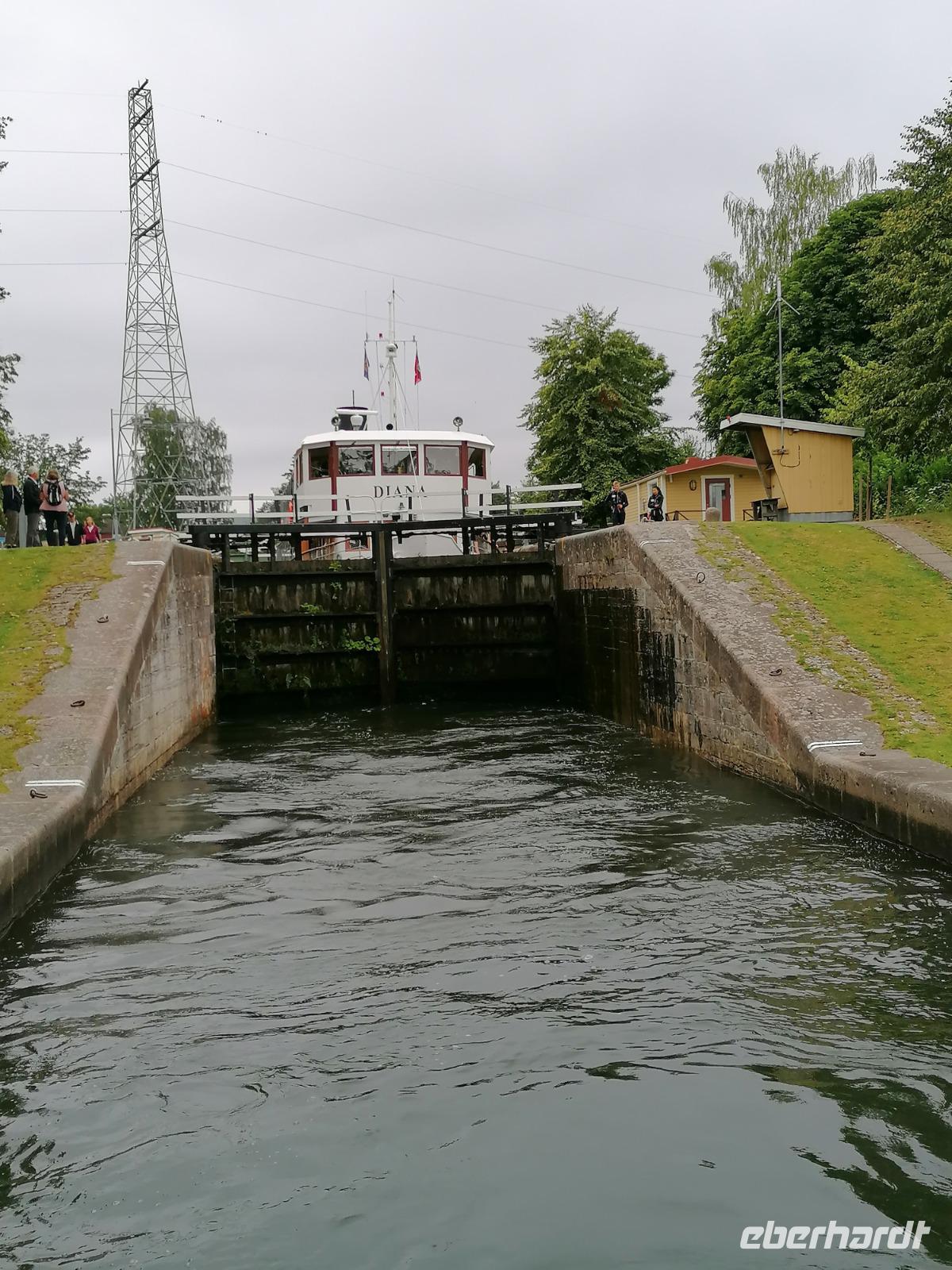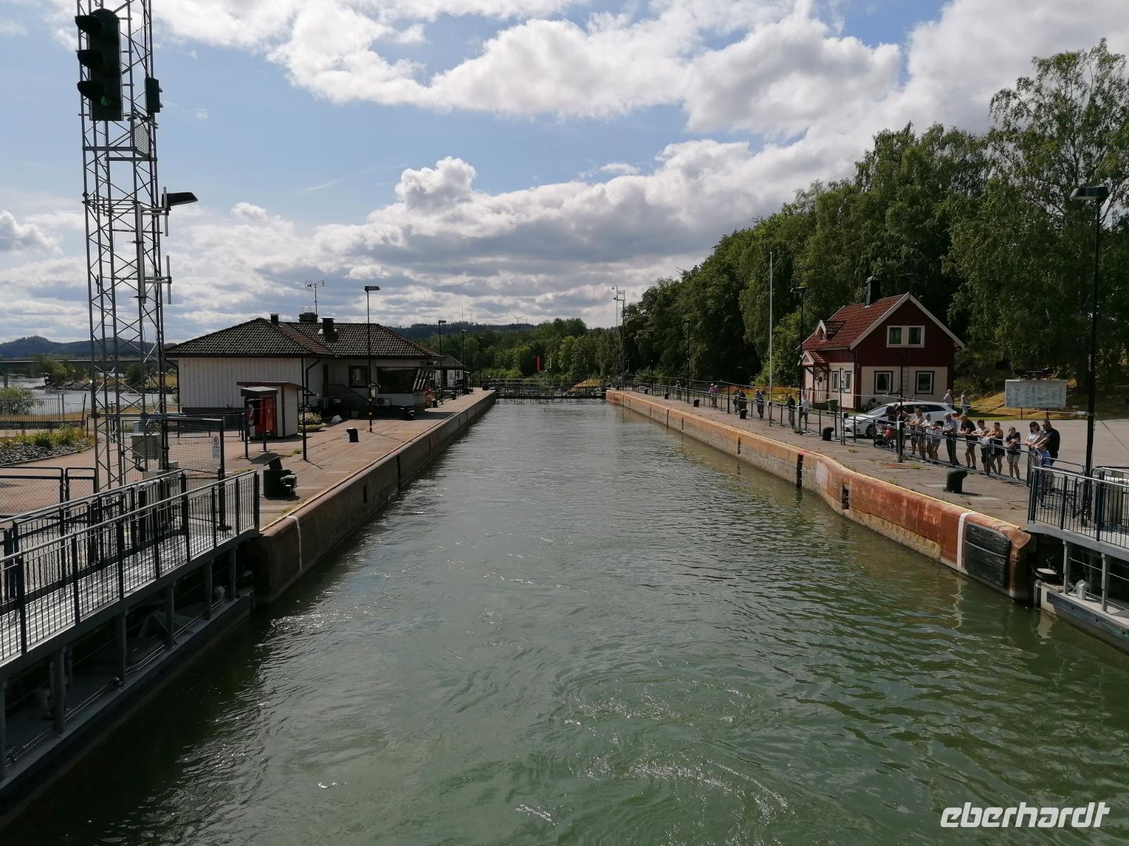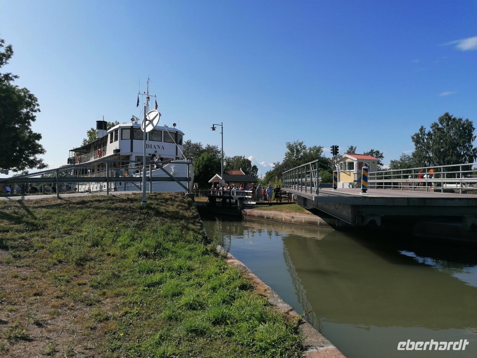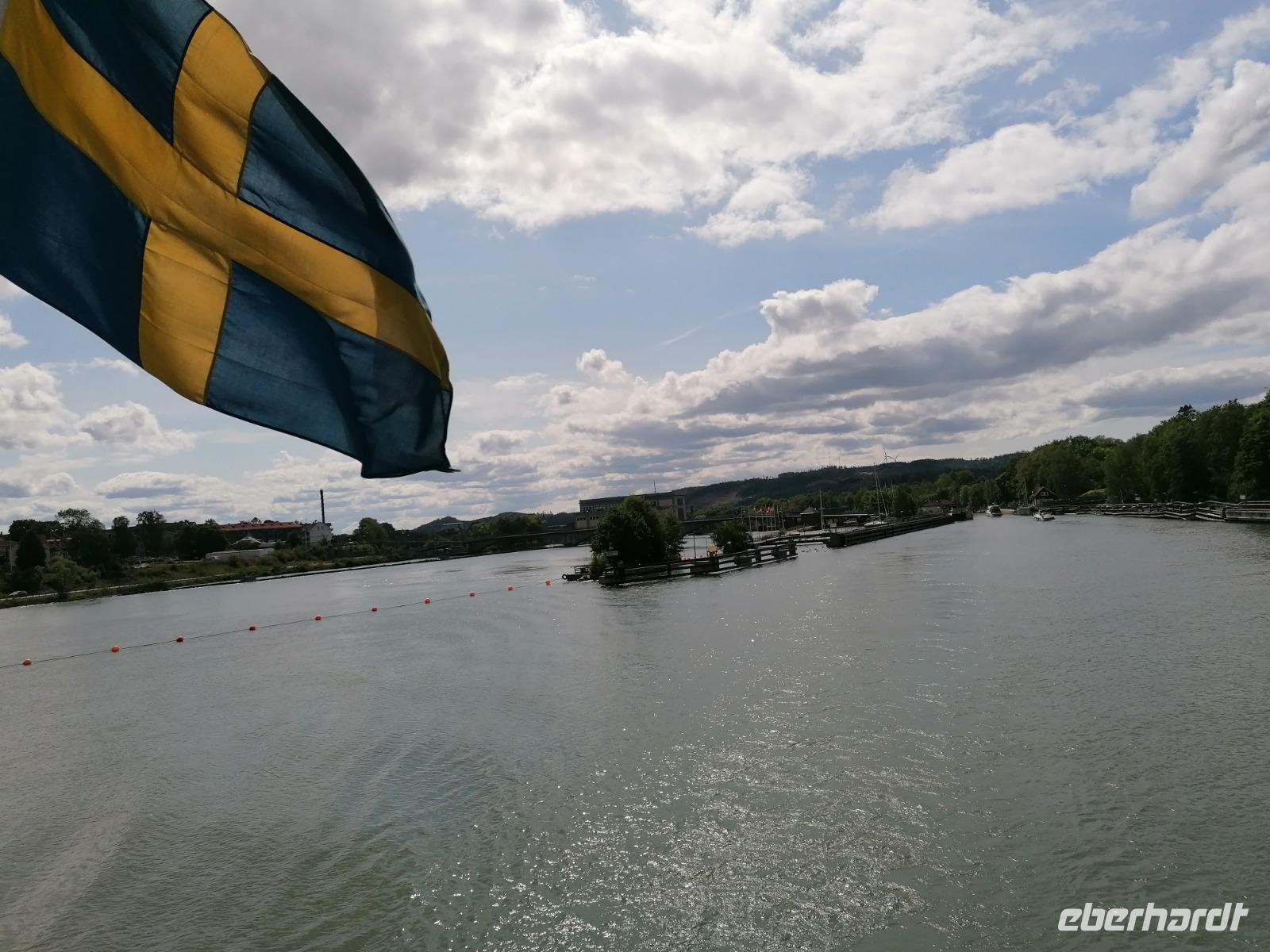 Auch heute starteten wir mit einem umfangreichen skandinavischen Frühstück, bevor es hieß Koffer packen und Leinen los. Mit einem Bus fuhren wir in Richtung Terminal, wo die MS Diana schon auf uns wartete. Die Bordcrew und unsere Reiseleiterin Susan erwartete uns schon vor dem Schiff. Nach einem kurzen Kennenlernen wurden unsere Koffer auf unsere Kabinen gebracht und wir trafen uns auf dem Oberdeck, um die schwedische Süßigkeit Wienerbröd, im Deutschen vergleichbar mit Puddingplunder, zu probieren. Dazu wurde Kaffee serviert. Dann hieß es endlich Leinen los und wie begann unsere Kreuzfahrt auf dem Göta-Kanal. Zunächst hatten wir auf den Göta Fluss und konnten es uns an Oberdeck gemütlich machen. Um die Mittagszeit gab es ein Begrüßungsmeeting. Hier lernten wir die Crew und die Regeln auf dem Schiff kennen. Alle Crewmitglieder waren sehr hilfsbereit und freundlich und wir fühlten uns sofort willkommen. Im Anschluss wurde ein zwei Gänge Mittagessen serviert, wo wird die erste Kostprobe von den fantastischen Fähigkeiten des Kochs kennenlernen durften. Nach dem Mittagessen passierten wir die erste Schleuse Lilla Edet. Am Nachmittag erreichten wir schließlich die Schleusen von Trollhättan. Hier besuchten wir mit Susan das Kanalmuseum und konnten etwas Freizeit einschleusen verbringen. Wir spazierten die alten Schleusen Treppen hinunter, die aus dem Beginn des 19. Jahrhundert stammen. Zurück an Bord hatten wir etwas Freizeit bevor wir um 19 Uhr zum Abendessen gerufen wurden. Zunächst stellte sich noch unser Kapitän vor und wir stoßen mit einem Sekt auf die gemeinsame Zeit am Göta-Kanal an. Nachdem bekommst Sekt gab es dann ein 3-Gänge Abendessen. Am Abend erreichten wir Vänersborg, wo wir heute über Nacht hier. Gemeinsam machten wir noch einen Abendspaziergang entlang des Kanals, bevor wir glücklich aber zufrieden ins Bett fielen.