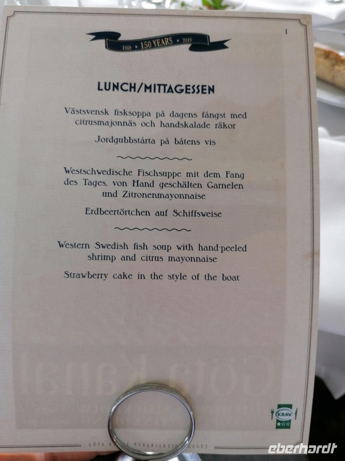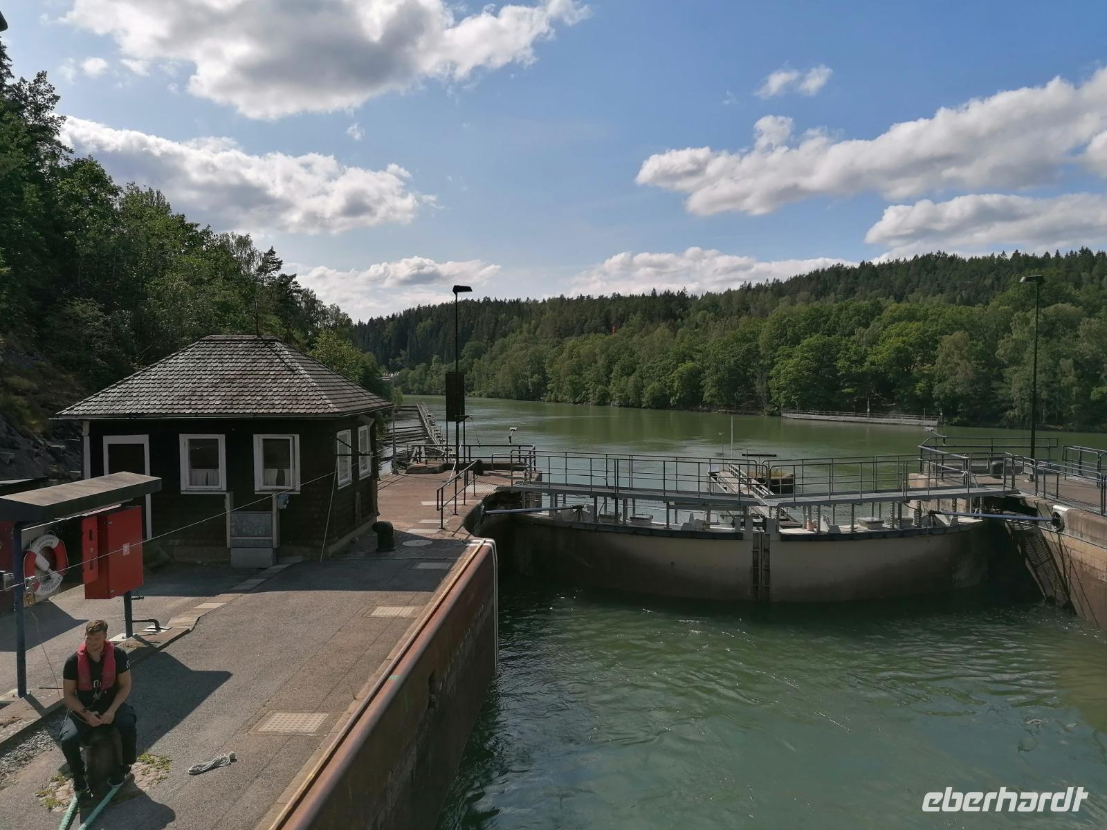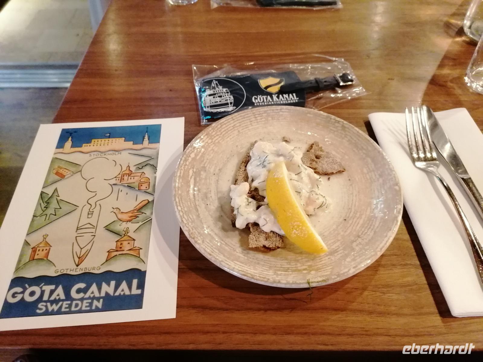 Auch heute starteten wir mit einem umfangreichen skandinavischen Frühstück, bevor es hieß Koffer packen und Leinen los. Mit einem Bus fuhren wir in Richtung Terminal, wo die MS Diana schon auf uns wartete. Die Bordcrew und unsere Reiseleiterin Susan erwartete uns schon vor dem Schiff. Nach einem kurzen Kennenlernen wurden unsere Koffer auf unsere Kabinen gebracht und wir trafen uns auf dem Oberdeck, um die schwedische Süßigkeit Wienerbröd, im Deutschen vergleichbar mit Puddingplunder, zu probieren. Dazu wurde Kaffee serviert. Dann hieß es endlich Leinen los und wie begann unsere Kreuzfahrt auf dem Göta-Kanal. Zunächst hatten wir auf den Göta Fluss und konnten es uns an Oberdeck gemütlich machen. Um die Mittagszeit gab es ein Begrüßungsmeeting. Hier lernten wir die Crew und die Regeln auf dem Schiff kennen. Alle Crewmitglieder waren sehr hilfsbereit und freundlich und wir fühlten uns sofort willkommen. Im Anschluss wurde ein zwei Gänge Mittagessen serviert, wo wird die erste Kostprobe von den fantastischen Fähigkeiten des Kochs kennenlernen durften. Nach dem Mittagessen passierten wir die erste Schleuse Lilla Edet. Am Nachmittag erreichten wir schließlich die Schleusen von Trollhättan. Hier besuchten wir mit Susan das Kanalmuseum und konnten etwas Freizeit einschleusen verbringen. Wir spazierten die alten Schleusen Treppen hinunter, die aus dem Beginn des 19. Jahrhundert stammen. Zurück an Bord hatten wir etwas Freizeit bevor wir um 19 Uhr zum Abendessen gerufen wurden. Zunächst stellte sich noch unser Kapitän vor und wir stoßen mit einem Sekt auf die gemeinsame Zeit am Göta-Kanal an. Nachdem bekommst Sekt gab es dann ein 3-Gänge Abendessen. Am Abend erreichten wir Vänersborg, wo wir heute über Nacht hier. Gemeinsam machten wir noch einen Abendspaziergang entlang des Kanals, bevor wir glücklich aber zufrieden ins Bett fielen.