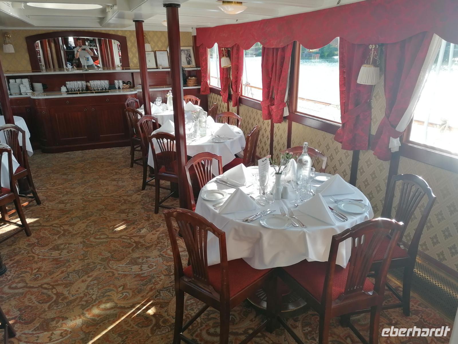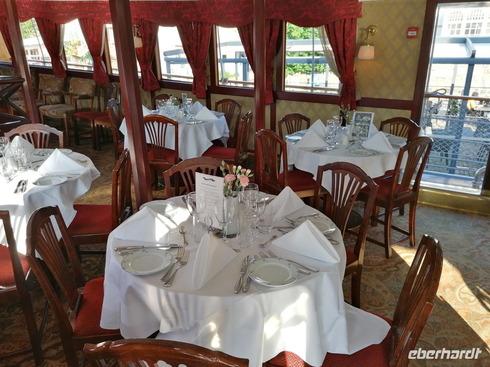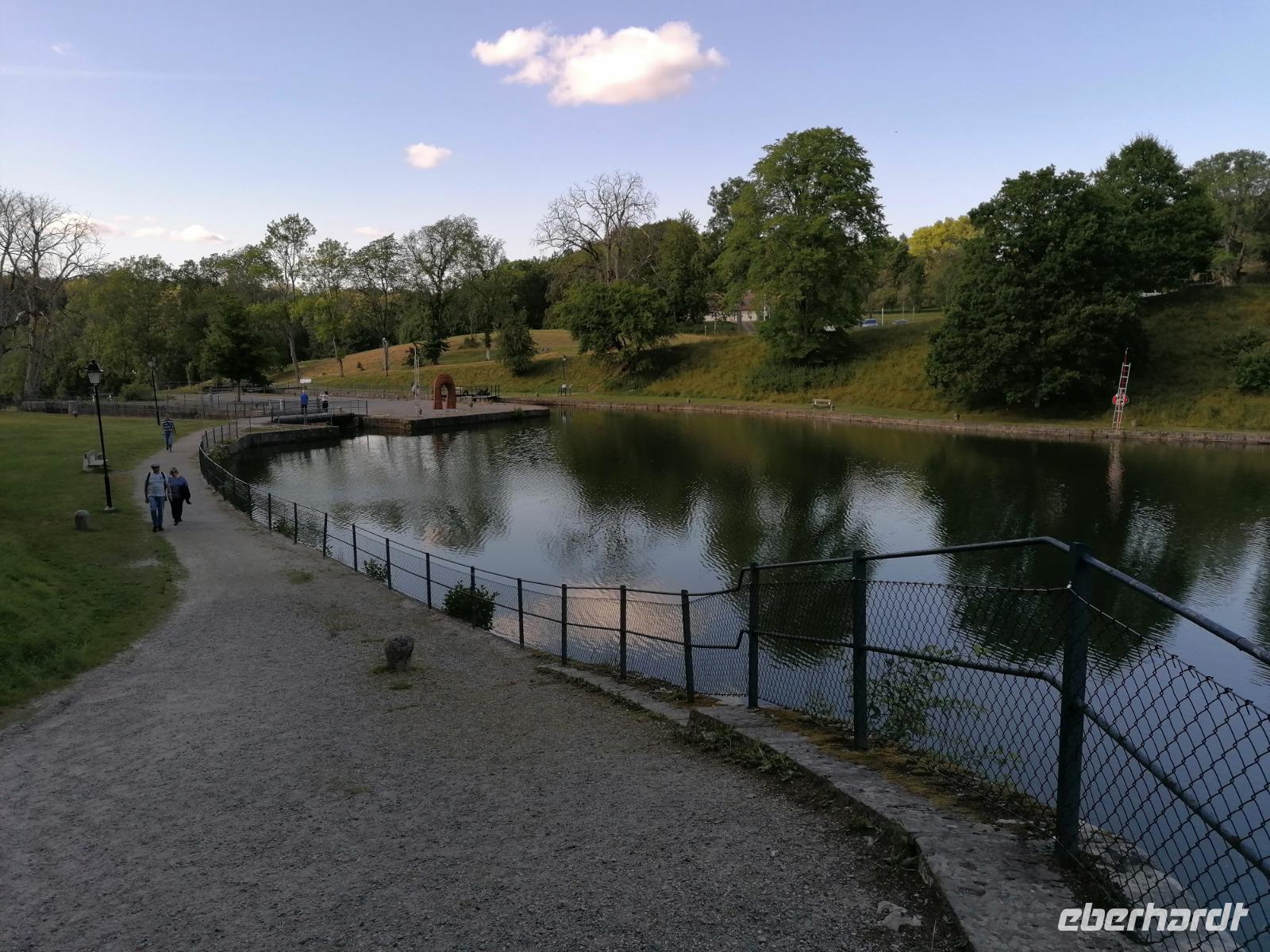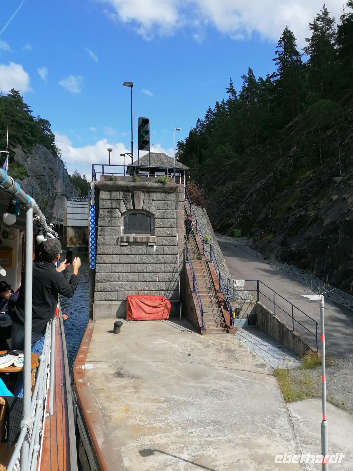 Auch heute starteten wir mit einem umfangreichen skandinavischen Frühstück, bevor es hieß Koffer packen und Leinen los. Mit einem Bus fuhren wir in Richtung Terminal, wo die MS Diana schon auf uns wartete. Die Bordcrew und unsere Reiseleiterin Susan erwartete uns schon vor dem Schiff. Nach einem kurzen Kennenlernen wurden unsere Koffer auf unsere Kabinen gebracht und wir trafen uns auf dem Oberdeck, um die schwedische Süßigkeit Wienerbröd, im Deutschen vergleichbar mit Puddingplunder, zu probieren. Dazu wurde Kaffee serviert. Dann hieß es endlich Leinen los und wie begann unsere Kreuzfahrt auf dem Göta-Kanal. Zunächst hatten wir auf den Göta Fluss und konnten es uns an Oberdeck gemütlich machen. Um die Mittagszeit gab es ein Begrüßungsmeeting. Hier lernten wir die Crew und die Regeln auf dem Schiff kennen. Alle Crewmitglieder waren sehr hilfsbereit und freundlich und wir fühlten uns sofort willkommen. Im Anschluss wurde ein zwei Gänge Mittagessen serviert, wo wird die erste Kostprobe von den fantastischen Fähigkeiten des Kochs kennenlernen durften. Nach dem Mittagessen passierten wir die erste Schleuse Lilla Edet. Am Nachmittag erreichten wir schließlich die Schleusen von Trollhättan. Hier besuchten wir mit Susan das Kanalmuseum und konnten etwas Freizeit einschleusen verbringen. Wir spazierten die alten Schleusen Treppen hinunter, die aus dem Beginn des 19. Jahrhundert stammen. Zurück an Bord hatten wir etwas Freizeit bevor wir um 19 Uhr zum Abendessen gerufen wurden. Zunächst stellte sich noch unser Kapitän vor und wir stoßen mit einem Sekt auf die gemeinsame Zeit am Göta-Kanal an. Nachdem bekommst Sekt gab es dann ein 3-Gänge Abendessen. Am Abend erreichten wir Vänersborg, wo wir heute über Nacht hier. Gemeinsam machten wir noch einen Abendspaziergang entlang des Kanals, bevor wir glücklich aber zufrieden ins Bett fielen.