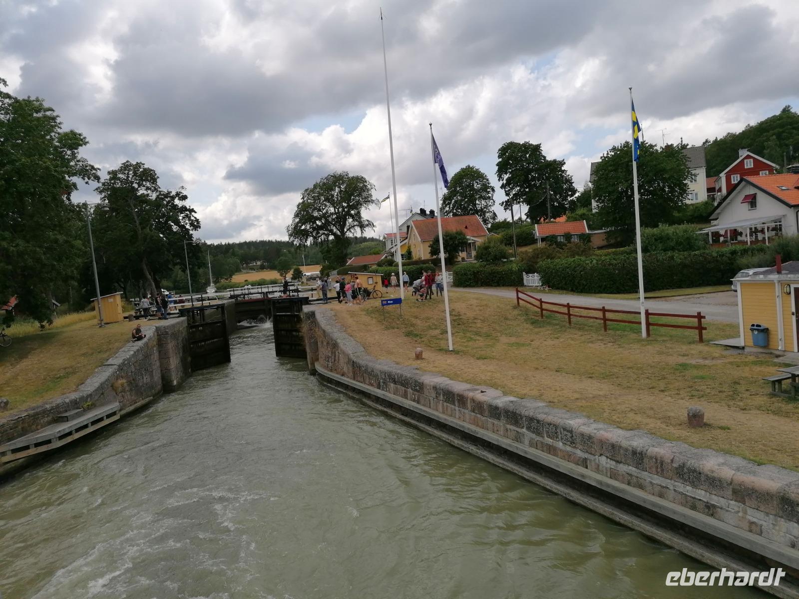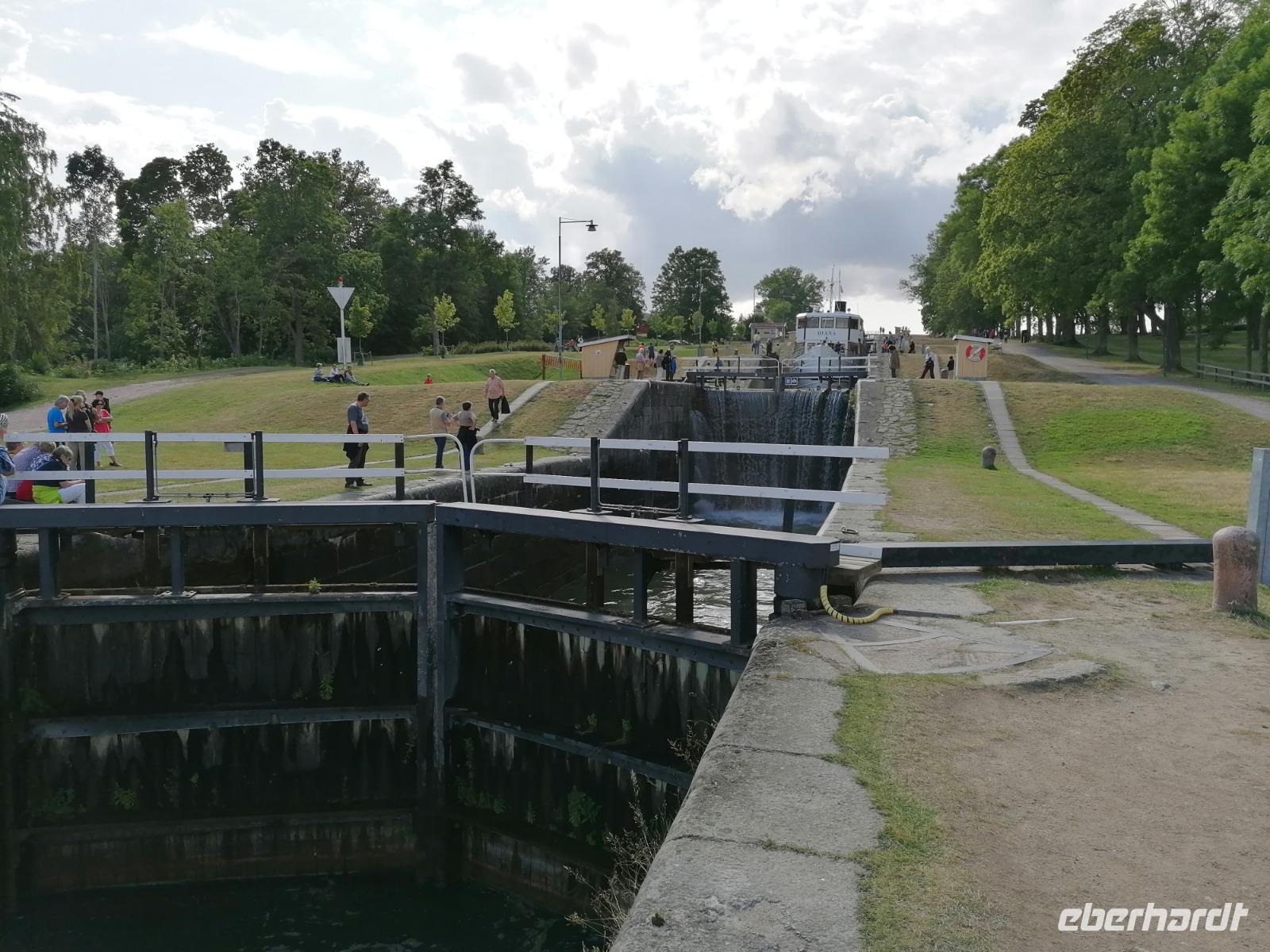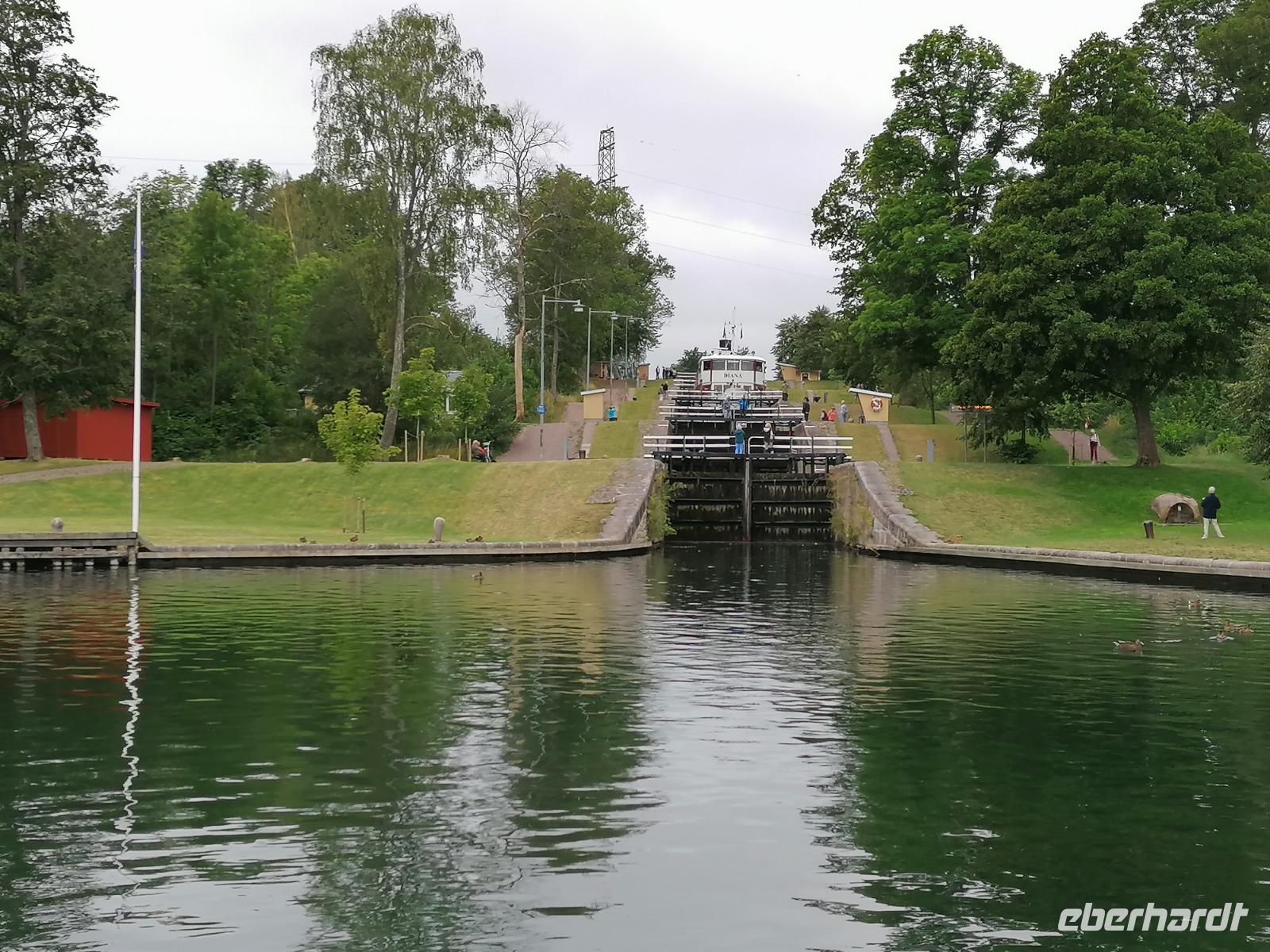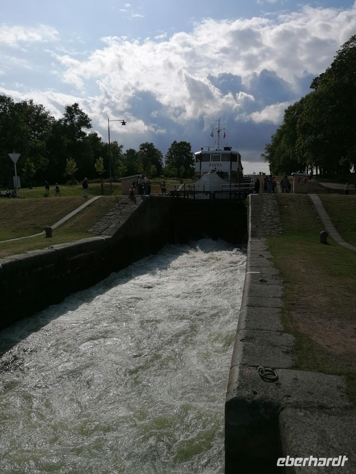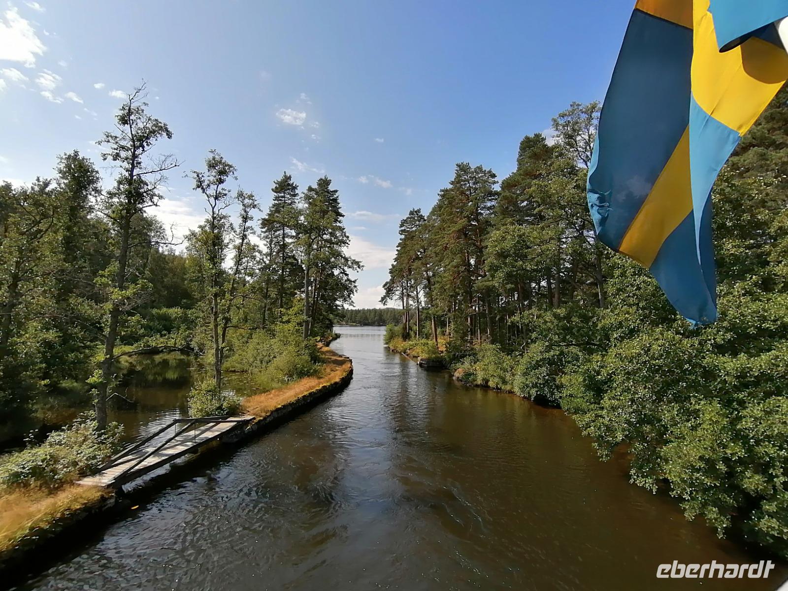 In der Schleuse von Klämman nahmen wir heute unser Frühstück zu uns. Wie immer konnten wir im Speisesaal oder auf dem Oberdeck frühstücken. Nach dem Frühstück oder früh eine Infoveranstaltung anberaumt. Nachdem zusammen uns weitere Informationen über den Göta-Kanal gegeben hatte, verteilte sie Stadtkarten von Söderköping und er läutete uns im Tagesablauf von heute. Unser erster Stopp erfolgte an der Oberschleuse von Carlsborg. Hier beginnt eine Folge von acht aufeinanderfolgenden Schleusen. Heute hatten wir sogar etwas Gegenverkehr, so dass das schleusen etwas länger dauert. In der Zwischenzeit spazierten wir bis zur vierten Schleuse neben dem Boot her. Zurück an Bord fuhren wir weiter nach Söderköping. Sie gab es etwas Freizeit in der idyllischen Stadt den Anfang des 13 Jahrhunderts gegründet wurde. Während der Hansezeit war die Stadt von großer Bedeutung. Heute ist der kleine Kurort vor allem bekannt für seine vielen und guten Eisdielen. Diese lernt natürlich gemeinsam kennen und probiert den das köstliche Eis. Nach der kleinen Erfrischung machten wir einen kleinen Stadtrundgang. Wir spazierten durch die romantische Kleinstadt bis hin zur Kathedrale. Im Anschluss hatten wir etwas Zeit zur freien Verfügung, welche wir zum Shoppen nutzten. Zurück an Bord gab es zunächst einmal Mittagessen. Während des Essens verließen wir den Göta-Kanal und fuhren auf die Ostsee hinaus. Nach einer kleinen Fahrt erreichten wir Stegeborg. Auf einer kleinen Insel an der Ostsee Bucht liegt die ehemalige Schlossruine Stegeborg. Susan führte uns herum und klärt uns über die Geschichte der alten Ruine und der Kräutergärten auf. Das Schloss war früher der Schlüssel zum Göta-Kanal und man musste es passieren, wenn man zum Göta-Kanal wollte. Heute Abend stand ein kleiner Sektumtrunk auf dem Programm. Beim anschließenden Captains Dinner, konnten wir noch mal in vollen Zügen das leckere Essen an Bord genießen. Nach dem Essen wurde die Crew nochmals vorgestellt und wir konnten uns für tüchtige Arbeit bedanken. Unser Nachtquartier verlegten wir heute auf die Insel Sävsundet. Beim privaten Anlegesteg gab es die Möglichkeit schwimmen zu gehen oder einen Spaziergang, um die Insel zu machen. Ein toller letzter Tag ging inmitten einer romantischen Atmosphäre zu Ende.