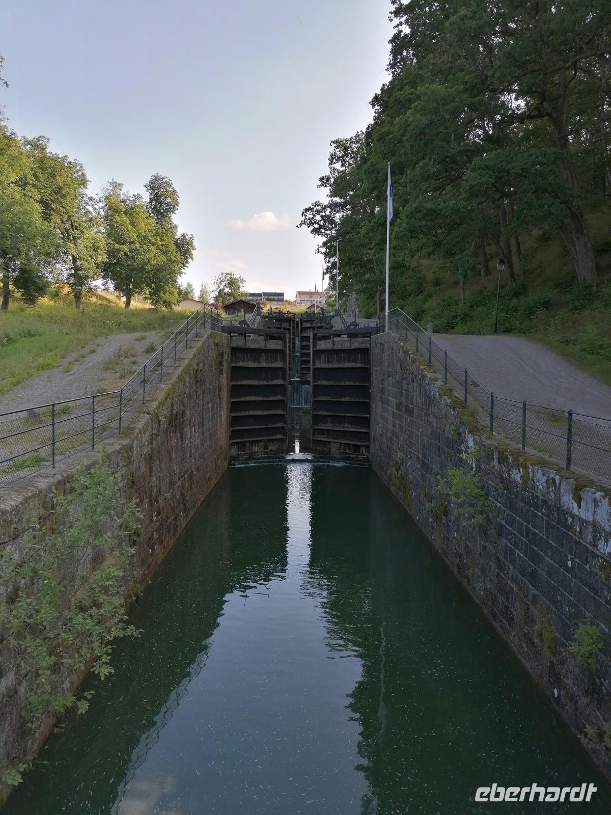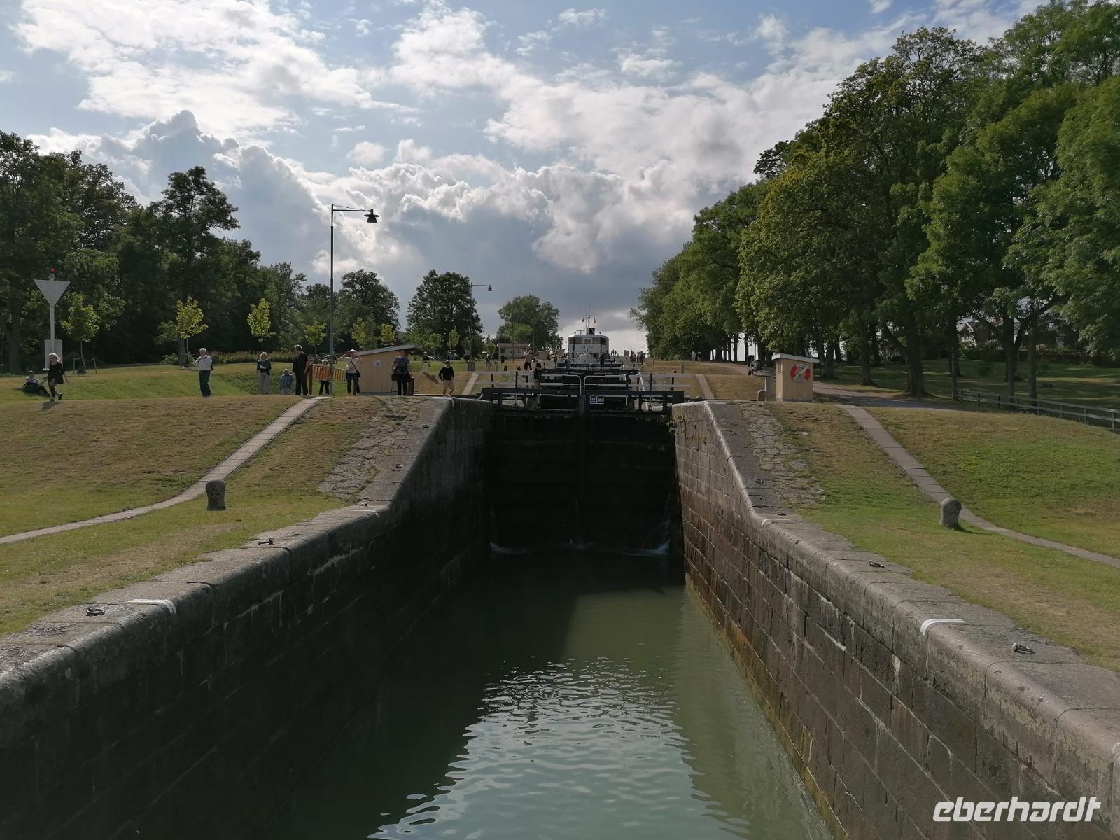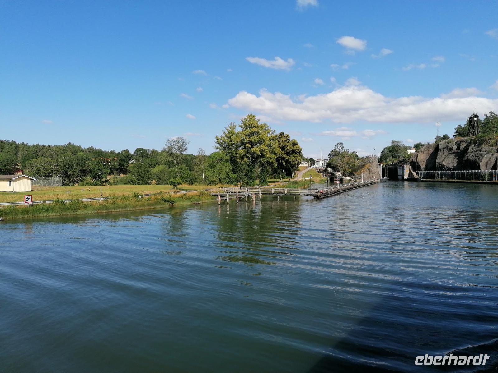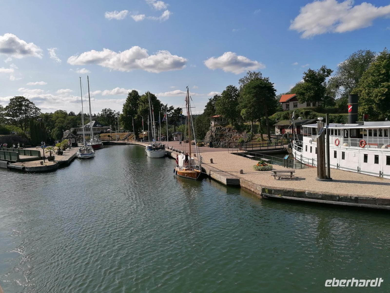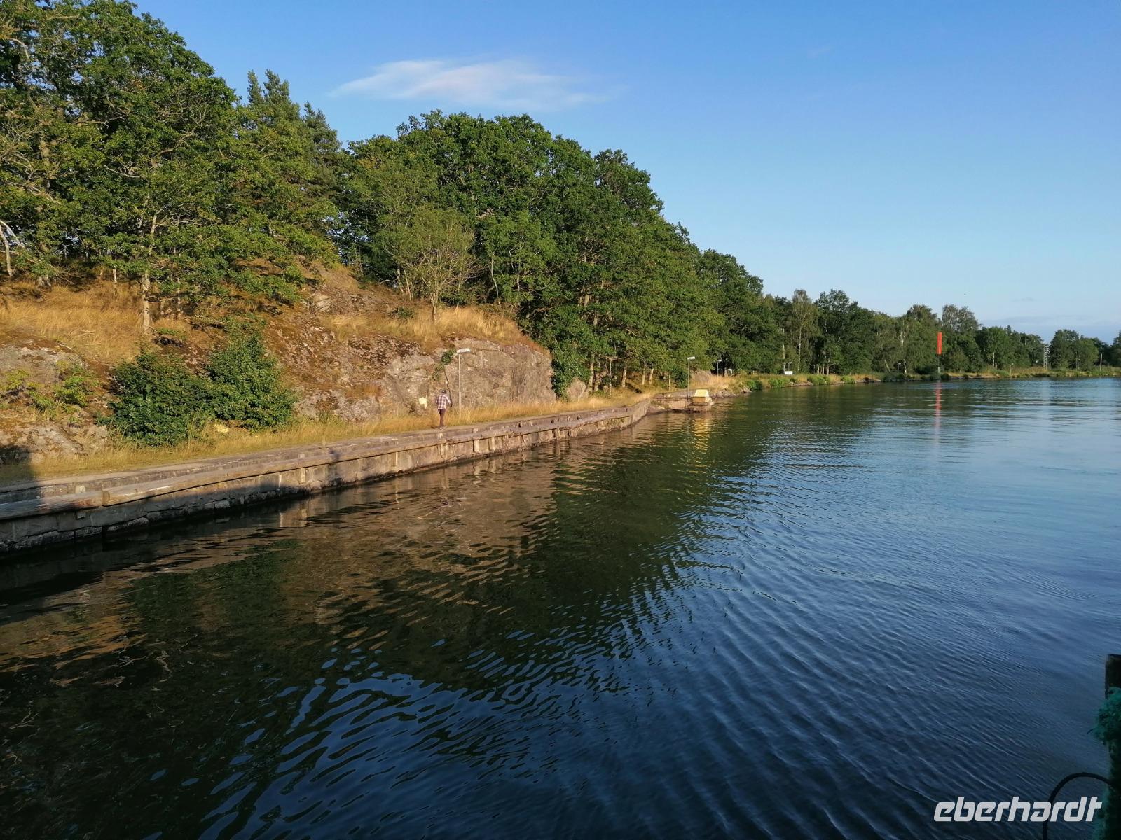 In der Schleuse von Klämman nahmen wir heute unser Frühstück zu uns. Wie immer konnten wir im Speisesaal oder auf dem Oberdeck frühstücken. Nach dem Frühstück oder früh eine Infoveranstaltung anberaumt. Nachdem zusammen uns weitere Informationen über den Göta-Kanal gegeben hatte, verteilte sie Stadtkarten von Söderköping und er läutete uns im Tagesablauf von heute. Unser erster Stopp erfolgte an der Oberschleuse von Carlsborg. Hier beginnt eine Folge von acht aufeinanderfolgenden Schleusen. Heute hatten wir sogar etwas Gegenverkehr, so dass das schleusen etwas länger dauert. In der Zwischenzeit spazierten wir bis zur vierten Schleuse neben dem Boot her. Zurück an Bord fuhren wir weiter nach Söderköping. Sie gab es etwas Freizeit in der idyllischen Stadt den Anfang des 13 Jahrhunderts gegründet wurde. Während der Hansezeit war die Stadt von großer Bedeutung. Heute ist der kleine Kurort vor allem bekannt für seine vielen und guten Eisdielen. Diese lernt natürlich gemeinsam kennen und probiert den das köstliche Eis. Nach der kleinen Erfrischung machten wir einen kleinen Stadtrundgang. Wir spazierten durch die romantische Kleinstadt bis hin zur Kathedrale. Im Anschluss hatten wir etwas Zeit zur freien Verfügung, welche wir zum Shoppen nutzten. Zurück an Bord gab es zunächst einmal Mittagessen. Während des Essens verließen wir den Göta-Kanal und fuhren auf die Ostsee hinaus. Nach einer kleinen Fahrt erreichten wir Stegeborg. Auf einer kleinen Insel an der Ostsee Bucht liegt die ehemalige Schlossruine Stegeborg. Susan führte uns herum und klärt uns über die Geschichte der alten Ruine und der Kräutergärten auf. Das Schloss war früher der Schlüssel zum Göta-Kanal und man musste es passieren, wenn man zum Göta-Kanal wollte. Heute Abend stand ein kleiner Sektumtrunk auf dem Programm. Beim anschließenden Captains Dinner, konnten wir noch mal in vollen Zügen das leckere Essen an Bord genießen. Nach dem Essen wurde die Crew nochmals vorgestellt und wir konnten uns für tüchtige Arbeit bedanken. Unser Nachtquartier verlegten wir heute auf die Insel Sävsundet. Beim privaten Anlegesteg gab es die Möglichkeit schwimmen zu gehen oder einen Spaziergang, um die Insel zu machen. Ein toller letzter Tag ging inmitten einer romantischen Atmosphäre zu Ende.