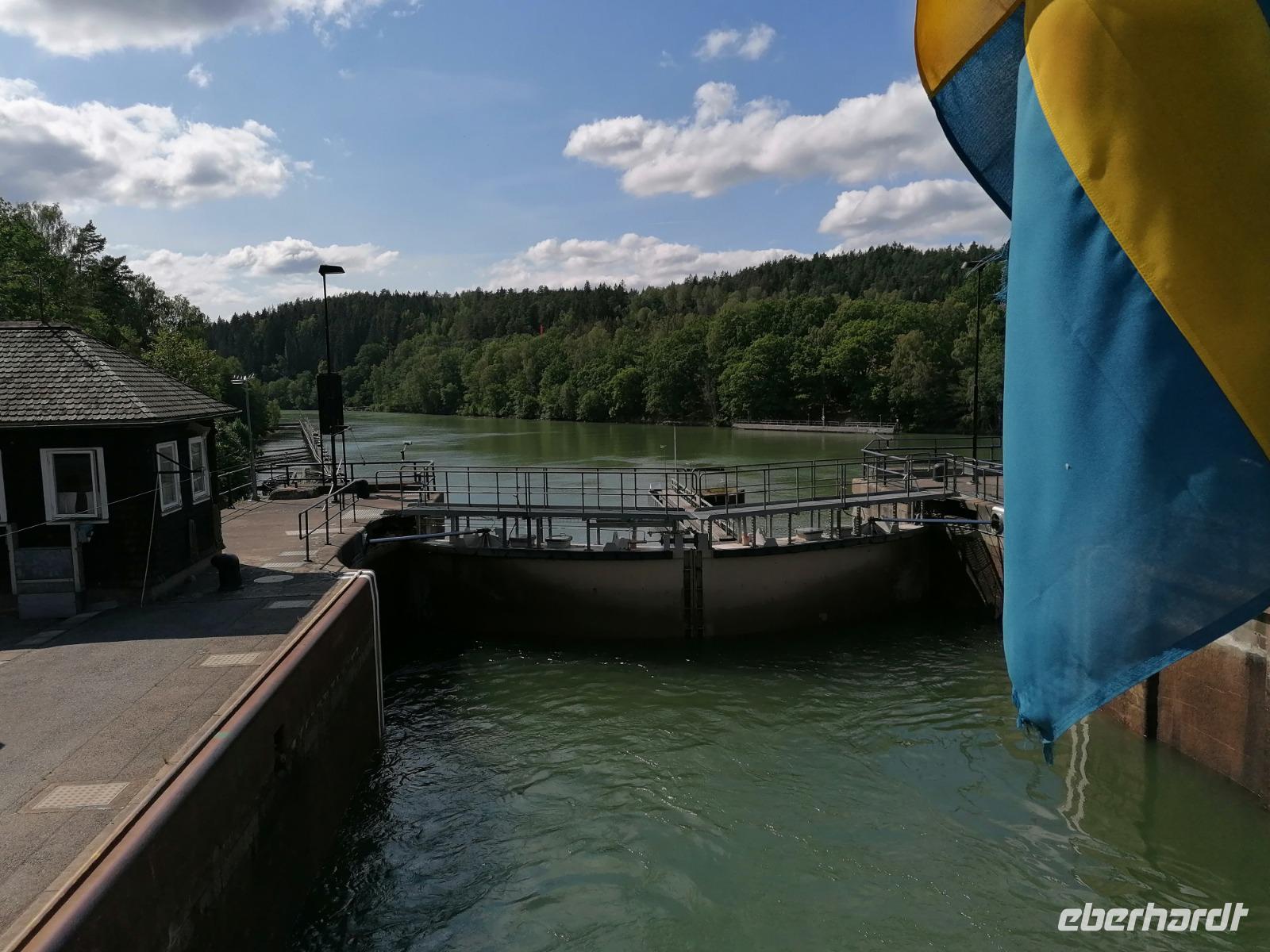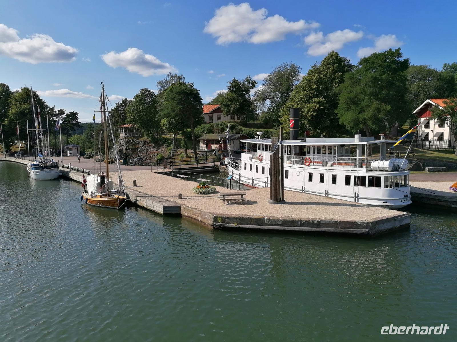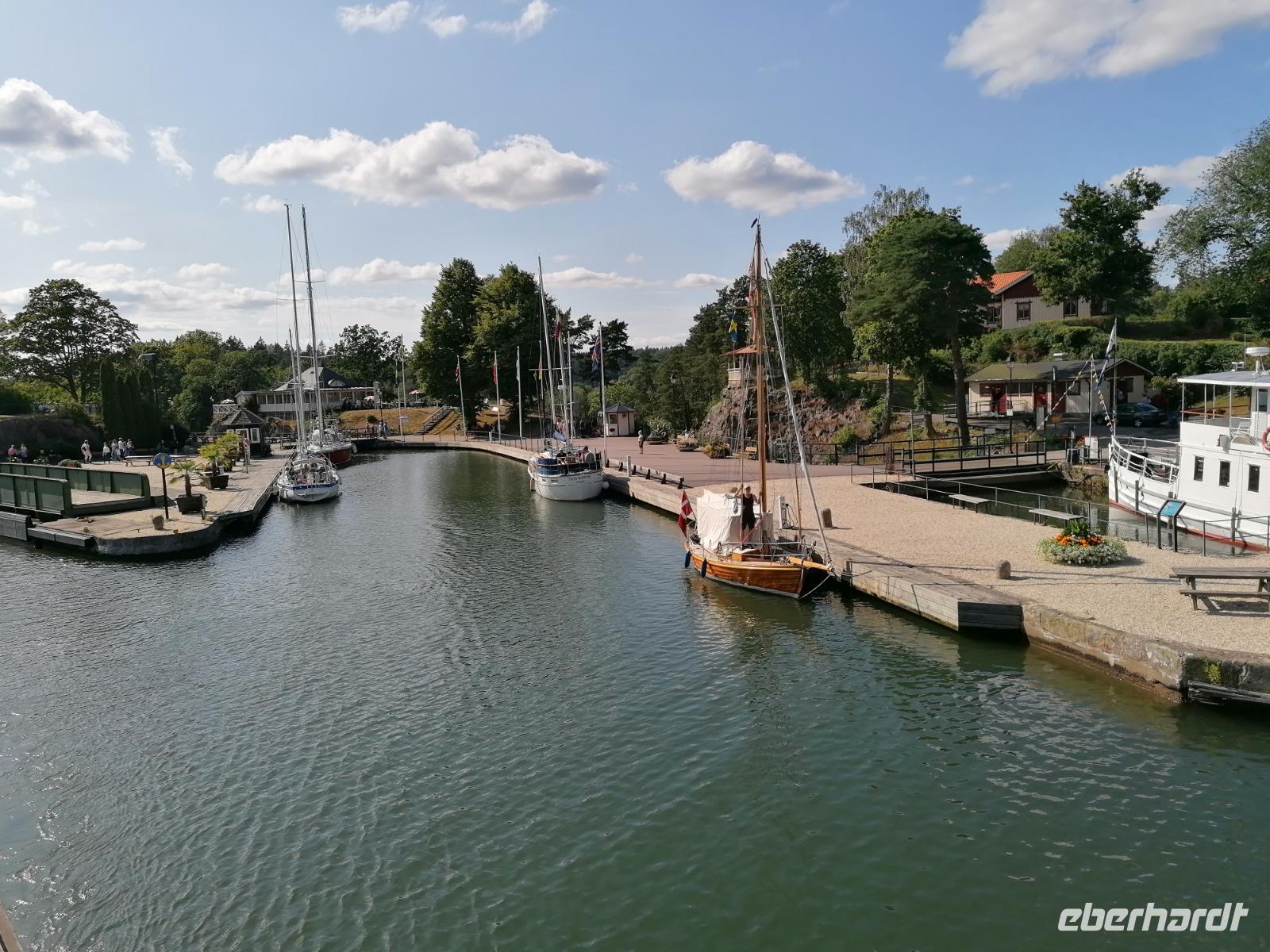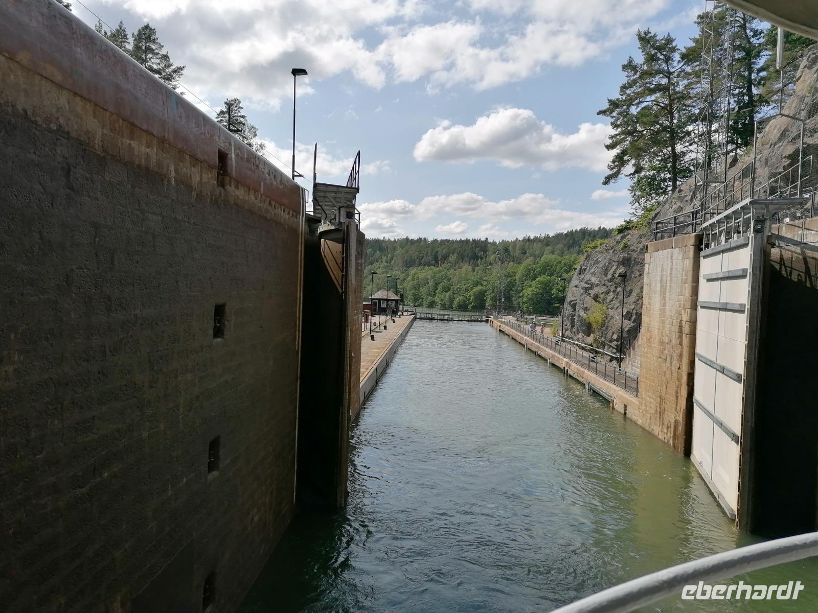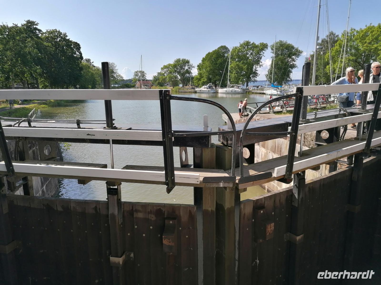 In der Schleuse von Klämman nahmen wir heute unser Frühstück zu uns. Wie immer konnten wir im Speisesaal oder auf dem Oberdeck frühstücken. Nach dem Frühstück oder früh eine Infoveranstaltung anberaumt. Nachdem zusammen uns weitere Informationen über den Göta-Kanal gegeben hatte, verteilte sie Stadtkarten von Söderköping und er läutete uns im Tagesablauf von heute. Unser erster Stopp erfolgte an der Oberschleuse von Carlsborg. Hier beginnt eine Folge von acht aufeinanderfolgenden Schleusen. Heute hatten wir sogar etwas Gegenverkehr, so dass das schleusen etwas länger dauert. In der Zwischenzeit spazierten wir bis zur vierten Schleuse neben dem Boot her. Zurück an Bord fuhren wir weiter nach Söderköping. Sie gab es etwas Freizeit in der idyllischen Stadt den Anfang des 13 Jahrhunderts gegründet wurde. Während der Hansezeit war die Stadt von großer Bedeutung. Heute ist der kleine Kurort vor allem bekannt für seine vielen und guten Eisdielen. Diese lernt natürlich gemeinsam kennen und probiert den das köstliche Eis. Nach der kleinen Erfrischung machten wir einen kleinen Stadtrundgang. Wir spazierten durch die romantische Kleinstadt bis hin zur Kathedrale. Im Anschluss hatten wir etwas Zeit zur freien Verfügung, welche wir zum Shoppen nutzten. Zurück an Bord gab es zunächst einmal Mittagessen. Während des Essens verließen wir den Göta-Kanal und fuhren auf die Ostsee hinaus. Nach einer kleinen Fahrt erreichten wir Stegeborg. Auf einer kleinen Insel an der Ostsee Bucht liegt die ehemalige Schlossruine Stegeborg. Susan führte uns herum und klärt uns über die Geschichte der alten Ruine und der Kräutergärten auf. Das Schloss war früher der Schlüssel zum Göta-Kanal und man musste es passieren, wenn man zum Göta-Kanal wollte. Heute Abend stand ein kleiner Sektumtrunk auf dem Programm. Beim anschließenden Captains Dinner, konnten wir noch mal in vollen Zügen das leckere Essen an Bord genießen. Nach dem Essen wurde die Crew nochmals vorgestellt und wir konnten uns für tüchtige Arbeit bedanken. Unser Nachtquartier verlegten wir heute auf die Insel Sävsundet. Beim privaten Anlegesteg gab es die Möglichkeit schwimmen zu gehen oder einen Spaziergang, um die Insel zu machen. Ein toller letzter Tag ging inmitten einer romantischen Atmosphäre zu Ende.