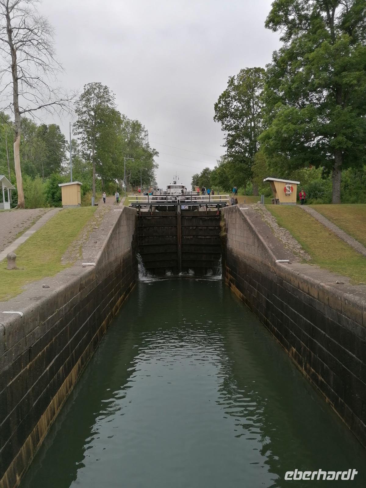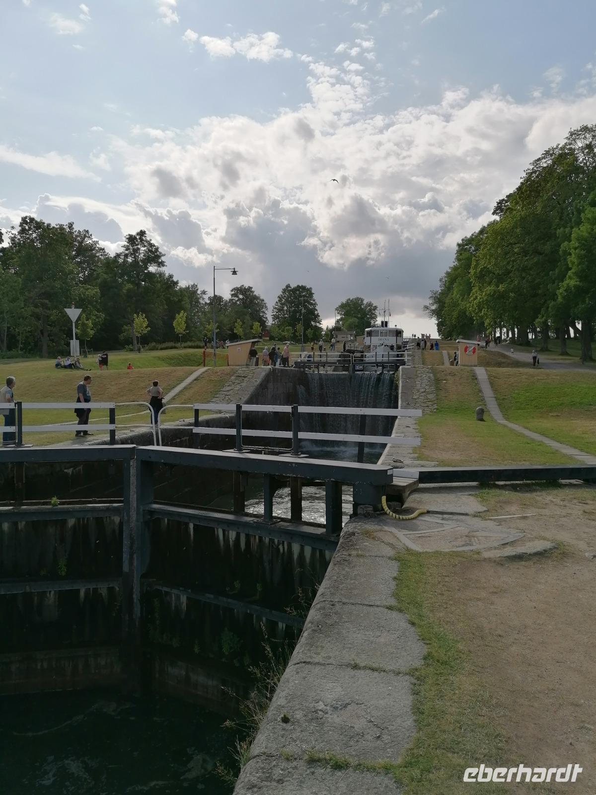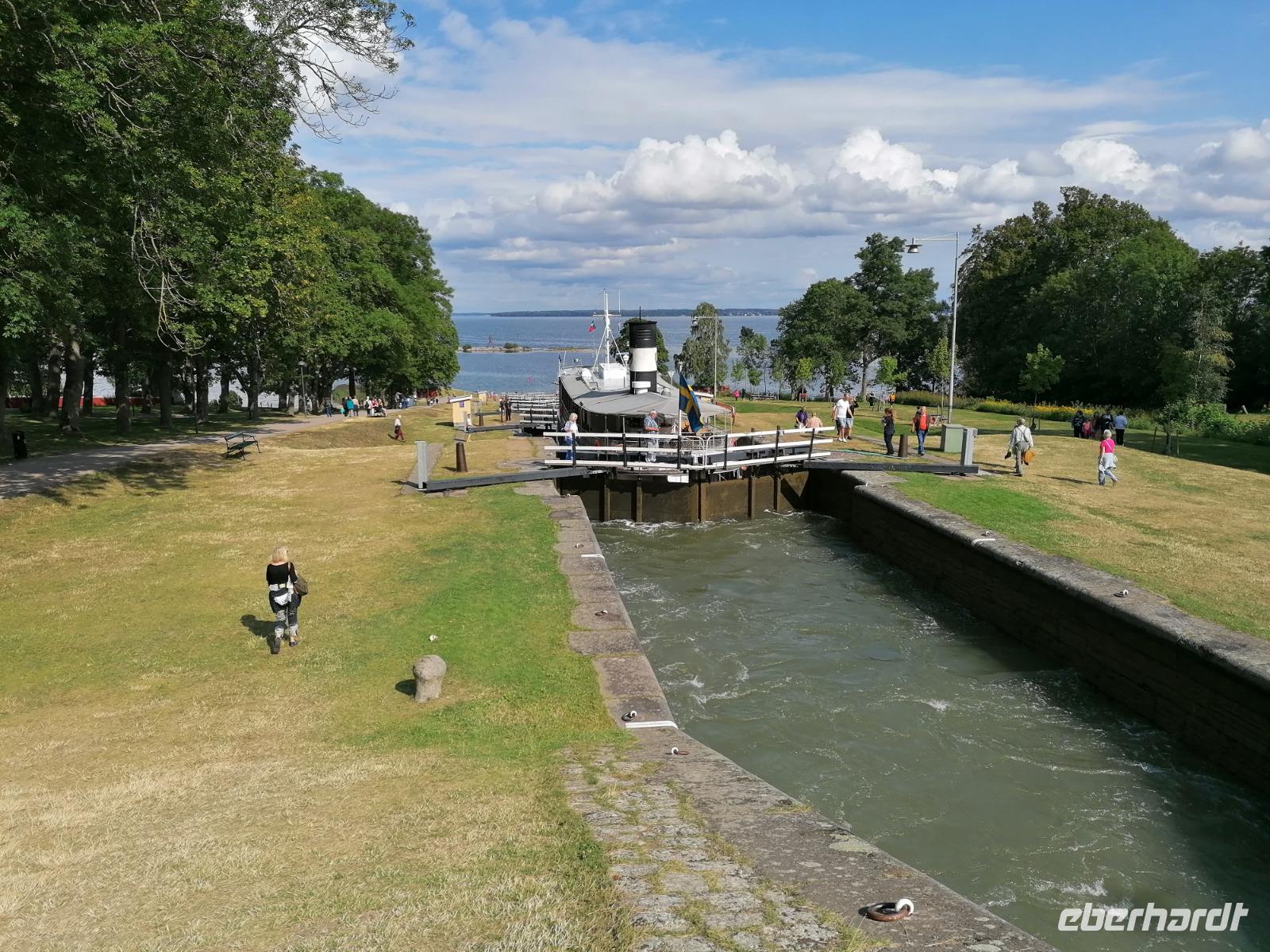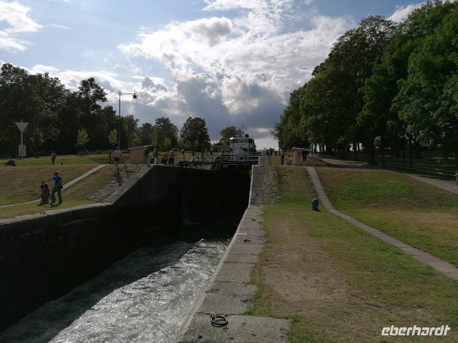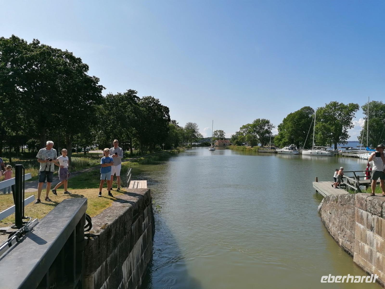 In der Schleuse von Klämman nahmen wir heute unser Frühstück zu uns. Wie immer konnten wir im Speisesaal oder auf dem Oberdeck frühstücken. Nach dem Frühstück oder früh eine Infoveranstaltung anberaumt. Nachdem zusammen uns weitere Informationen über den Göta-Kanal gegeben hatte, verteilte sie Stadtkarten von Söderköping und er läutete uns im Tagesablauf von heute. Unser erster Stopp erfolgte an der Oberschleuse von Carlsborg. Hier beginnt eine Folge von acht aufeinanderfolgenden Schleusen. Heute hatten wir sogar etwas Gegenverkehr, so dass das schleusen etwas länger dauert. In der Zwischenzeit spazierten wir bis zur vierten Schleuse neben dem Boot her. Zurück an Bord fuhren wir weiter nach Söderköping. Sie gab es etwas Freizeit in der idyllischen Stadt den Anfang des 13 Jahrhunderts gegründet wurde. Während der Hansezeit war die Stadt von großer Bedeutung. Heute ist der kleine Kurort vor allem bekannt für seine vielen und guten Eisdielen. Diese lernt natürlich gemeinsam kennen und probiert den das köstliche Eis. Nach der kleinen Erfrischung machten wir einen kleinen Stadtrundgang. Wir spazierten durch die romantische Kleinstadt bis hin zur Kathedrale. Im Anschluss hatten wir etwas Zeit zur freien Verfügung, welche wir zum Shoppen nutzten. Zurück an Bord gab es zunächst einmal Mittagessen. Während des Essens verließen wir den Göta-Kanal und fuhren auf die Ostsee hinaus. Nach einer kleinen Fahrt erreichten wir Stegeborg. Auf einer kleinen Insel an der Ostsee Bucht liegt die ehemalige Schlossruine Stegeborg. Susan führte uns herum und klärt uns über die Geschichte der alten Ruine und der Kräutergärten auf. Das Schloss war früher der Schlüssel zum Göta-Kanal und man musste es passieren, wenn man zum Göta-Kanal wollte. Heute Abend stand ein kleiner Sektumtrunk auf dem Programm. Beim anschließenden Captains Dinner, konnten wir noch mal in vollen Zügen das leckere Essen an Bord genießen. Nach dem Essen wurde die Crew nochmals vorgestellt und wir konnten uns für tüchtige Arbeit bedanken. Unser Nachtquartier verlegten wir heute auf die Insel Sävsundet. Beim privaten Anlegesteg gab es die Möglichkeit schwimmen zu gehen oder einen Spaziergang, um die Insel zu machen. Ein toller letzter Tag ging inmitten einer romantischen Atmosphäre zu Ende.