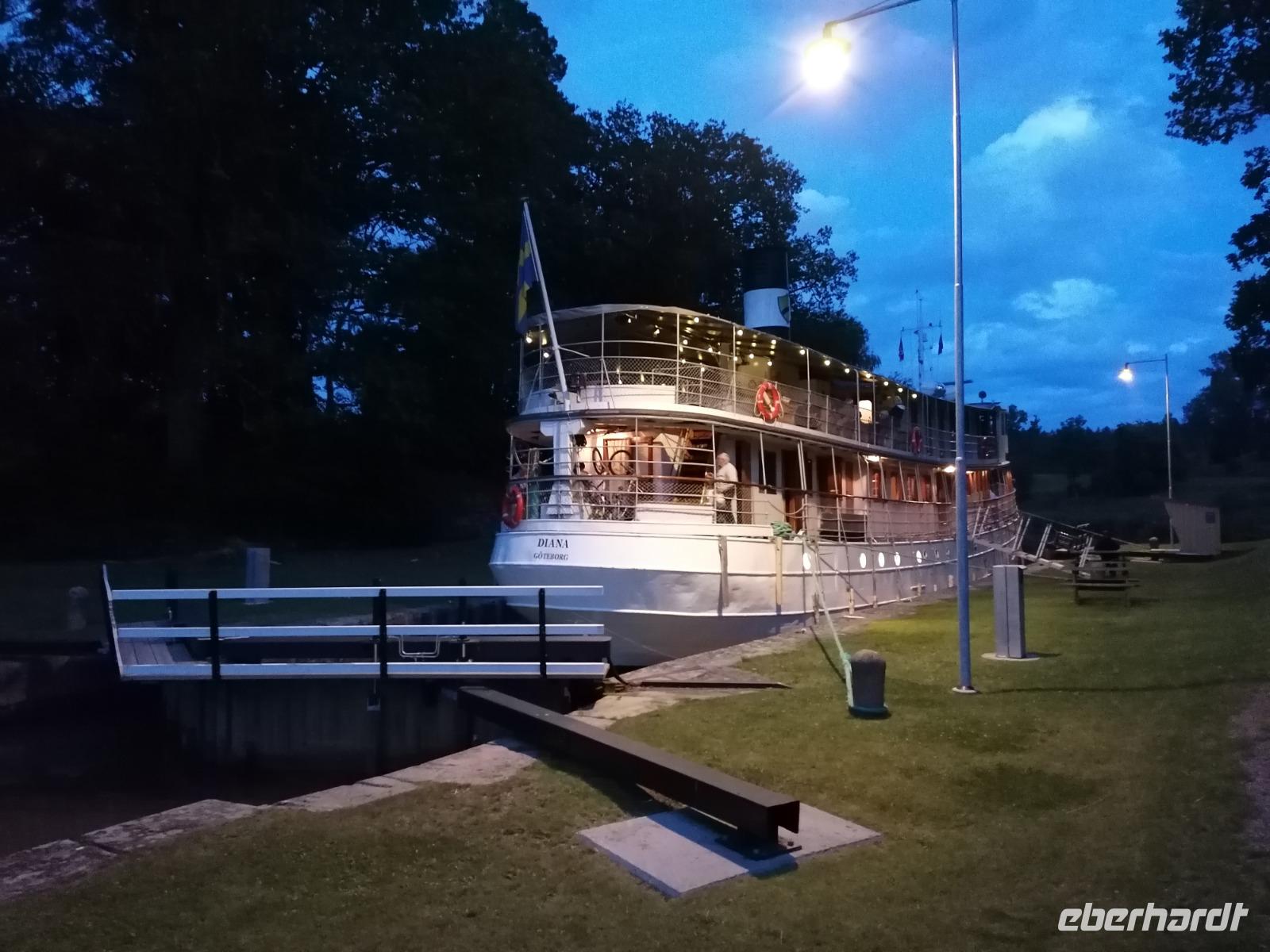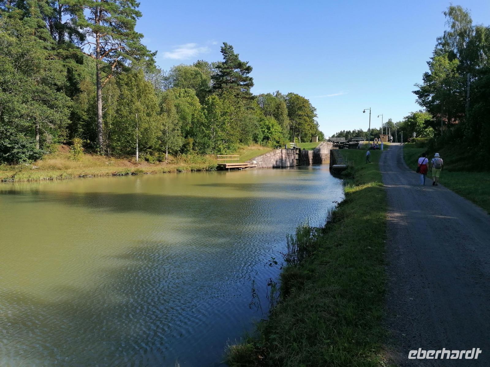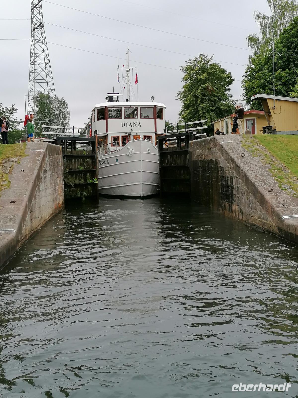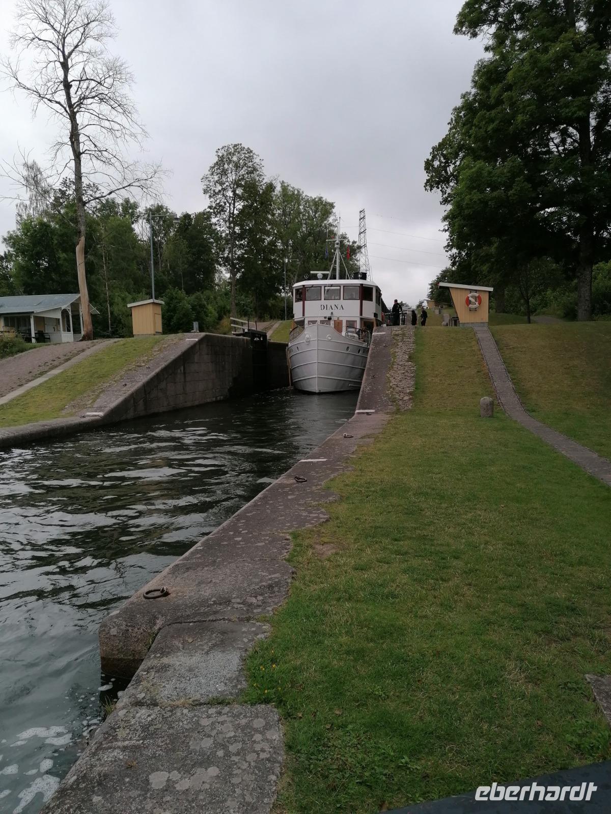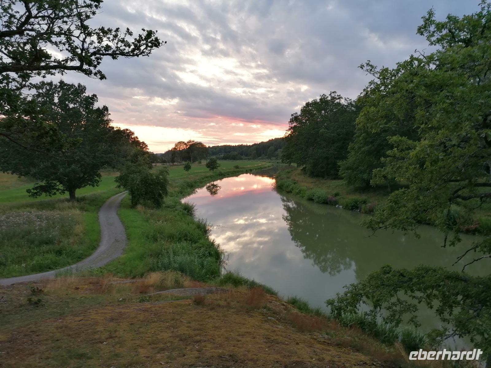 Heute startet der unser Tag etwas später in Motala. Nach dem Frühstück brachen wir auf in Richtung Borenslut. Hier gibt es eine Schleusentreppe von fünf zusammenhängenden Schleusen, die insgesamt eine von 15,3 m überwinden müssen. Während die Crew allerhand mit dem Schleusen zu tun hatten, konnten wir entlang der Schleusentreppe spazieren und wunderschöne Bilder schießen. Nach der Schleusentreppe von Borenslut fuhren wir weiter über den Boren See bis zur gefürchteten Kurve von Borensberg. Die Spitze Kurve meist hatten wir mit Hilfe eines Seils mit Bravour. Nach der Aufregung des Morgens konnten wir am Oberdeck entspannen. Um die Mittagszeit erreichten wir das Aquädukt Jungs Norrby. Hier überquert der Götakanal die Reichsstraße 63 und wurde im Jahre 1993 erbaut. Bevor wir ein weiteres Highlight der Reise erreichten, stärken wir uns erstmal mit einem Mittagessen. Beim Mittagessen wurden wir jedoch mit einem festlich geschmückten Speisesaal überrascht. Zum Mittagessen hatte sich die Crew etwas Besonderes einfallen lassen. In typisch schwedischer Tradition feierten wir das Fest der Krebse. Die Crew zeige uns wie man die Krebse isst und reichte dabei einen typisch schwedischen Aquavit. Nach dem ausführlichen Mittagessen erreichten wir schließlich die Schleusen von Berg. Das Schleusensystem von Berg umfasst 15 Schleusen, die insgesamt eine Höhe von 40 m bis zum See überwinden. Während das Boot noch in der ersten Schleuse steckte, spazierten wir zum Kloster Vreta. Das alte Nonnenkloster wurde der heiligen Brigitta gewidmet und war das erste Nonnenkloster in Schweden. Nachdem die Kirche und das Kloster besichtigt hatten, gingen wir zurück zu Schleusentreppe. Mittlerweile war die MS Diana mitten in der Schleusentreppe gefangen und wir konnten neben dem Schiff entlang spazieren. Die Schleusentreppe von Berg ist wirklich ein faszinierendes Meisterwerk der damaligen Technik. Zurück am Schiff fuhren über den See Roxen und genossen beim Abendessen die herrliche Aussicht. Nach dem Abendessen reichte mir die Schleuse Klämman. Wie es schon Tradition war, spazierten wir entlang des Kanals in den Sonnenuntergang hinein.