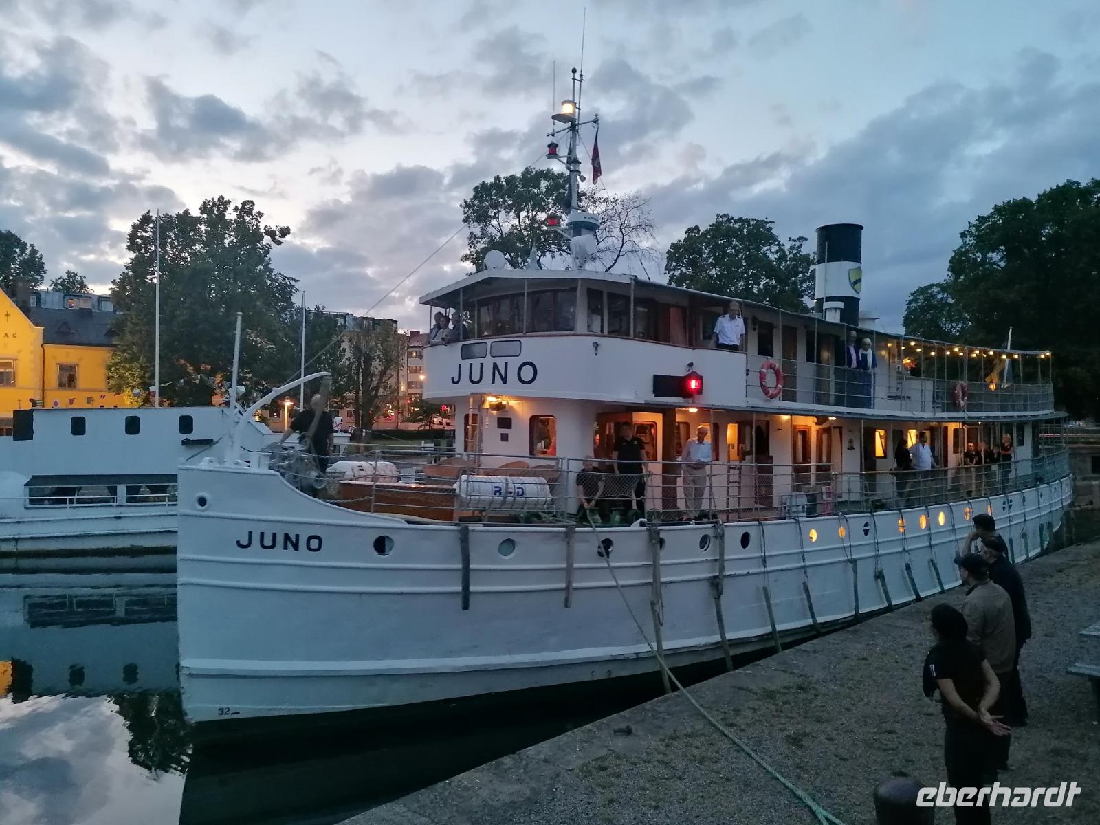 Die zweite Nacht auf einem Boot ist immer die bessere. Ausgeruht und voller Tatendrang starteten wir mit einem schönen Frühstück an Oberdeck in den Tag hinein. Kurz nach dem Frühstück passierten wir den höchsten Punkt mit 91,5m des Göta Kanals. Im sogenannten Berg Kanal gibt es einen Obelisken, der den höchsten Punkt des Kanals symbolisiert. Leider wurde der Kanal innerhalb der Jahre etwas verschoben, sodass der Obelisk nur noch aus der Ferne zu sehen ist. Aufmerksam durchfuhren wird denn der Kanal und entdeckten schließlich mit Susans Hilfe den Obelisken. Der Berg Kanal ist eine sehr enge, aber schöne Strecke, wie wir auf dem Oberdeck bei einem gemütlichen Kaffee oder Tee genießen konnten. Der nächste Höhepunkt war die handbetriebene Schleuse von Töreboda. Hier stieg Susan vom Boot und absolvierte die Prüfung der handbetriebenen Schleuse mit Bravour. Kurz vor dem Mittagessen wurde ein Vortrag über die Geschichte des Göta Kanals angeboten und wir erhielten zudem einige Informationen über den Ablauf der nächsten Tage. Nach einem erneut leckeren Mittagessen erreichten wir den Vätternsee wo der Seegang etwas rauer wurde. Am Nachmittag erreichten wir die Stadt Vadstena. Heute ist die Stadt eine gemütliche Kleinstadt aber im 14 Jahrhundert wuchs die Kleinstadt zu einem Geistlichen, kulturellen und ökonomischen Zentrum heran. In Vadstena wurden wir von einer örtlichen Städtführerin begrüßt. Gemeinsam besuchten wir zuerst das Schloss von Vadstena. Im Anschluss wurden wir mit einer Bummelbahn zum alten Kloster gebracht. Auch hier erzählte unserer Guide einige interessante Geschichten über das Kloster und wie das Leben damals war. Anschließend gab es etwas Freizeit, um in der Stadt bummeln zu gehen oder gemütlich zum Schiff zurück zu spazieren. Zurück an Bord gab es am Abend wieder ein fantastisches Abendessen. Nach dem Abendessen erreichten wir Motala. Hier besuchten wir noch das Motormuseum, wo wir eine ausführliche Sammlung an alten Autos Radios und Motorräder auffangen. Nach dem Museumsbesuch genossen wir einen kleinen Absacker in einer Bar direkt neben unserem Schiff. Kurz bevor wir ins Bett gehen wollten, erreichte das Schwesternschiff, die MS Juno den Hafen und wir konnten noch einige interessante Bildern schießen.