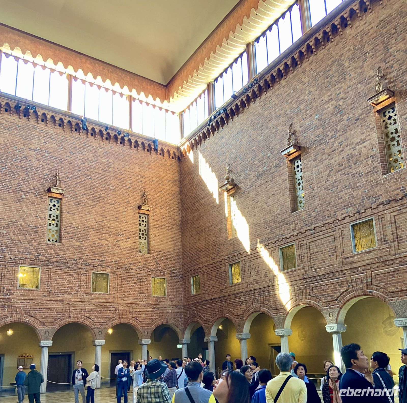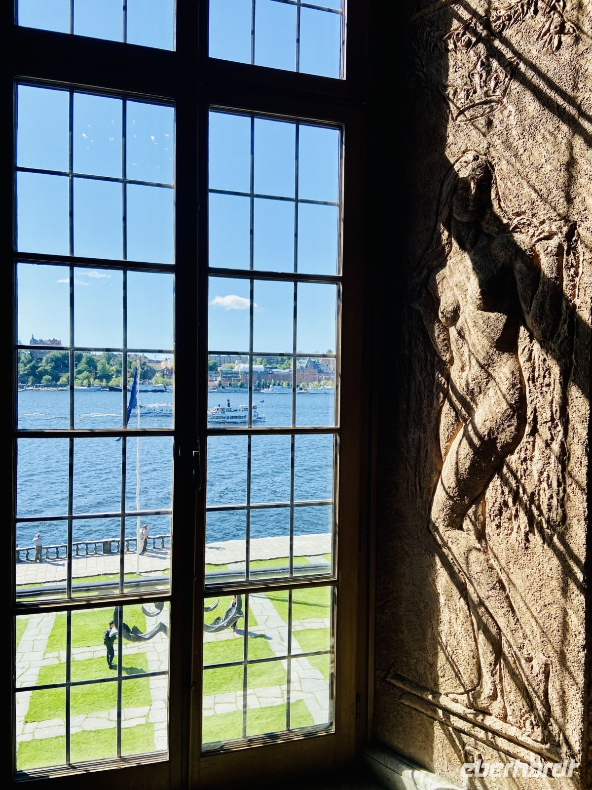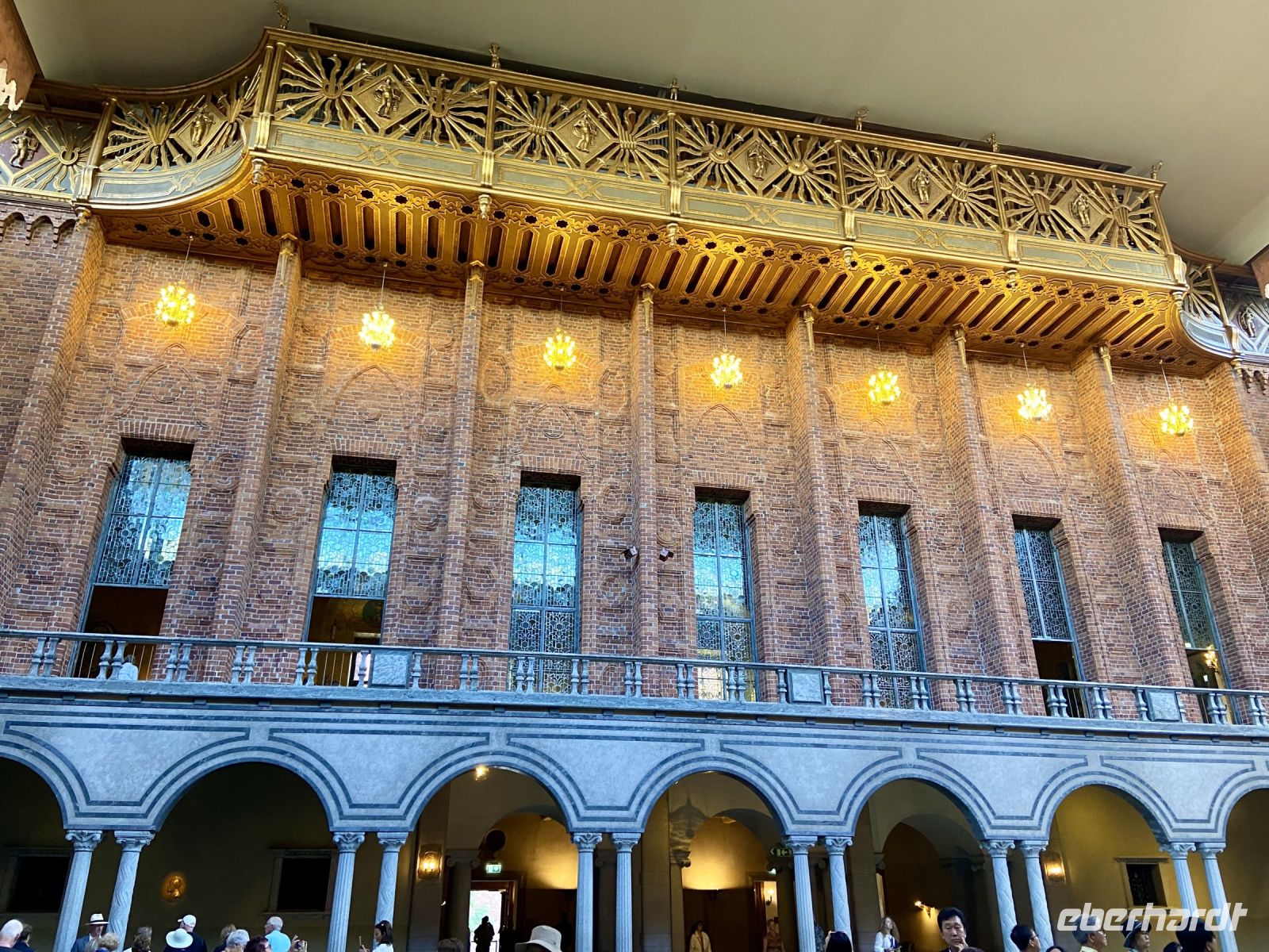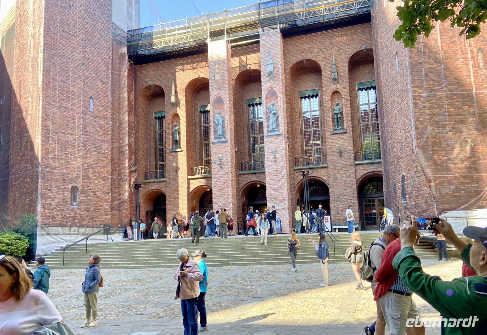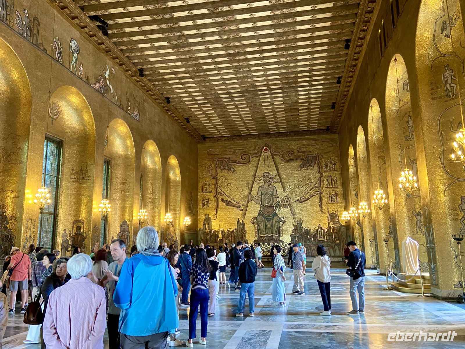 Wir treffen uns an der Hotelrezeption und pünktlich um 9 Uhr steht auch schon der Bus vor dem Hotel, in einer Viertelstunde sind wir in der Innenstadt. Unser Stadtführer Pieter empfängt uns vor dem Rathaus und wir besichtigen die prächtigen Säle. Hier wird jedes Jahr am 10. Dezember der Nobelpreis verliehen und die Preisträger werden im sogenannten „Blauen Saal“, der eigentlich aus Backsteinen in Rottönen konzipiert ist, mit einem prunkvollen Bankett gefeiert Das imposante Gebäude, das Anfang des letzten Jahrhunderts am Ufer des Mälaren-Sees errichtet wurde, heißt auf schwedisch „Stockholms stadshus“ und beherbergt den Sitz der Stadtverwaltung. Wir sehen den Goldenen Saal, den Ratssaal und das Hochzeitszimmer, am Wochenende werden hier Trauungen im 5-Minutentakt abgeschlossen. Wahrzeichen des Rathauses ist sein erhabener Turm, der über 100 Meter hoch ist und von einer vergoldeten Skulptur gekrönt wird. Die Besteigung dieses Turmes mit 365 Treppenstufen bleibt uns jedoch erspart.