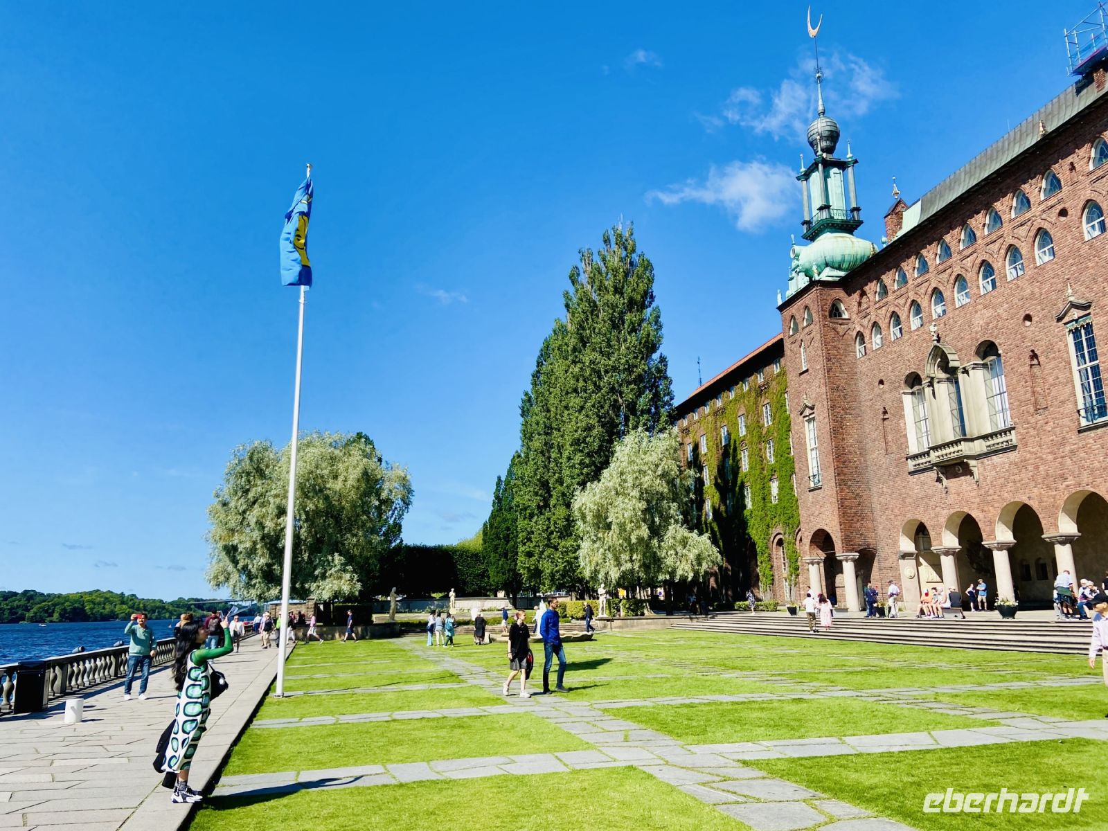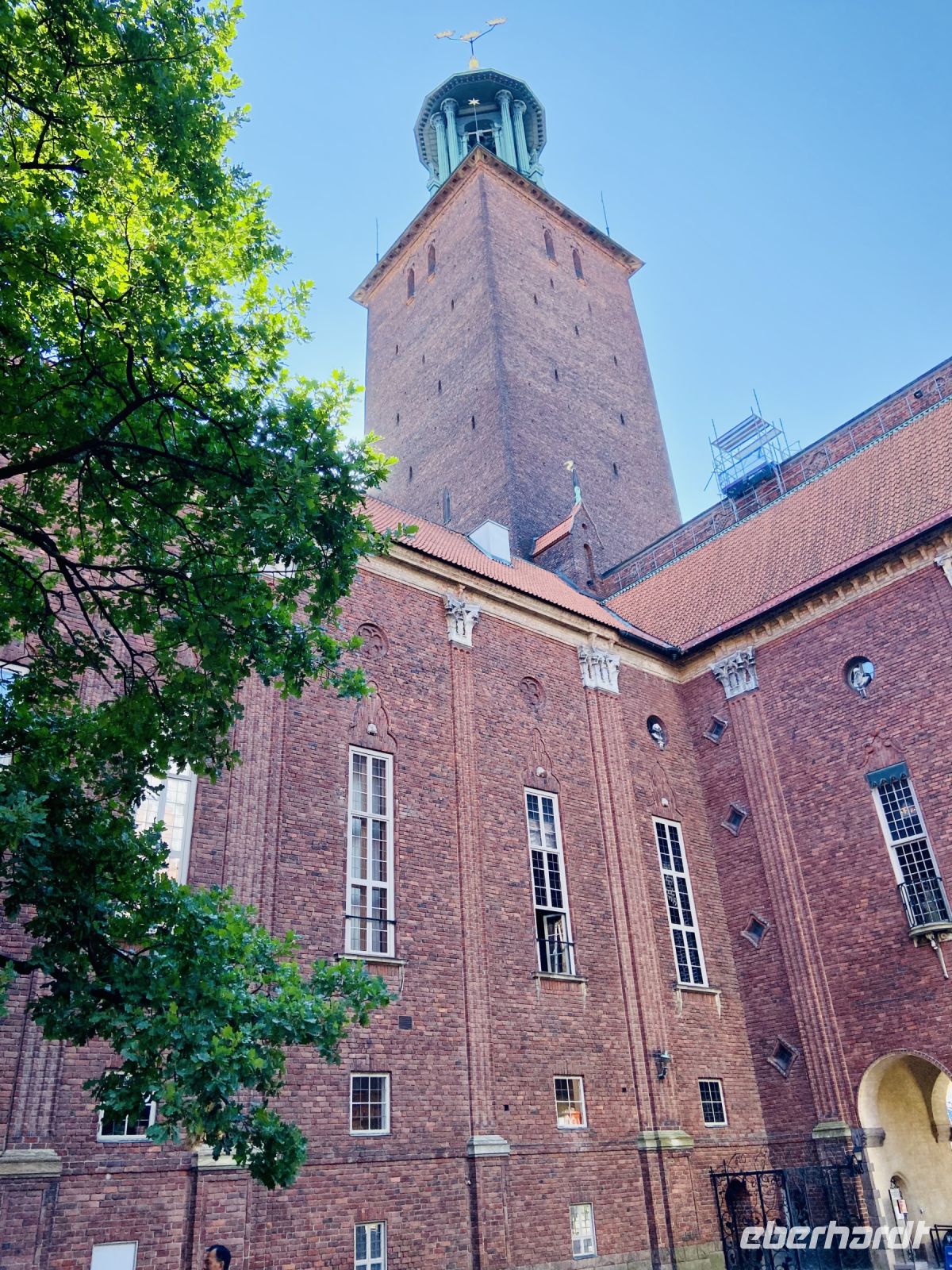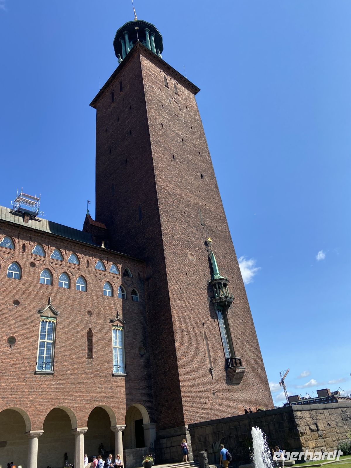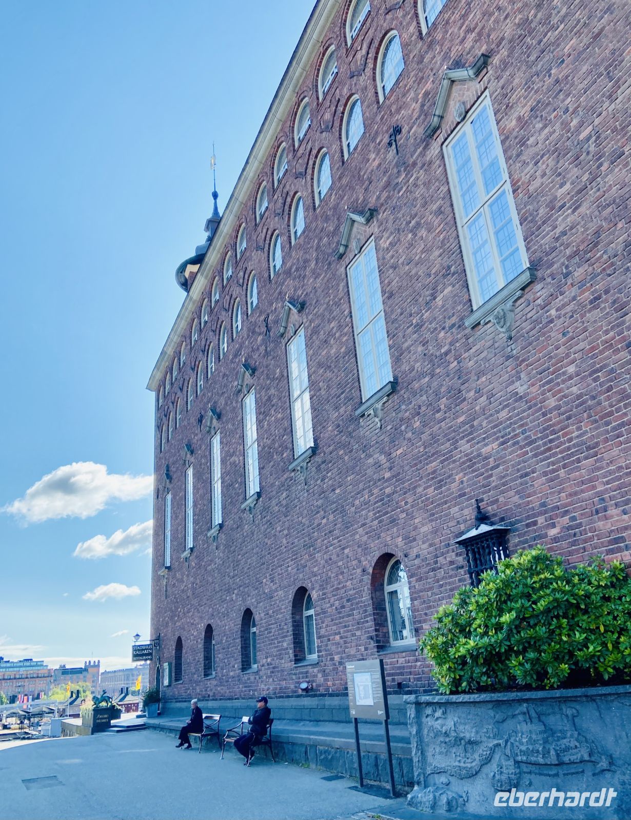 Wir treffen uns an der Hotelrezeption und pünktlich um 9 Uhr steht auch schon der Bus vor dem Hotel, in einer Viertelstunde sind wir in der Innenstadt. Unser Stadtführer Pieter empfängt uns vor dem Rathaus und wir besichtigen die prächtigen Säle. Hier wird jedes Jahr am 10. Dezember der Nobelpreis verliehen und die Preisträger werden im sogenannten „Blauen Saal“, der eigentlich aus Backsteinen in Rottönen konzipiert ist, mit einem prunkvollen Bankett gefeiert Das imposante Gebäude, das Anfang des letzten Jahrhunderts am Ufer des Mälaren-Sees errichtet wurde, heißt auf schwedisch „Stockholms stadshus“ und beherbergt den Sitz der Stadtverwaltung. Wir sehen den Goldenen Saal, den Ratssaal und das Hochzeitszimmer, am Wochenende werden hier Trauungen im 5-Minutentakt abgeschlossen. Wahrzeichen des Rathauses ist sein erhabener Turm, der über 100 Meter hoch ist und von einer vergoldeten Skulptur gekrönt wird. Die Besteigung dieses Turmes mit 365 Treppenstufen bleibt uns jedoch erspart.