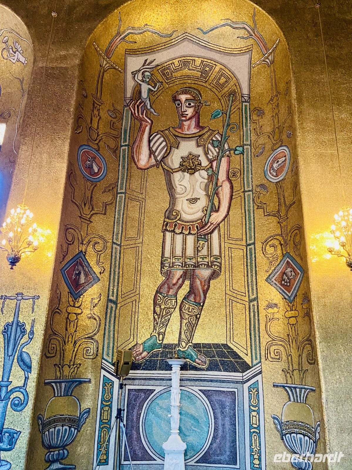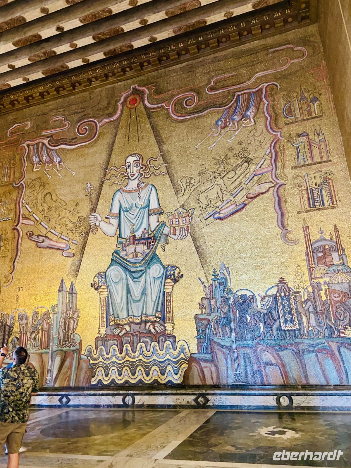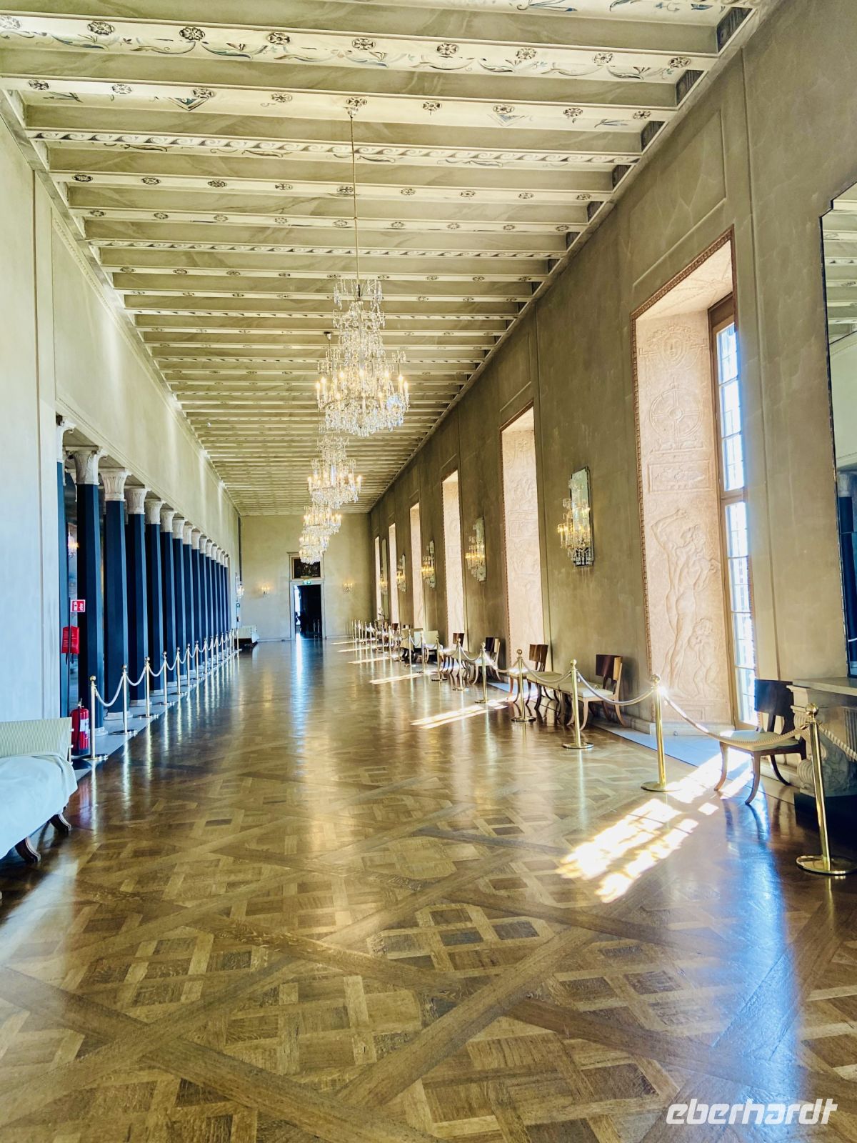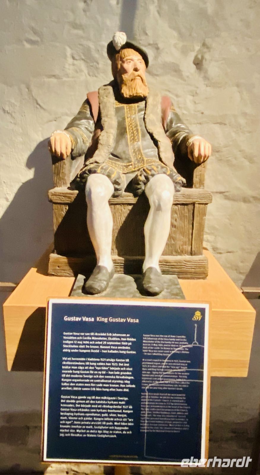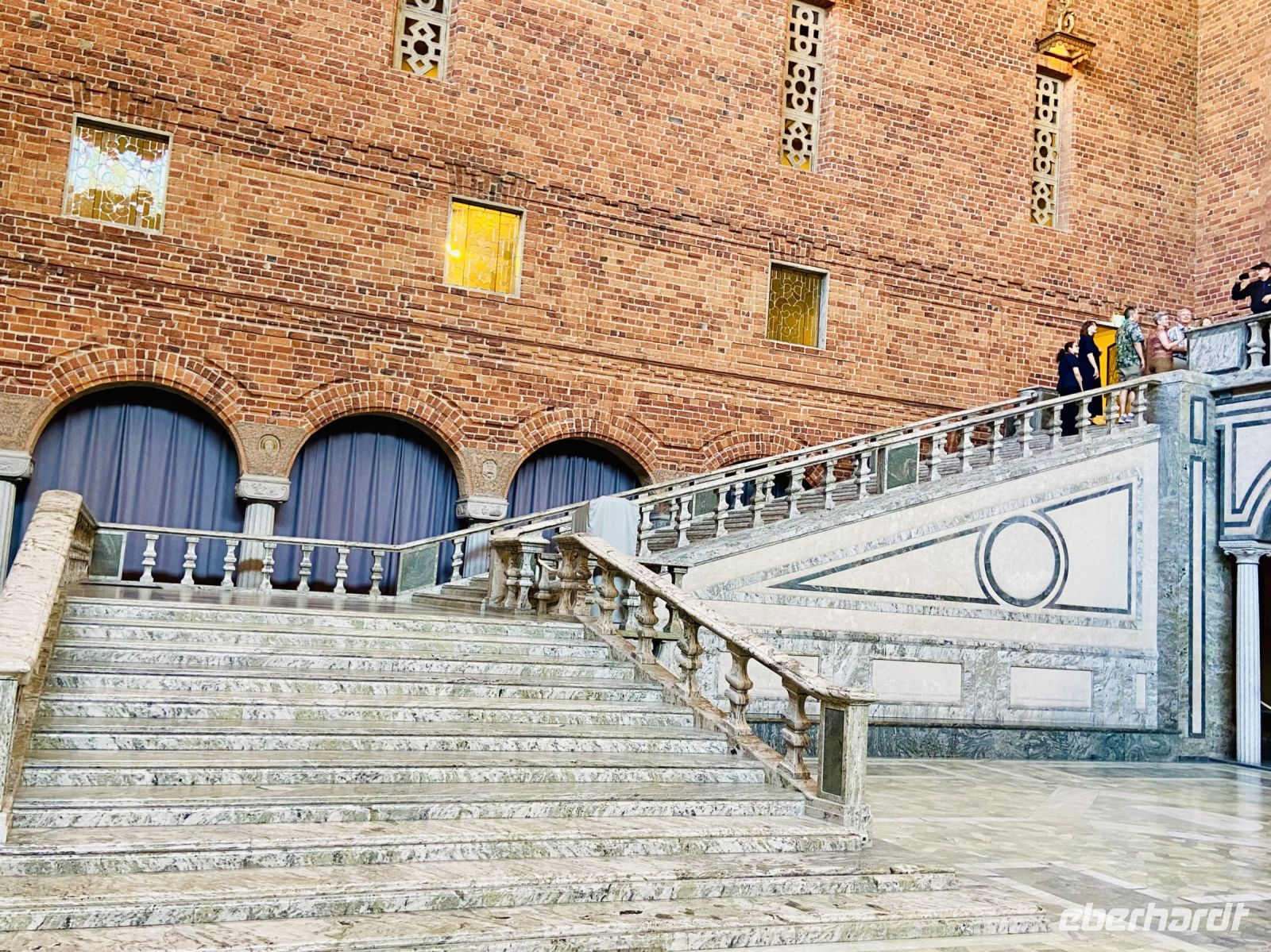 Wir treffen uns an der Hotelrezeption und pünktlich um 9 Uhr steht auch schon der Bus vor dem Hotel, in einer Viertelstunde sind wir in der Innenstadt. Unser Stadtführer Pieter empfängt uns vor dem Rathaus und wir besichtigen die prächtigen Säle. Hier wird jedes Jahr am 10. Dezember der Nobelpreis verliehen und die Preisträger werden im sogenannten „Blauen Saal“, der eigentlich aus Backsteinen in Rottönen konzipiert ist, mit einem prunkvollen Bankett gefeiert Das imposante Gebäude, das Anfang des letzten Jahrhunderts am Ufer des Mälaren-Sees errichtet wurde, heißt auf schwedisch „Stockholms stadshus“ und beherbergt den Sitz der Stadtverwaltung. Wir sehen den Goldenen Saal, den Ratssaal und das Hochzeitszimmer, am Wochenende werden hier Trauungen im 5-Minutentakt abgeschlossen. Wahrzeichen des Rathauses ist sein erhabener Turm, der über 100 Meter hoch ist und von einer vergoldeten Skulptur gekrönt wird. Die Besteigung dieses Turmes mit 365 Treppenstufen bleibt uns jedoch erspart.