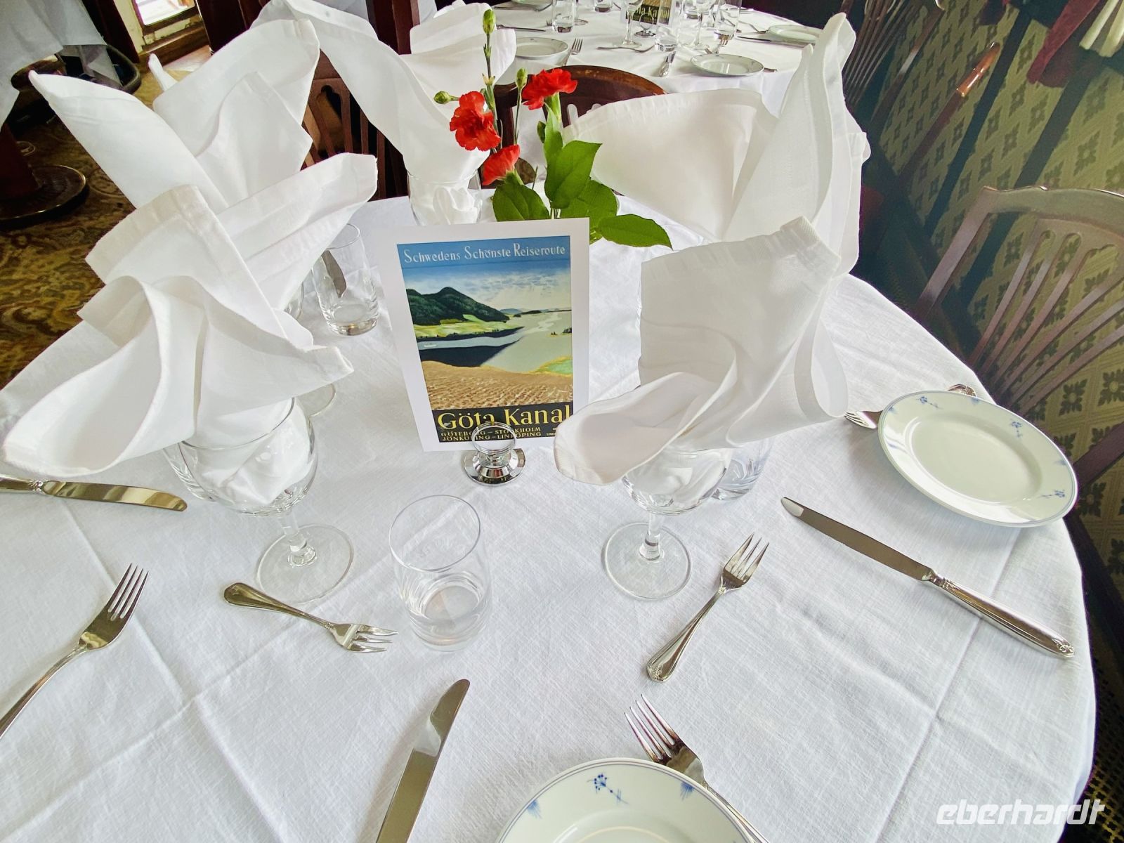 Pünktlich 18 Uhr legt unser Schiff ab und wir werden zum Kapitänsdinner eingeladen. Unsere Reiseleiterin Karin und die gesamte Crew nutzen diesen Abend, um sich von uns zu verabschieden. Auf einzigartig sympathische Art und Weise erzählt jedes Crewmitglied ein wenig über sich und alle versichern uns einstimmig, dass auf dieser Reise die Gäste besonders nett und freundlich waren. Der Kapitän überreicht jedem von uns die Kanalurkunde und gerührt und ein wenig wehmütig, dass die Traumreise nun zu Ende geht, genießen wir den letzten Abend an Bord. Übernachtet wird heute in Vänersborg.