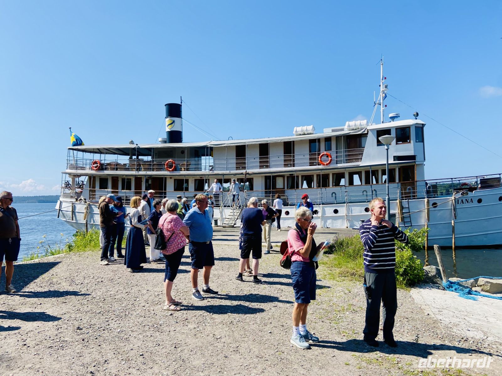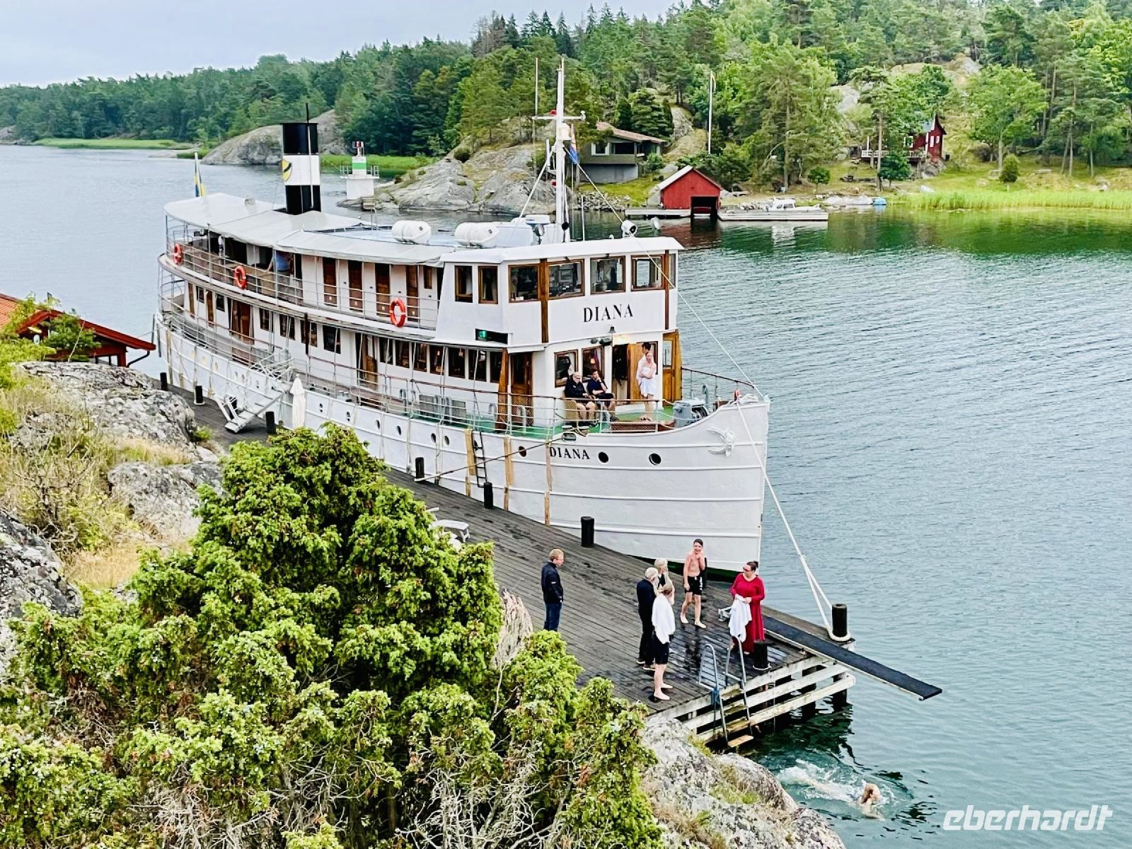 Heute geht die Zeit in Stockholm zu Ende. Gestern Abend kam noch ein Heißluftballon ganz niedrig an unserem Hotel vorbei, als ob er „Auf Wiedersehen“ sagen wollte. Zur großen Freude der Reisebegleitung kommt der Transfer-Bus, der uns zum Hafen bringen wird, überpünktlich. So fahren wir am Sonntagmorgen durch die noch ruhige Stadt und erblicken am Quai unser Schiff MS Diana. Die Bordreiseleitung und der 1. Offizier begrüßen uns und die Crew trägt die Koffer zu unseren Kabinen. Schnell haben wir uns einen Überblick über die Räumlichkeiten des Schiffes verschafft und genießen den Willkommens-Kaffee mit Kuchen und Obst in der Open-Air-Bar an Deck. Pünktlich um zehn Uhr heißt es „Leinen los“ und unsere nostalgische Zeitreise beginnt. Karin, die Bordreiseleitung, lädt uns in den Salon ein und der Kapitän und die Crewmitglieder stellen sich vor. Danach erhalten wir von Karin noch wichtige Informationen über das Leben an Bord. Das Info-Gespräch muss kurz unterbrochen werden, denn wir fahren schon über den Mälarsee und passieren die Insel Lovön, das sich berühmte königliche Schloss Drottningholm erhebt. Nach dem Mittagessen erreichen wir Birka, wo wir einen Rundgang durch die ehemalige Wikingersiedlung machen und das dazugehörige Museum besichtigen können. Am Nachmittag passieren wir die größte Schleuse Skandinaviens in Södertälje und gelangen so in die offene Ostsee. Nach dem Abendessen erreichen wir unseren heutigen Liegeplatz in Sävsundet. Die Crew und einige Gäste nutzen die malerische Bucht noch für einen Sprung ins Wasser, andere machen einen kleinen Abendspaziergang vorbei an verträumten Sommerhäusern.