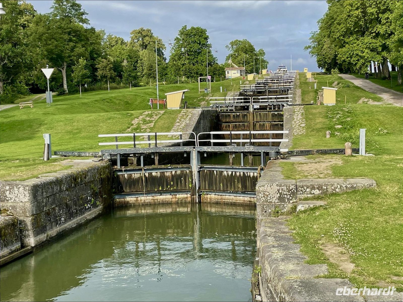 Söderköping ist eine der wichtigsten Stationen unserer Reise, denn hier befindet sich das Eiscafé Smultronstället mit super leckerem Speiseeis! Es liegt direkt an der Schleuse und die Eisbecher sind so groß, dass wir sie schon von Bord aus sehen können. Obwohl wir eigentlich satt sind vom Mittagessen (die Reisebegleitung hatte uns vorher gewarnt), findet sich noch ein Plätzchen im Bauch, um das sensationelle Eis zu probieren. Auf der Weiterfahrt muss unser Schiff mehrere Schleusen durchfahren und wer möchte, kann zu Fuß nebenherlaufen, das Schleusen beobachten und Fotos machen. Diese kleine Wanderung baut die Eis-Kalorien wieder ab und wir können uns auf das Abendessen freuen. Unser Liegeplatz in dieser Nacht befindet sich vor der Schleusentreppe in Berg, wir kommen gegen 22 Uhr hier an. Die Schleusentreppe und die umliegenden Häuser sind beschaulich erleuchtet und laden ein zu einem kleinen Bummel in der milden Abendluft.
