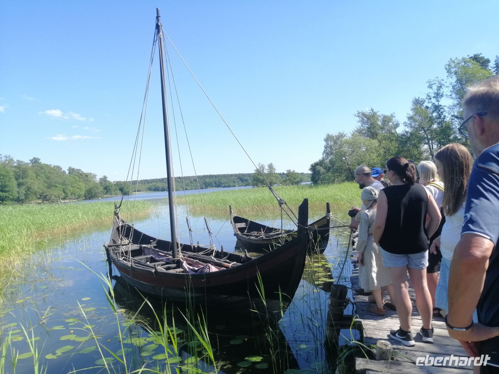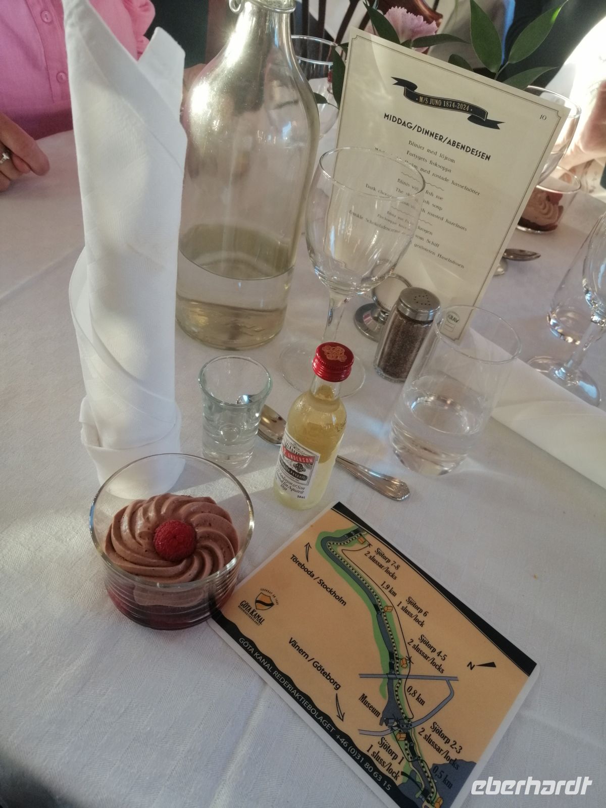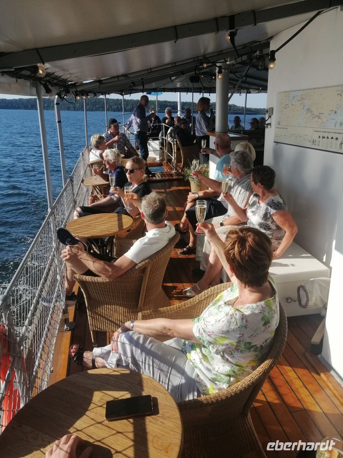 Nach dem Frühstück an Bord spazierten einige Reisegäste von Hajstorp nach Godhögen. Währenddessen passierte unser Schiff bei Sjötorp acht Schleusen und wartete auf uns im Hafen, bis wir das Kanalmuseum besuchten. Dort schauten wir uns historische Bilder von Sjötorp und die Innenausstattung alter Kanalschiffe an und lernten viel über die spannende Geschichte des Göta-Kanals. Sjötorp gilt nicht nur als die kleinste Hafenstadt Schwedens, sondern auch als das Tor zum Vänernsee, wo unsere Reise weiterging. Der Vänernsee ist Schwedens größter See und der drittgrößte See Europas, nach dem Ladoga- und dem Onegasee in Russland. Hier gibt es über 22.000 Inseln, Schären und Felsen. Am Nachmittag erreichten wir die Halbinsel Kållandsö, auf der sich das Schloss Läckö befindet, das bereits 1298 als Bischofssitz angelegt wurde. Seine Blütezeit erlebte es im 17. Jahrhundert, als Magnus Gabriel de la Gardie es übernahm und im barocken Stil umgestaltete. Im Rahmen einer Führung erkundeten wir das Schloss Läckö und die Sonderausstellungen. Da heute unser letzter gemeinsamer Abend war, organisierte die Mannschaft ein Kapitänsdinner mit Sektempfang. Kapitän Albert persönlich überreichte jedem Gast eine Urkunde zur Erinnerung an die Überquerung des Göta-Kanals – ein toller Abschluss unserer Reise!Am späteren Abend erreichten wir schließlich Vänersborg, unseren Nachthafen.