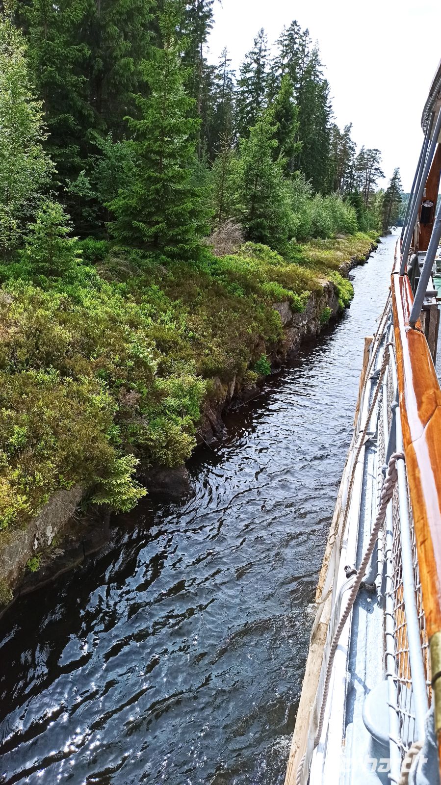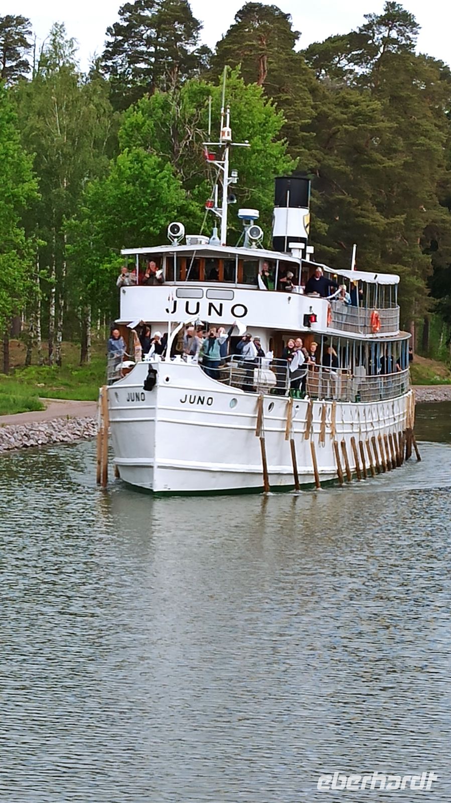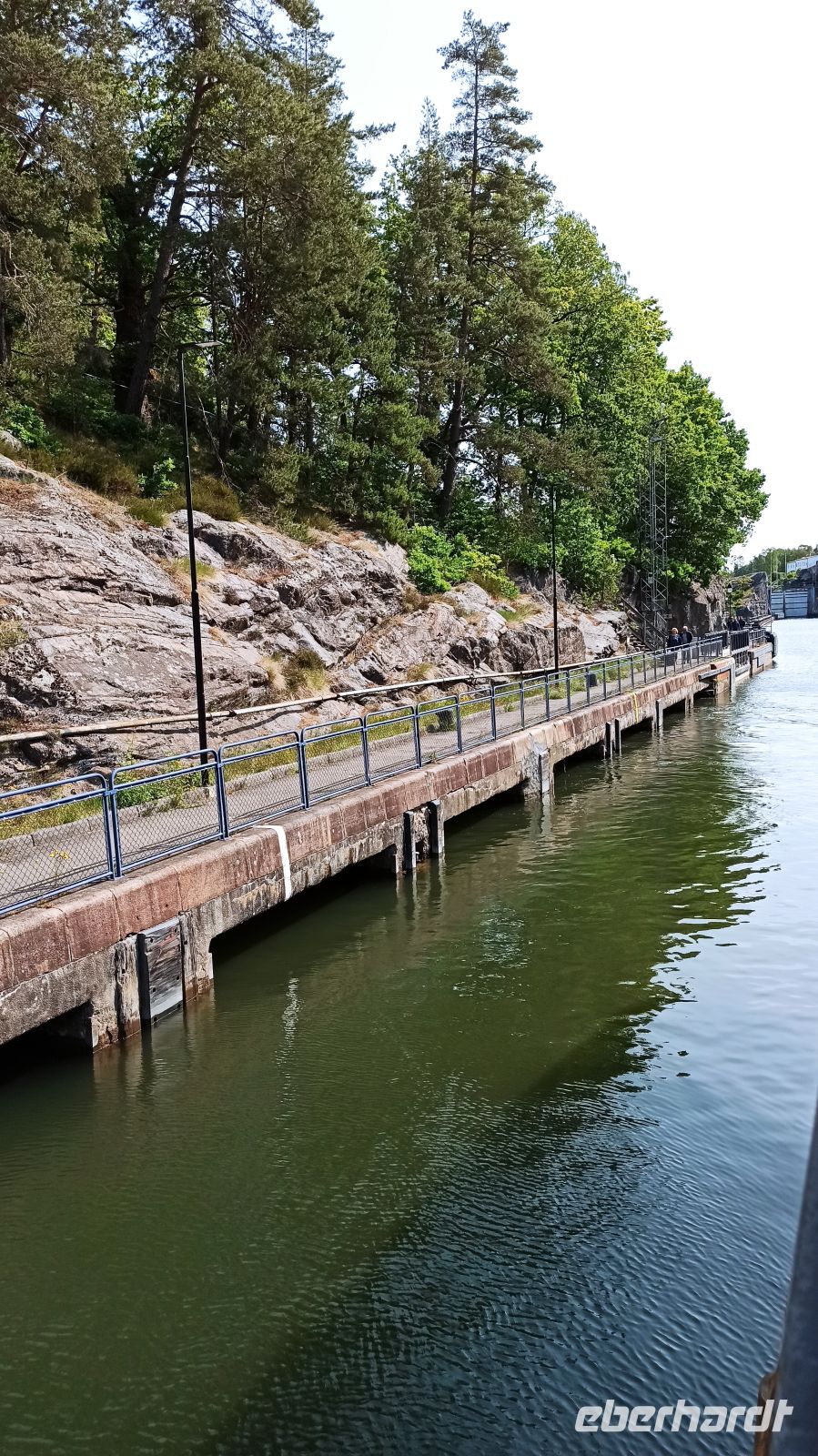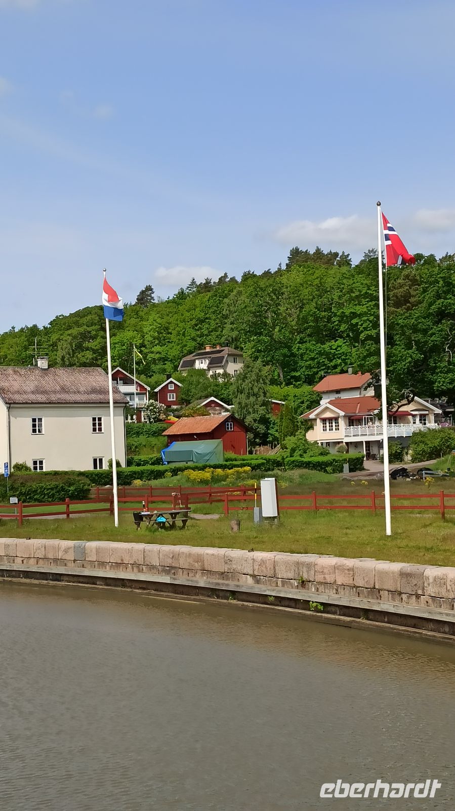 Am Morgen verlassen wir Motala, sind aber nicht auf dem Vättern-See, dem zweitgrößten See Schwedens unterwegs, denn der Wind wird zu stark sein, sagt der Wetterbericht. So kommt ein Bus, der uns zum Vormittagsprogramm nach Vadstena bringt, anschließend zurück zum Schiff, das inzwischen ohne Passagiere über den See fährt. So erreichen wir per Bus und über Land den Ort Vadstena, besuchen hier das Kloster, die Kirche und das Vadstena Schloss aus dem 16. Jahrhundert. Wir haben eine sehr gute Führung, bekommen alles gezeigt und erklärt. Die Zeit vergeht schnell, schon kommt der Bus, der uns nach einer guten Stunde Fahrt über Land zurück zum Schiffsanleger bringt. Unterwegs haben wir ein kleines Picknick im Bus. Anna und Magnus haben eben an alles gedacht. Es soll uns gut gehen, und das tut es! Nun sind wir wieder auf unserem Schiff, genießen das wie immer erlesene und sehr schmackhafte Mittagessen. Jetzt biegen wir wieder in den Göta-Kanal ein, und zwar in Richtung Forsvik. Hier lernen wir die älteste Schleuse des Kanals kennen. Sie wurde 1813 gebaut. Das Wetter hat sich inzwischen beruhigt. Am Ufer wartet eine Überraschung: uns begrüßt ein Chor mit christlichen Gesängen und Blumensträußen. Aber nun aufgepasst! Gleich kommen die beiden engsten Stellen des Göta-Kanals: Billströmmen und Spetsnäskanal. Auf unseren Kapitän und überhaupt die gesamte Crew können wir stolz sein. Sie verstehen ihr Handwerk, haben ganz viel Erfahrung! Voller Respekt schauen wir ihnen wieder und wieder gern zu. Jetzt haben wir aber wieder freie Fahrt. Es geht über den Viken-See nach Tatorp, wo sich eine der beiden noch erhaltenen handbetriebenen Schleusen des Göta-Kanals befindet. Hier erreichen wir auch den höchsten Punkt des gegrabenen Kanals: ganze 91,5 m über NN. Ein Obelisk markiert die entsprechende Stelle auf einer kleinen Landzunge. Über Töreboda kommen wir dann nach Hajstorp, unserem heutigen Liegeplatz für die Nacht. Am Anleger findet ein richtiges kleines Konzert statt. Die Bewohner des Ortes genießen das Wochenende mit Musik.