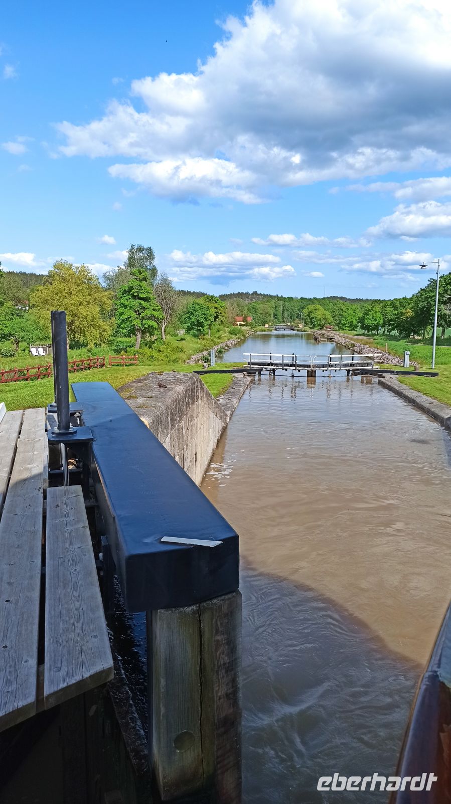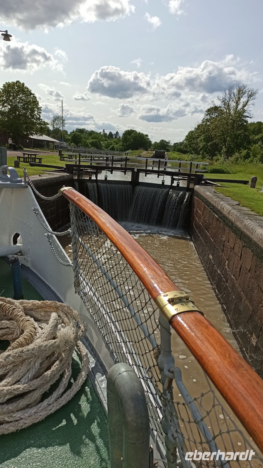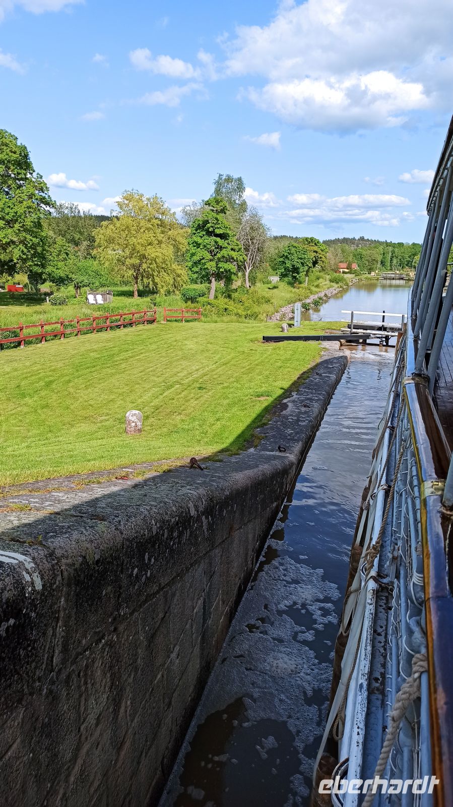 Nach dem Frühstück besuchen wir die Schlossruine Stegeborg. Anna begleitet uns und erklärt uns die Geschichte. Unser Schiff gleitet pünktlich weiter und passiert bei Mem die erste der 58 Göta-Kanal-Schleusen. Nun beginnt die eigentliche Fahrt auf dem Göta-Kanal! Es gibt immer genug zu sehen. Aber was gibt es eigentlich zur Entstehungsgeschichte des Göta-Kanals zu sagen? Von 1810 bis 1832 dauerte der Bau des schiffbaren Weges vom Kattegat zur Ostsee. Der eigentliche Grund für den Kanalbau war, dass die schwedischen Schiffe den Sundzoll an Dänemark umgehen wollten. Im Jahre 1832 wurde in Mem und in Gegenwart von König Karl XIV der Kanal feierlich eingeweiht. Unser nächstes Ziel ist Söderköping, zu Zeiten der Hanse ein ziemlich bedeutender Ort. Hier ist für uns wieder Zeit für einen Spaziergang. Wir schlendern durch diese schmucke Kleinstadt, und natürlich ist auch Zeit für das berühmte Eiscafé Smultronstället. Die Eisbecher hier sind legendär, also müssen wir probieren, wenigsten eine Kugel, denn wir sind ja gerade erst vom Mittagessen auf dem Schiff aufgestanden. Weiter fährt unser Schiff in Richtung der Seen Asplangen und Roxen und passiert dabei 9 Schleusen bis es schließlich an der berühmten Schleusentreppe von Berg vor Anker geht. Wir sind gespannt! An das gute Leben an Bord haben wir uns übrigens schnell gewöhnt, genießen die wunderbaren Mahlzeiten, die interessanten Führungen, vor allem aber die einzigartige Natur um uns herum. Und beim Wettergott wollen wir uns ausdrücklich bedanken. Er meint es bis jetzt sehr gut mit uns. Das soll natürlich gern so bleiben, hoffen wir.