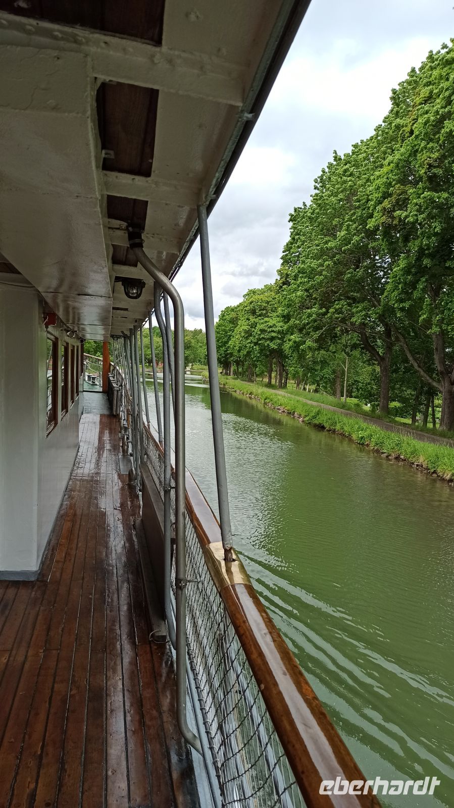 Gleich am Morgen passieren wir die berühmte Schleusentreppe von Berg. Diese ist mit ihren 7 miteinander verbundenen Schleusen die längste Schleusentreppe des Göta-Kanals. Sie hebt das Schiff um 18,8 Meter. Aber zuvor, beim Frühstück singen Kapitän und Crew für uns die schwedische Nationalhymne, denn heute ist der schwedische Nationalfeiertag, und das Restaurant ist mit Girlanden und Bändern liebevoll geschmückt. Mittags gibt es Hering mit verschiedenen Beilagen als Vorspeise, dazu einen Schnaps, alles für diesen Tag mit Bedacht ausgewählt. Wieder gibt es Gesang von der Crew, dieses Mal ein sehr bekanntes schwedisches Trinklied. Und wir haben dabei natürlich auch ein Schnäpschen in der Hand. Wir erleben gerade mal wieder Landeskunde zum Anfassen. Während der Schleusungen in Berg kann man an Bord bleiben oder aber das spannende Geschehen vom Ufer aus beobachten. Man kann sich aber auch einer kleinen Wanderung (von ca. 3 km) zum Vreta Kloster anschließen. Es gehört zu den bedeutendsten Klöstern Schwedens und wurde schon im 12. Jahrhundert erstmals erwähnt. Etwas schwül ist es inzwischen geworden. Auch die Mücken wagen sich erstmals an uns heran. Am Nachmittag setzt Regen ein. Der soll aber nicht lange anhalten, sagt jedenfalls unsere Wetter-App voraus. Nun kommen nacheinander zwei Aquädukte: der Ljungsbro Aquädukt und der Kungs Norrby Aquädukt. Der Göta-Kanal überquert hier Straßen. Wir fahren über den Boren-See, und dann kommt schon die Schleusentreppe von Borenshult. Mit 5 zusammenhängenden Schleusen ist sie die zweitgrößte Treppe des Kanals. Am Abend erreichen wir die Stadt Motala. Sie gilt als Hauptstadt des Göta-Kanals. Hier können wir das Motala Motorenmuseum mit seiner reichen Sammlung von Motorrädern, Autos und einer ganzen Reihe anderer Dinge aus früheren Zeiten besichtigen. Das weckt viele Erinnerungen. Unterwegs sehen wir das Grab von Baltzar von Platen, dem Initiator des Göta-Kanals. Und hier in Motala ist auch unser Ankerplatz für diese Nacht. Das Wetter von morgen kündigt sich allmählich an, der Wind frischt auf, es wird deutlich kühler. Nach einem kleinen Spaziergang am Hafen kehren wir schließlich zurück zum Schiff und lassen den Tag ausklingen. Übrigens, unterwegs kommen wir immer wieder an Stellen vorbei, wo wir Straßen kreuzen, die wegen unserer Schiffsdurchfahrt geöffnet sind. Die Autos warten einstweilen an einer Ampel bzw. an einem Schlagbaum. Heute am Nachmittag kam Regen auf. Aber wir haben es auf dem schönen Schiff so richtig gemütlich. Wir genießen jeden Moment der herrlichen Fahrt durch die liebliche Landschaft Schwedens. Und was man noch erwähnen muss: Der Göta-Kanal ist nicht einfach nur eine gerade Wasserstraße, sondern er hat auch ganz schöne Biegungen und Kurven. Da ist besonders das Können des Kapitäns und seiner Mannschaft gefragt. Immer wieder staunen wir über das große Geschick unserer Crew. Hier sind wir wirklich gut aufgehoben.