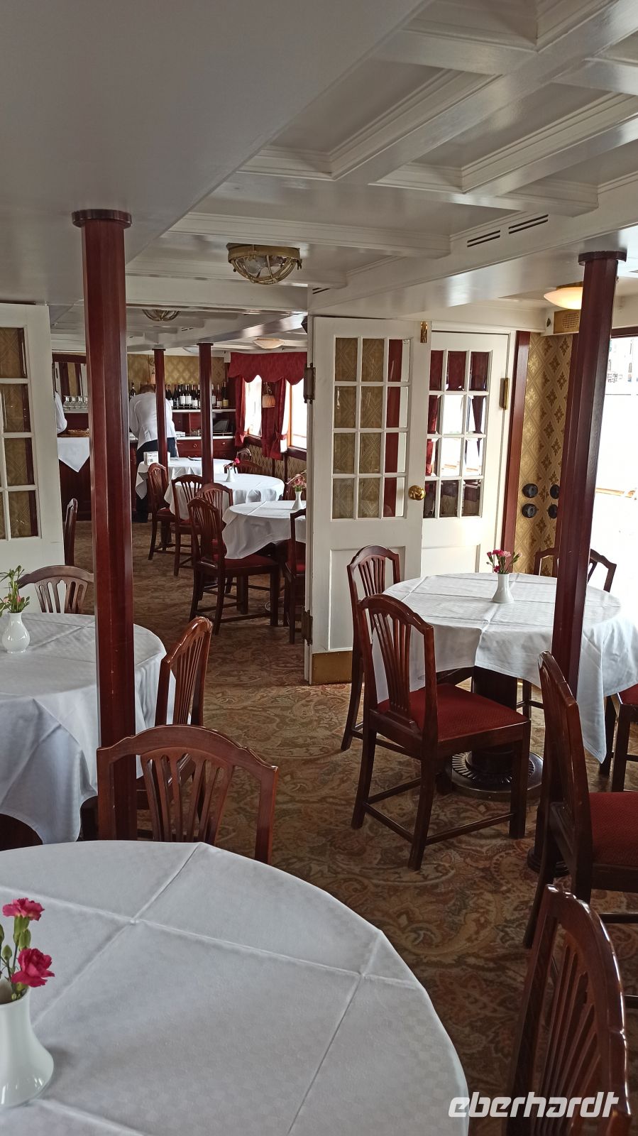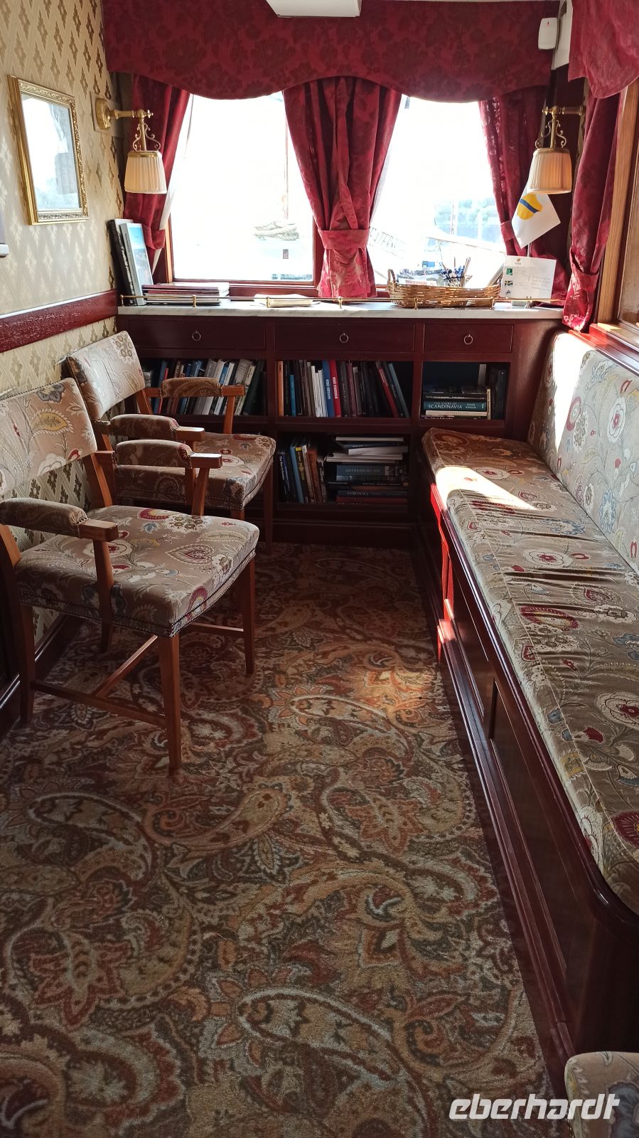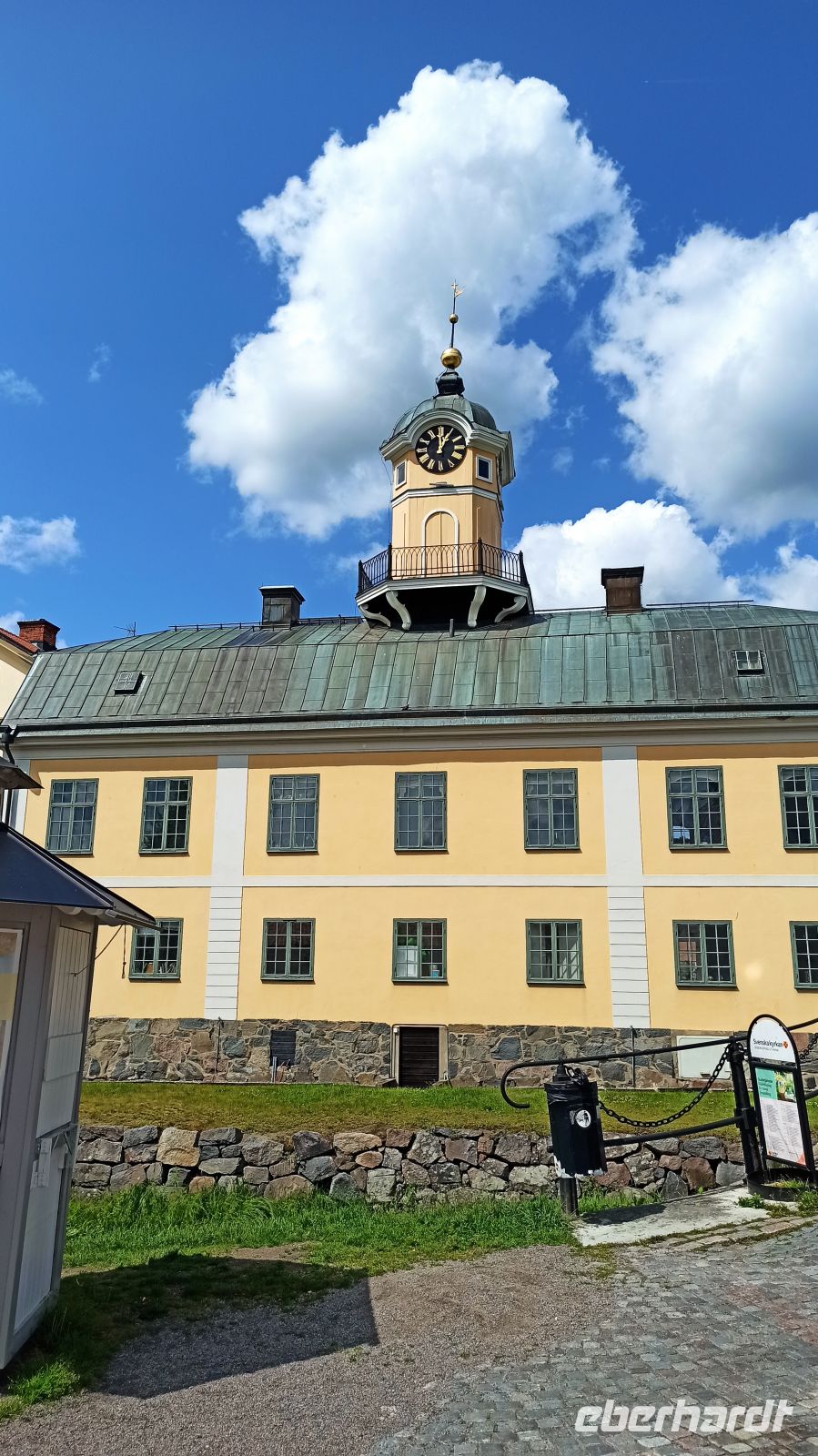 Von Hajstorp geht es jetzt nach Sjötorp, auch als Tor zum Vänern-See bezeichnet. Auf der Strecke von Hajtorp nach Godhögen (ca. 1,5 km) können wir einen kleinen Spaziergang neben dem Kanal machen, während das Schiff in der Schleuse ist. Dann besuchen wir das sehenswerte Kanal- und Schifffahrtsmuseum. Hier gibt es eine Menge Wissenswertes über die früheren Zeiten am und auf dem Göta-Kanal zu erfahren. Draußen fängt es ordentlich an zu regnen, aber Aleksandra bringt uns große Schirme. So werden wir nicht nass. Am Nachmittag erreichen wir die Halbinsel Kallandsö und legen direkt vor dem Schloss Läckö an. Hier erwarten uns örtliche Reiseleiter zu einer Schlossführung. Vor allem die Säle mit den schönen Deckenornamenten haben es uns angetan. Es gibt auch einen sehenswerten Garten beim Schloss. Pünktlich um 17.30 Uhr legt unser Schiff zur Weiterfahrt ab. Wir werden zum Kapitänsdinner geladen. Unsere Schiffs-Reiseleiterin Anna und die gesamte Crew nutzen diesen Abend, um sich von uns zu verabschieden. Der Kapitän persönlich überreicht jedem von uns die Kanalurkunde. Wir lassen uns dabei mit dem Kapitän fotografieren und haben so ein schönes Andenken an diesen Augenblick. Trotz etwas Wehmut, genießen wir einfach den letzten Abend an Bord, denken nicht so sehr an den Abschied. Unser Ankerplatz für diese Nacht ist in Vänersborg.
