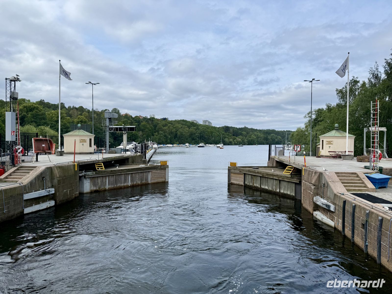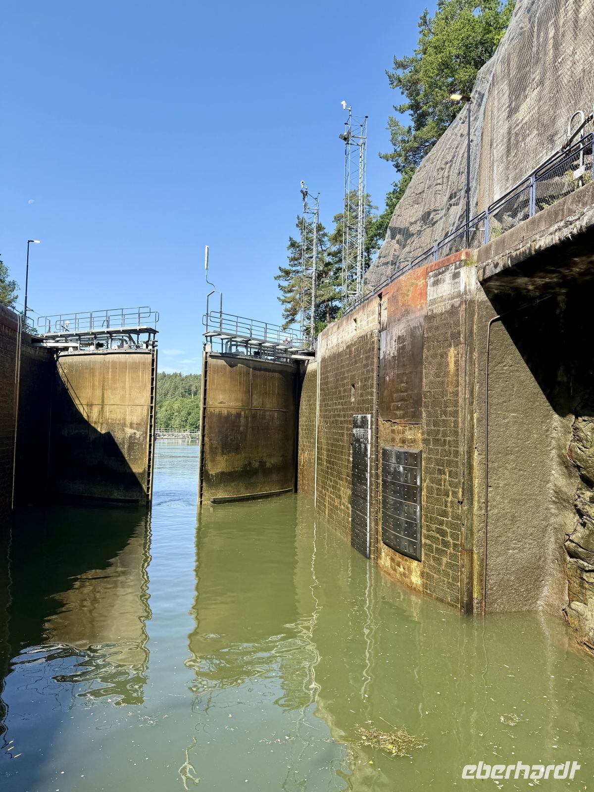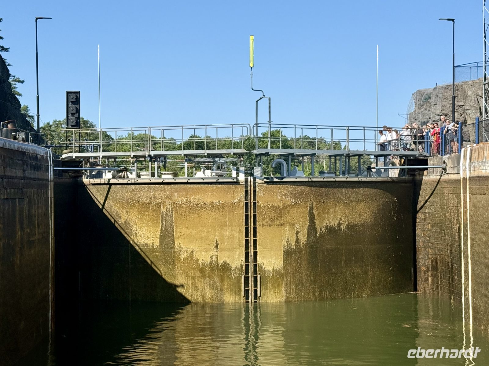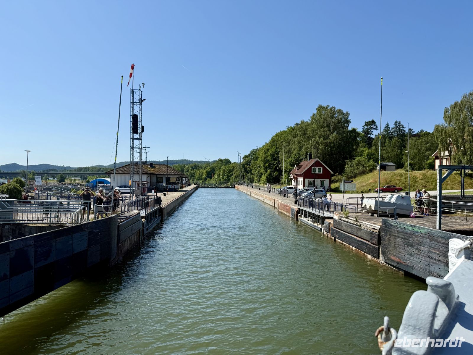 Gegen Mittag erreichten wir in Lilla Edet die letzte Schleuse unserer Reise. Diese Schleuse ist zugleich die älteste noch betriebene am Göta älv, ursprünglich im Jahr 1607 erbaut – ein bedeutender Moment für unsere Fahrt, denn damit endete auch symbolisch unsere Passage durch Schwedens historische Wasserwege.